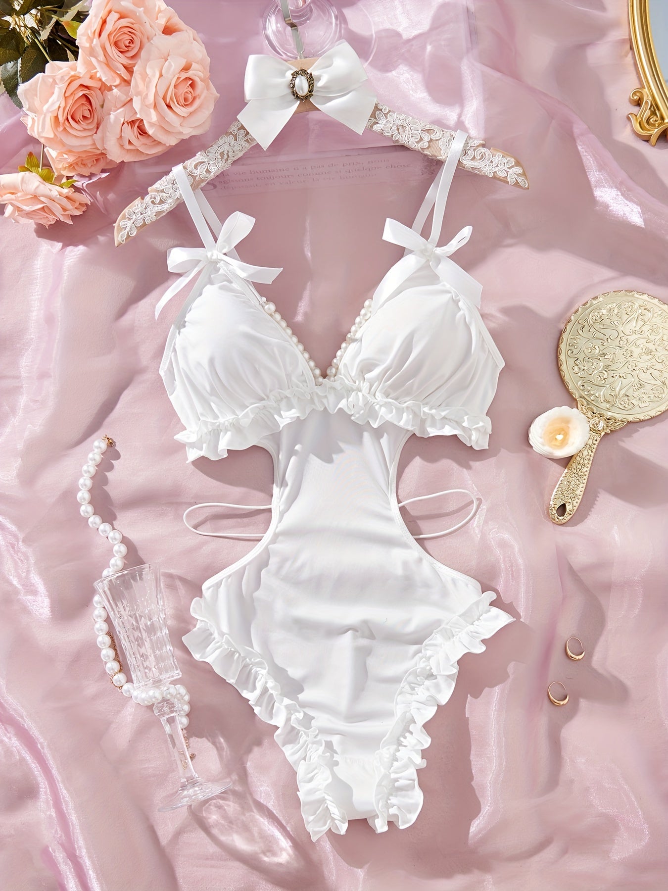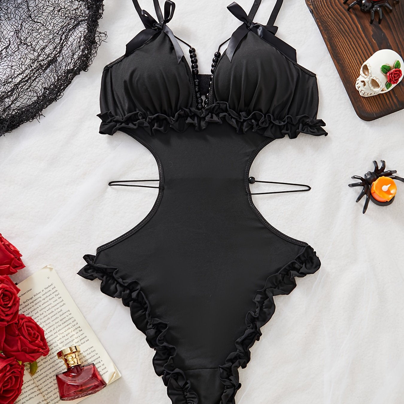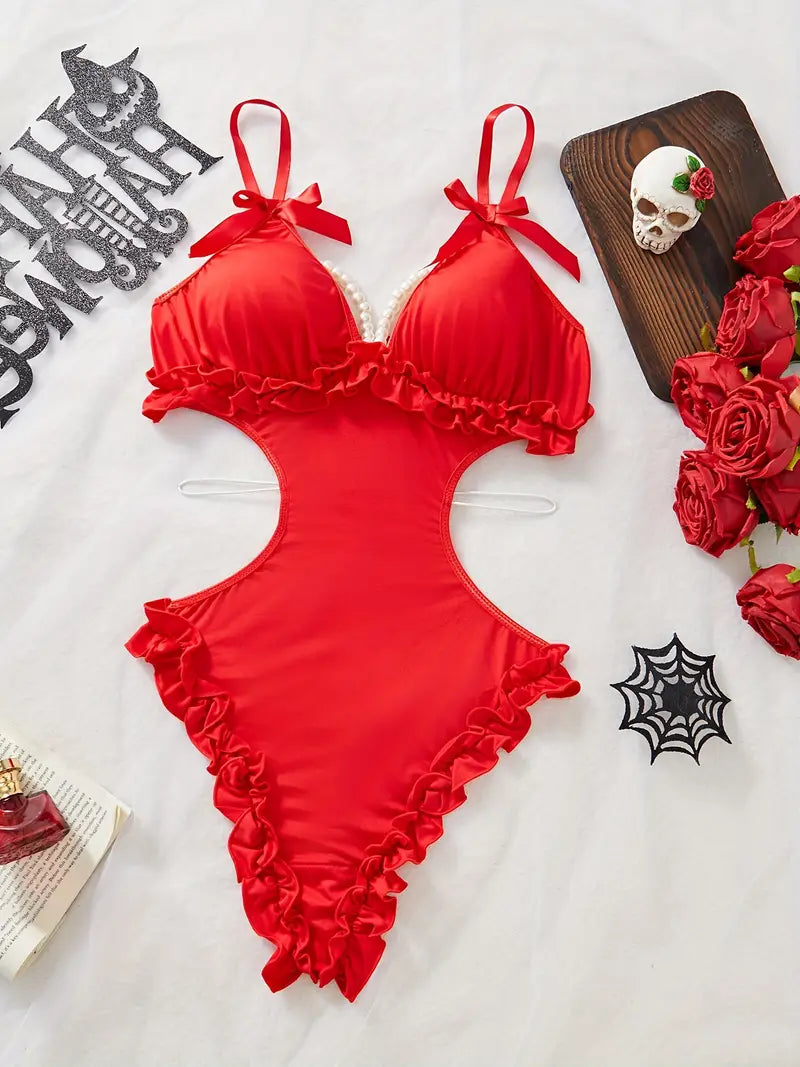 Сексуальный боди без спинки с глубоким V-образным вырезом и бантовыми плечевыми ремнями, милый дизайн.