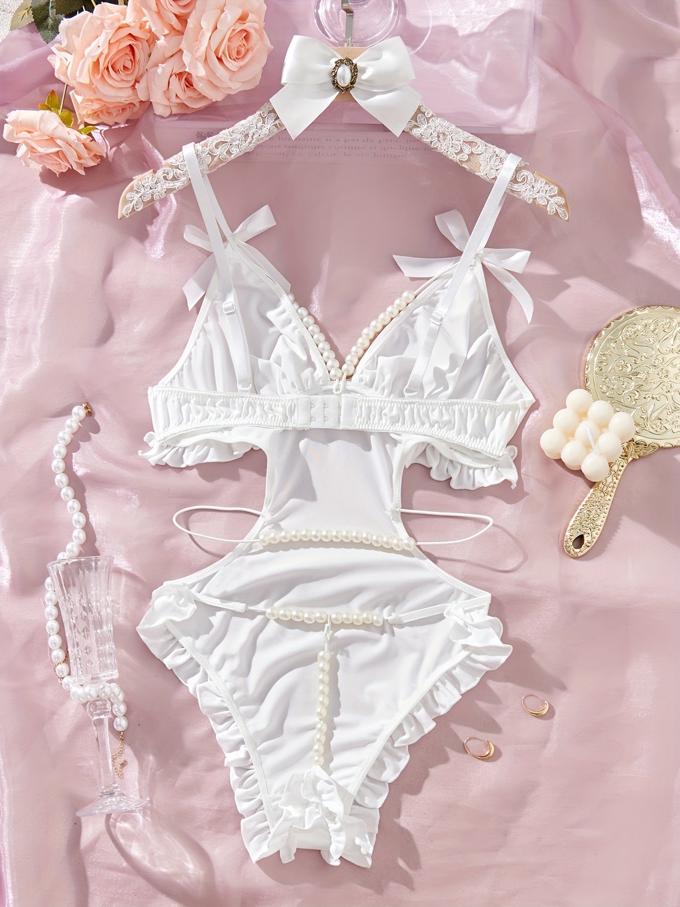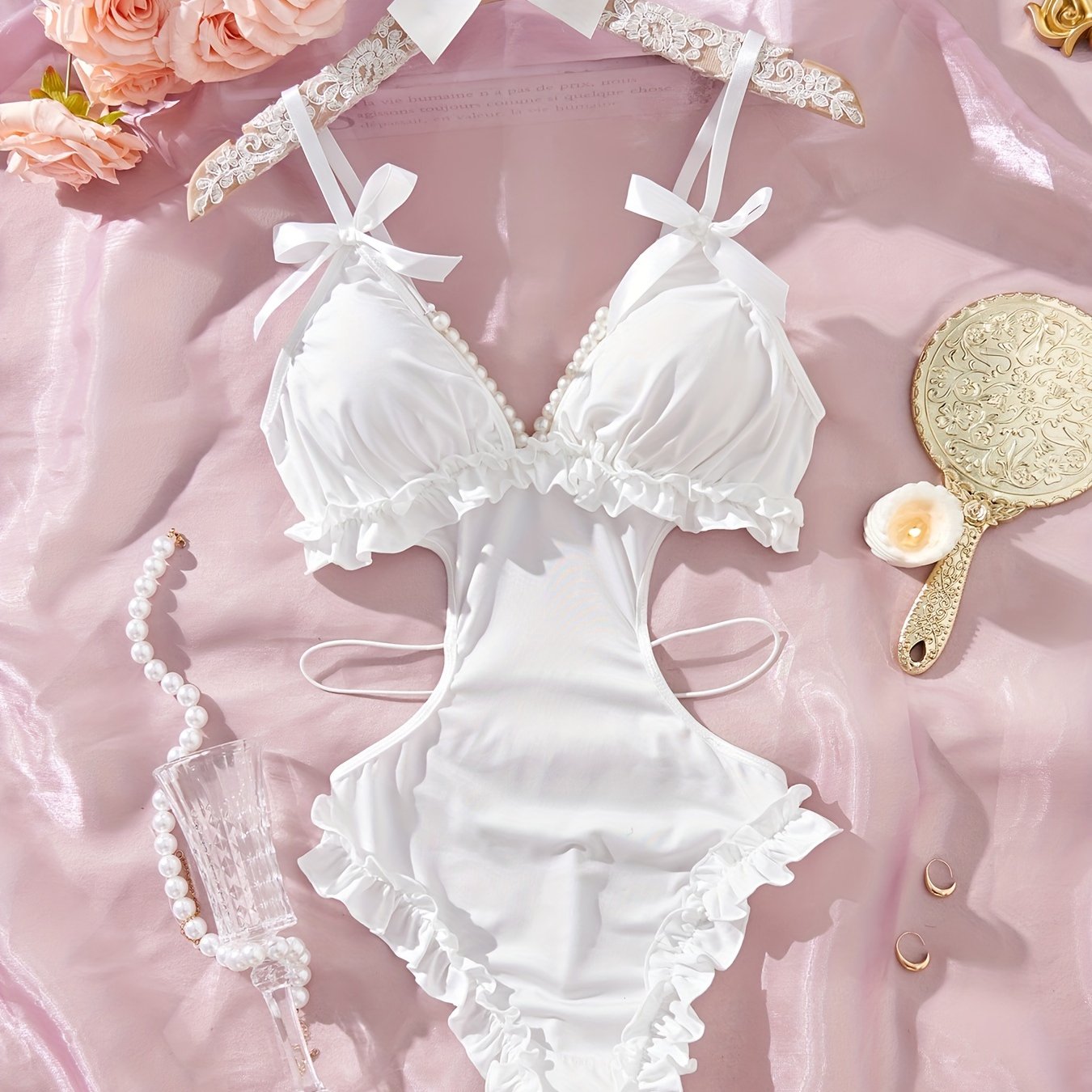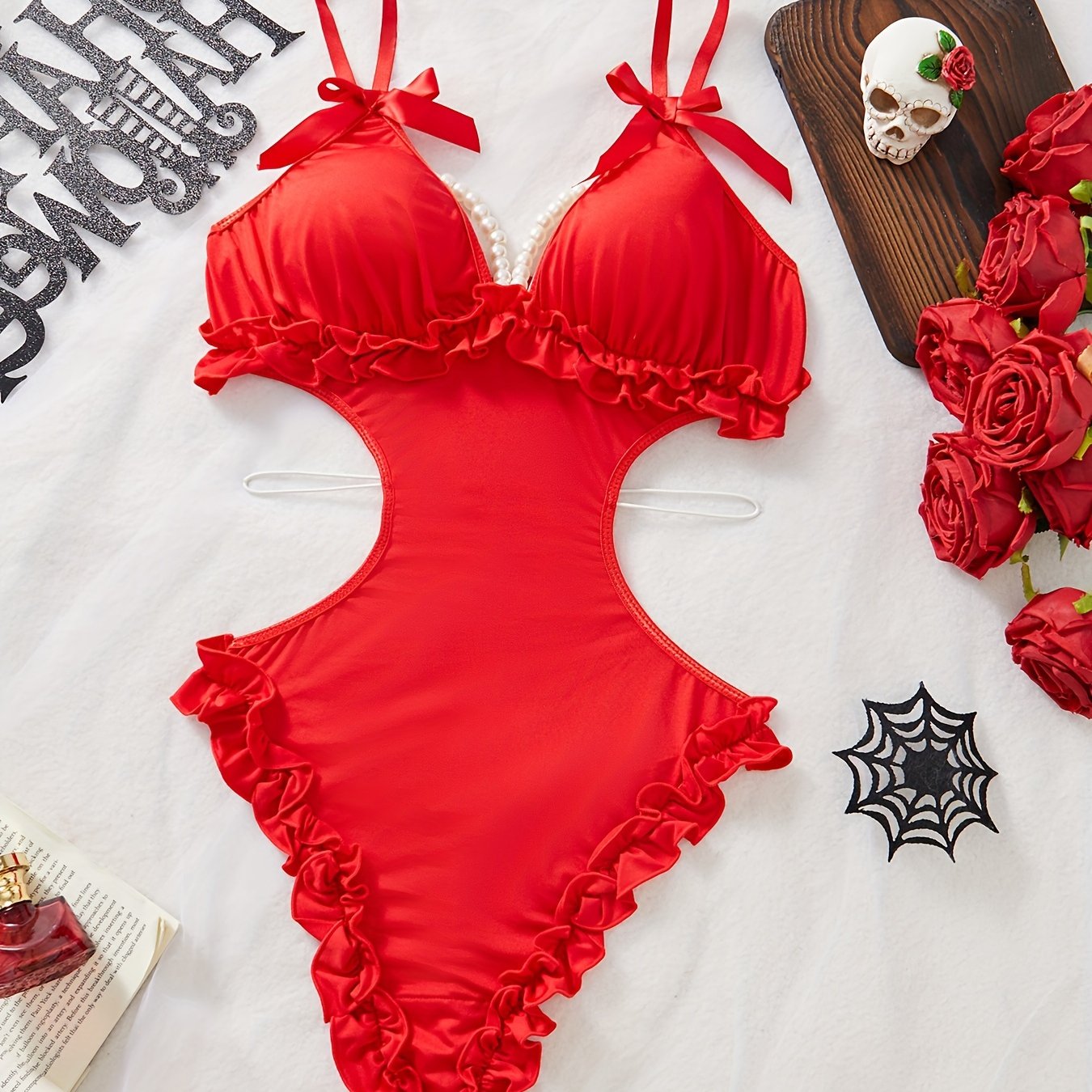 Сексуальный боди без спинки с глубоким V-образным вырезом и бантовыми плечевыми ремнями, милый дизайн.