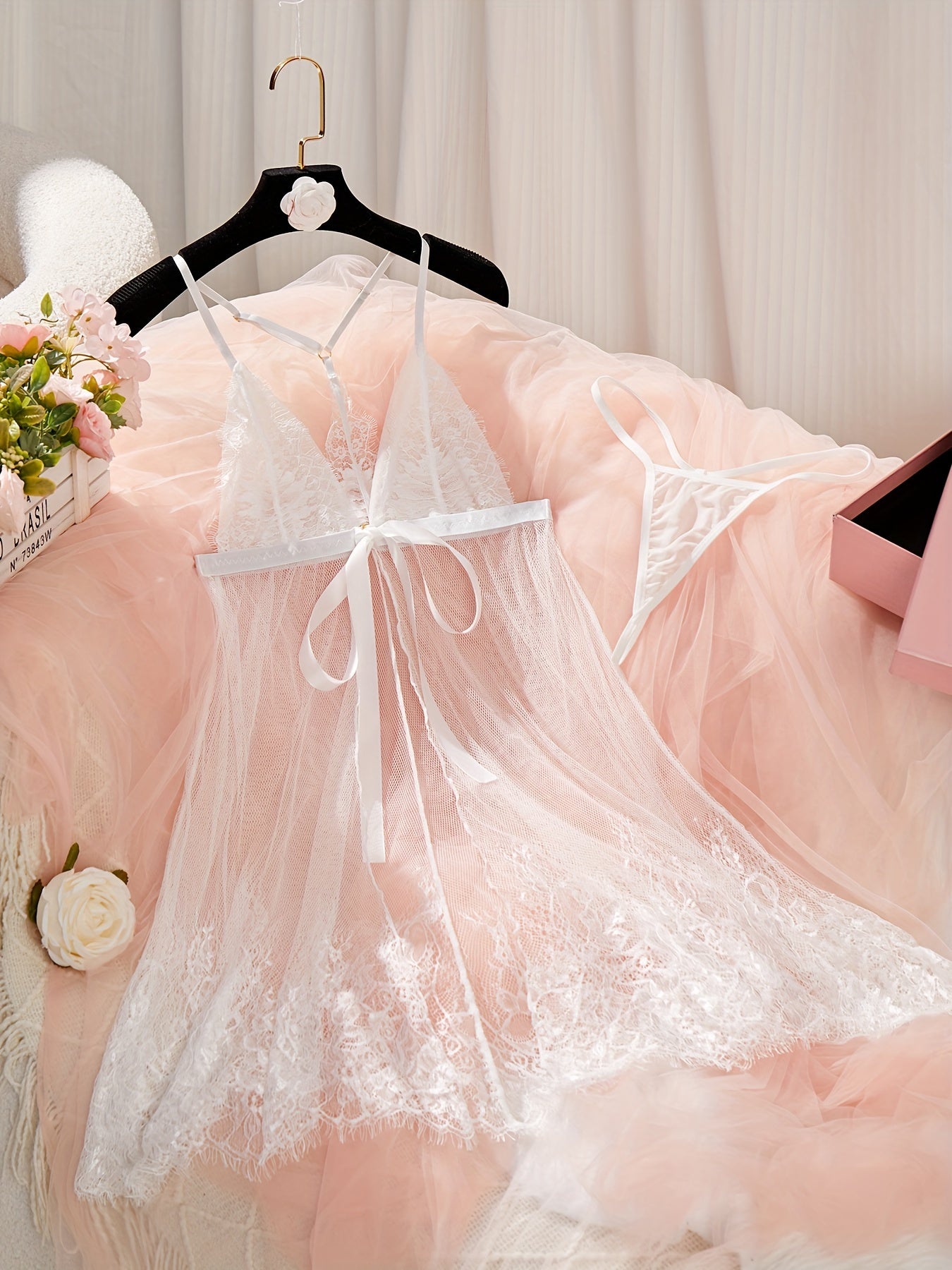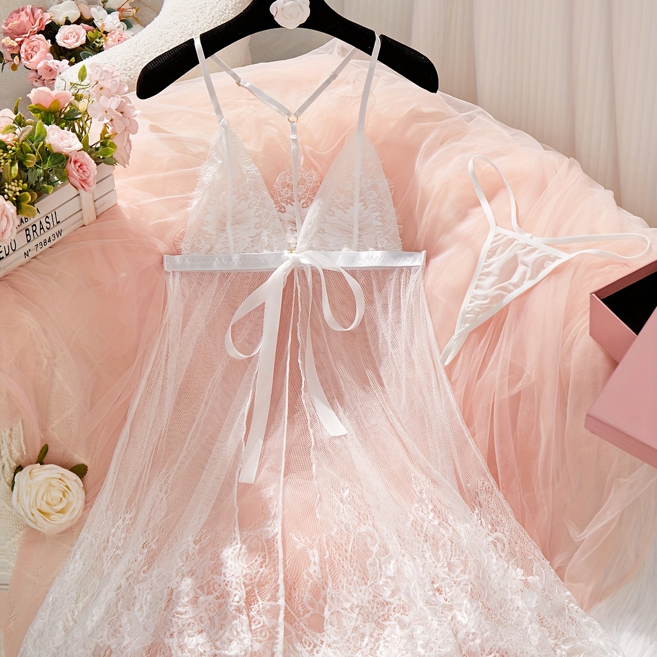 Сексуальный прозрачный кружевной комплект бабидолл с подходящими стрингами для женщин; нежная женская ночная одежда, идеально подходящая для свадебного будуара.
