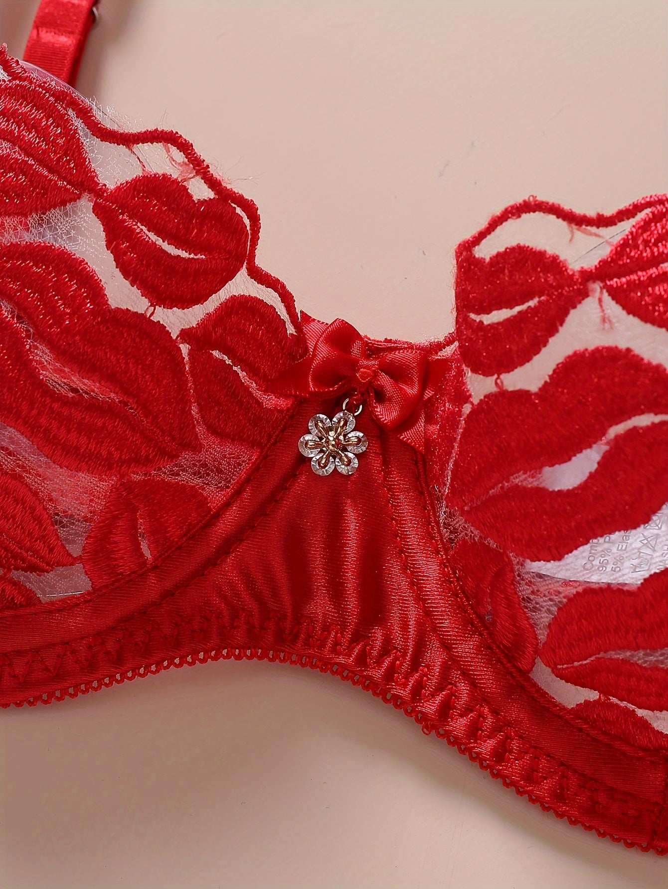 Прозрачный вышитый комплект нижнего белья для женщин включает бюстгальтер с косточками и стринги из сетчатой ткани без подкладки.