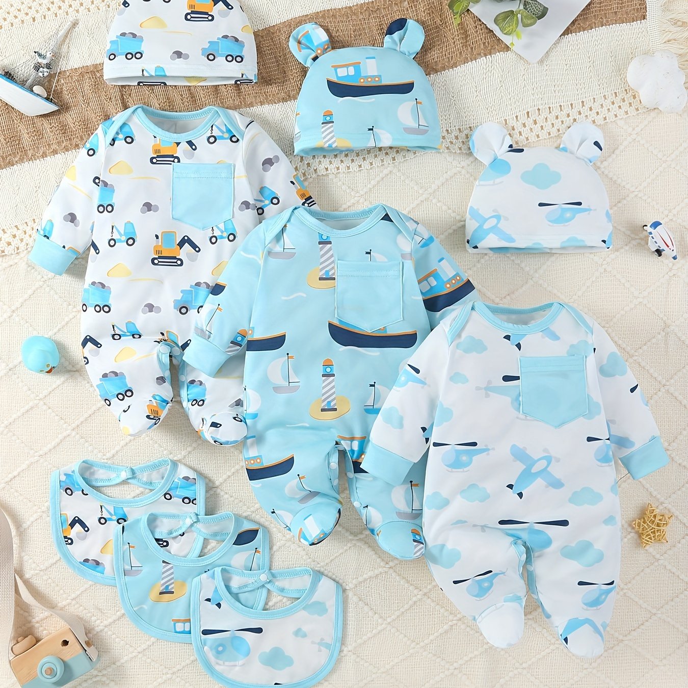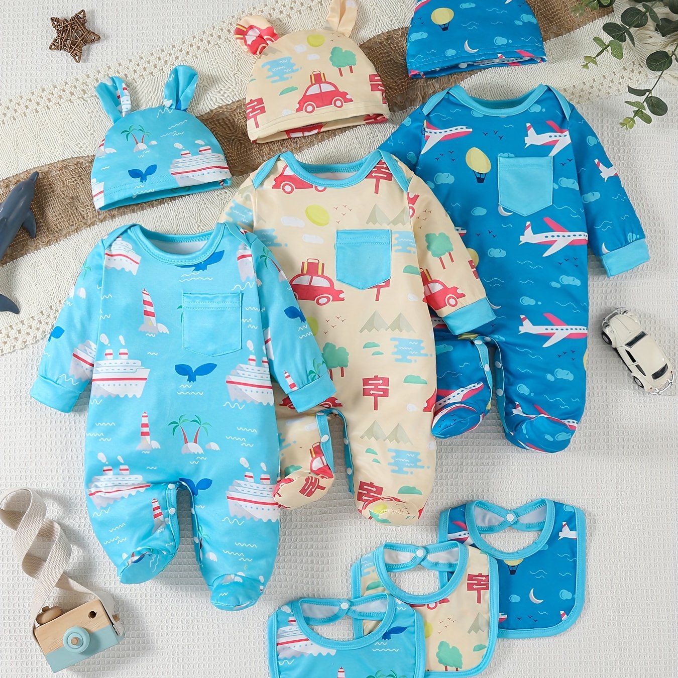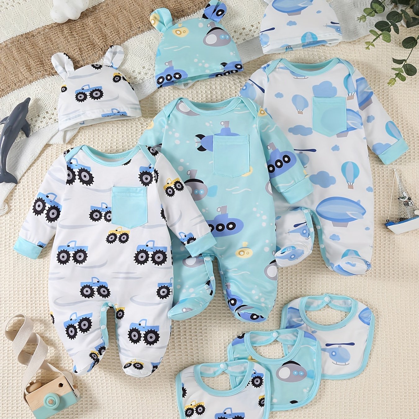 Комплект для новорожденных 9 предметов: бодик с длинным рукавом, обертка, шапка-кролик с мультяшными принтами и полотенце для слюнявки