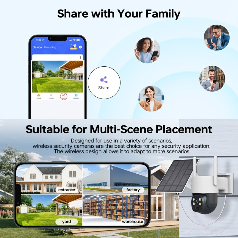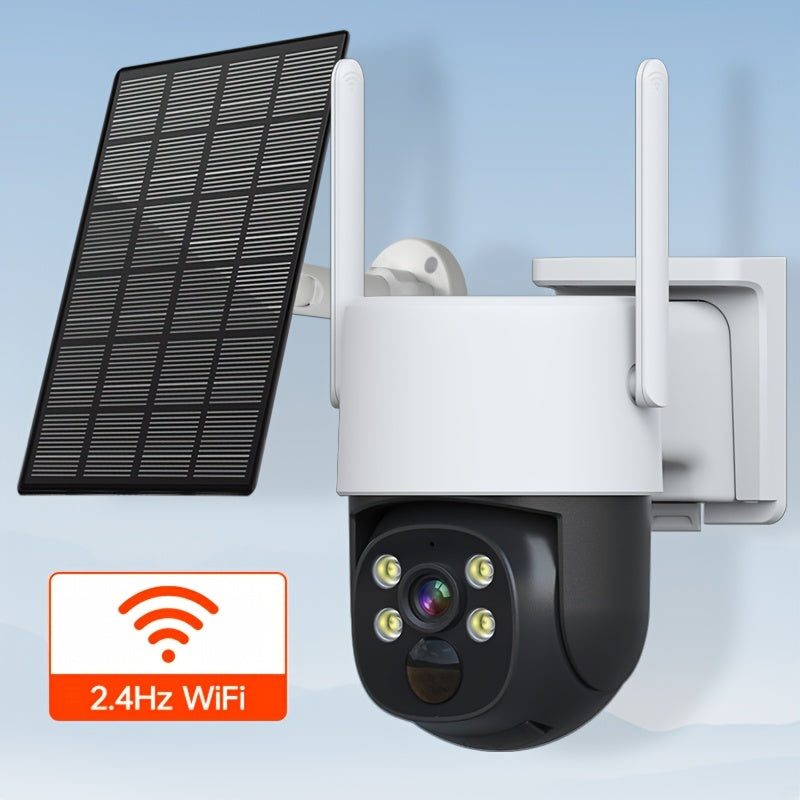 Солнечная уличная камера безопасности - 360° обзор, WiFi-соединение, цветная ночная съемка, двусторонний аудио, водонепроницаемость IP65, перезаряжаемая батарея