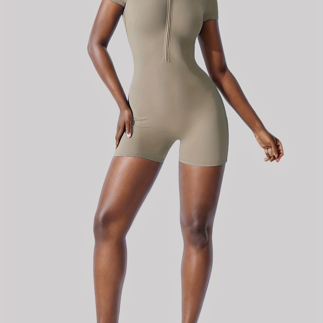Однотонный комбинезон с коротким рукавом и молнией, идеально подходящий для фитнеса и активной одежды.