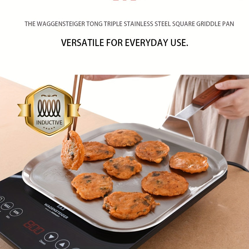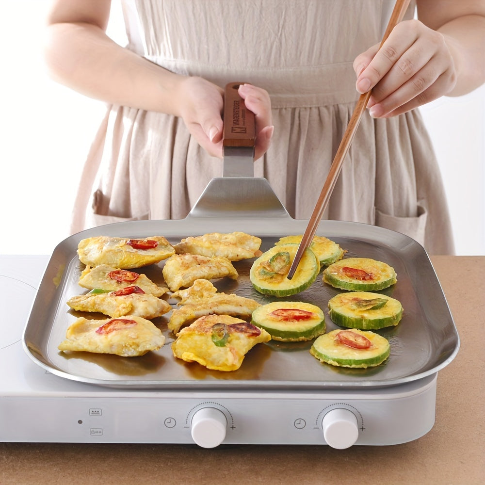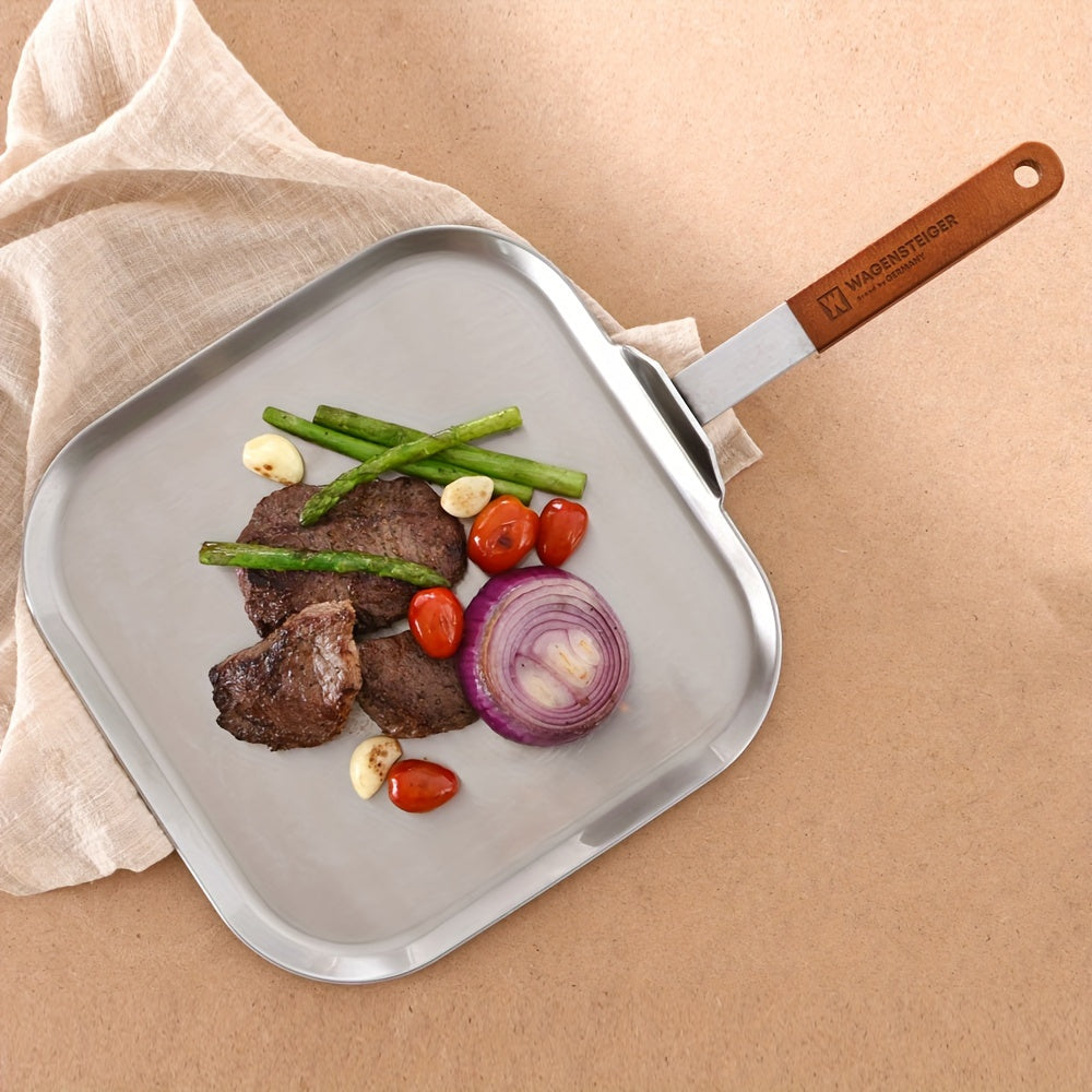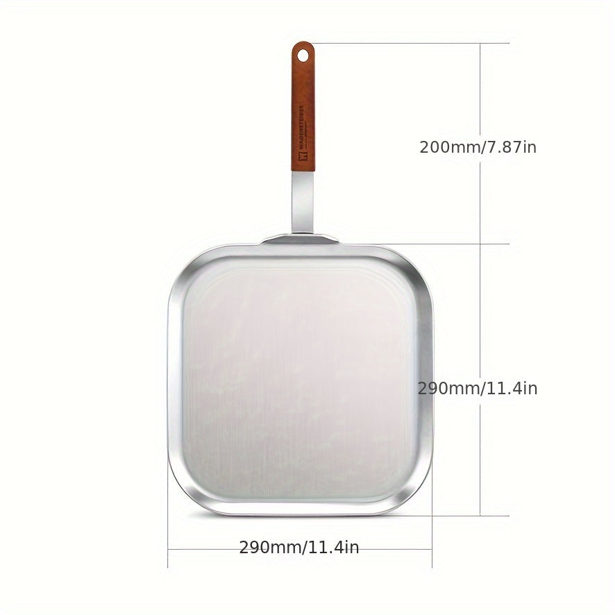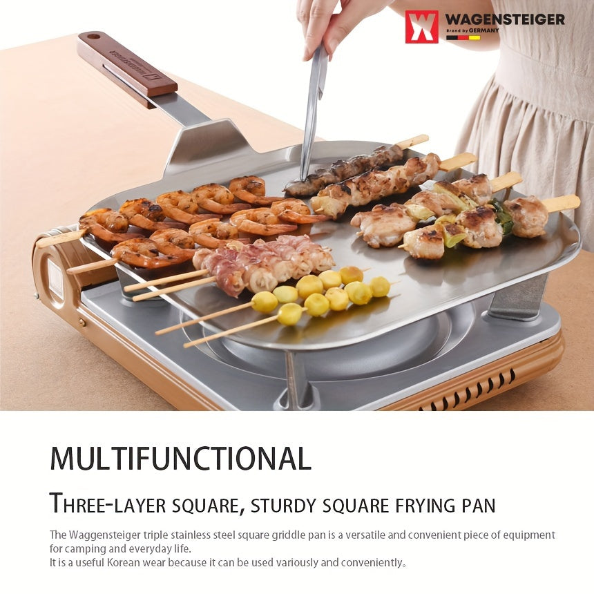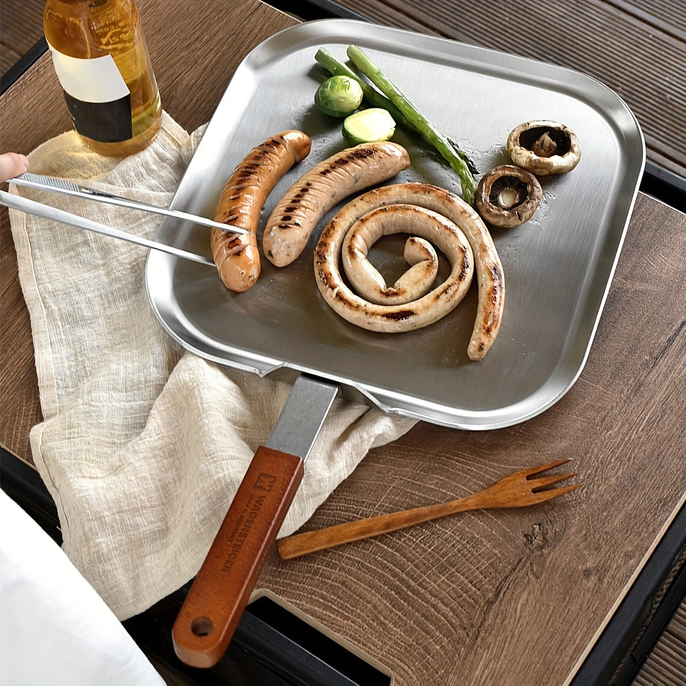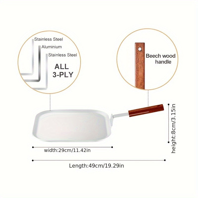 Квадратная сковорода с тройным слоем нержавеющей стали - 29*29 см, с деревянной ручкой, плоским дизайном для жарки стейков и яиц, идеальна для домашнего и уличного использования, высококачественная посуда с равномерным нагревом и долговечностью.