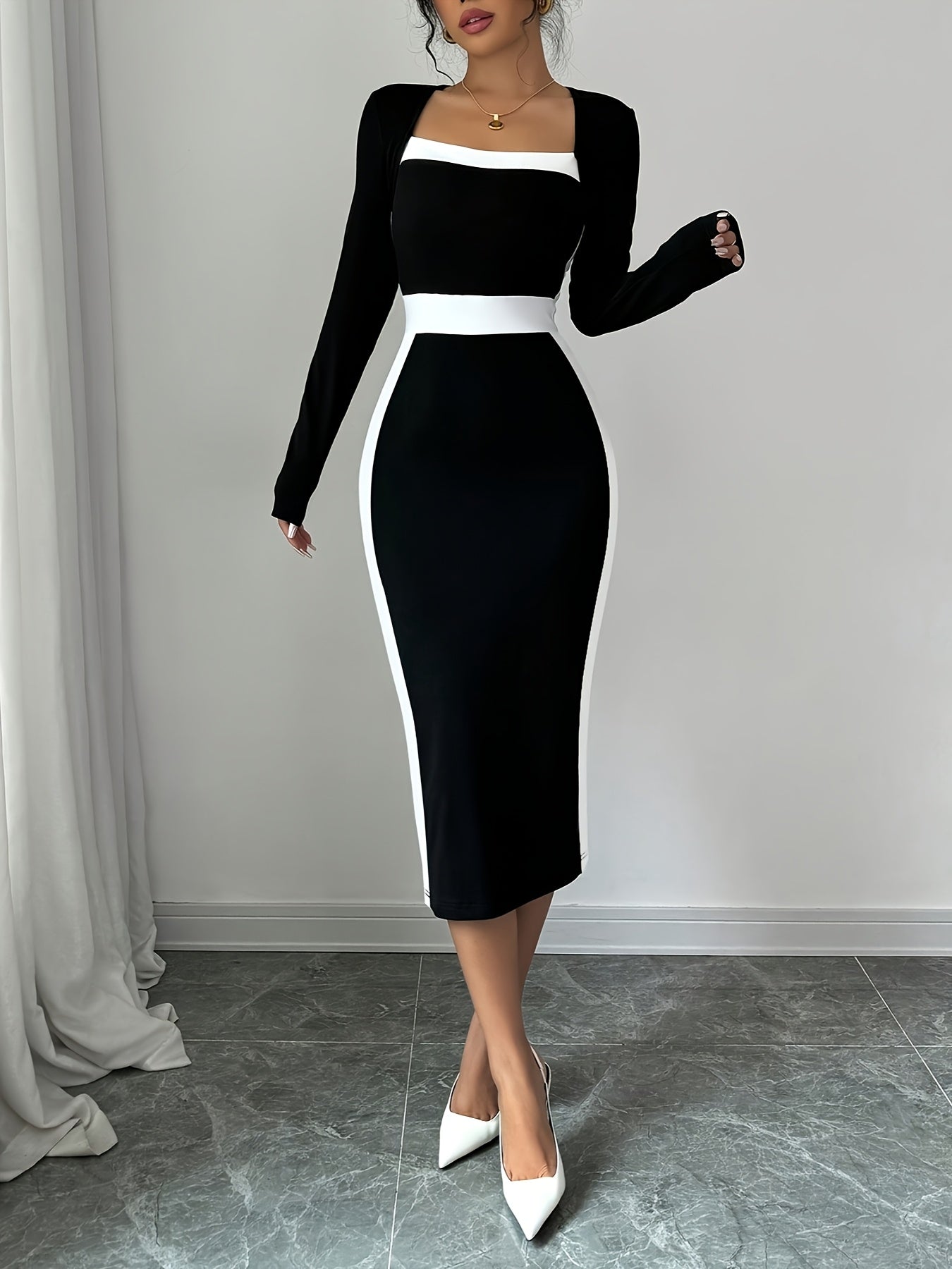 Платье с квадратным вырезом и цветным блоком для женщин, идеально подходит для весны и осени.