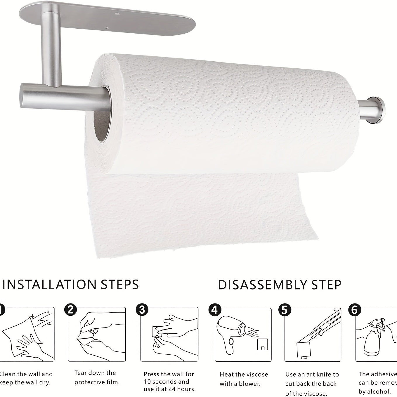 Держатель рулона салфеток из нержавеющей стали для кухни - самоклеящийся, крепление под шкафом - подходит для бумажных полотенец - в комплект входит клей и винт для безопасной установки