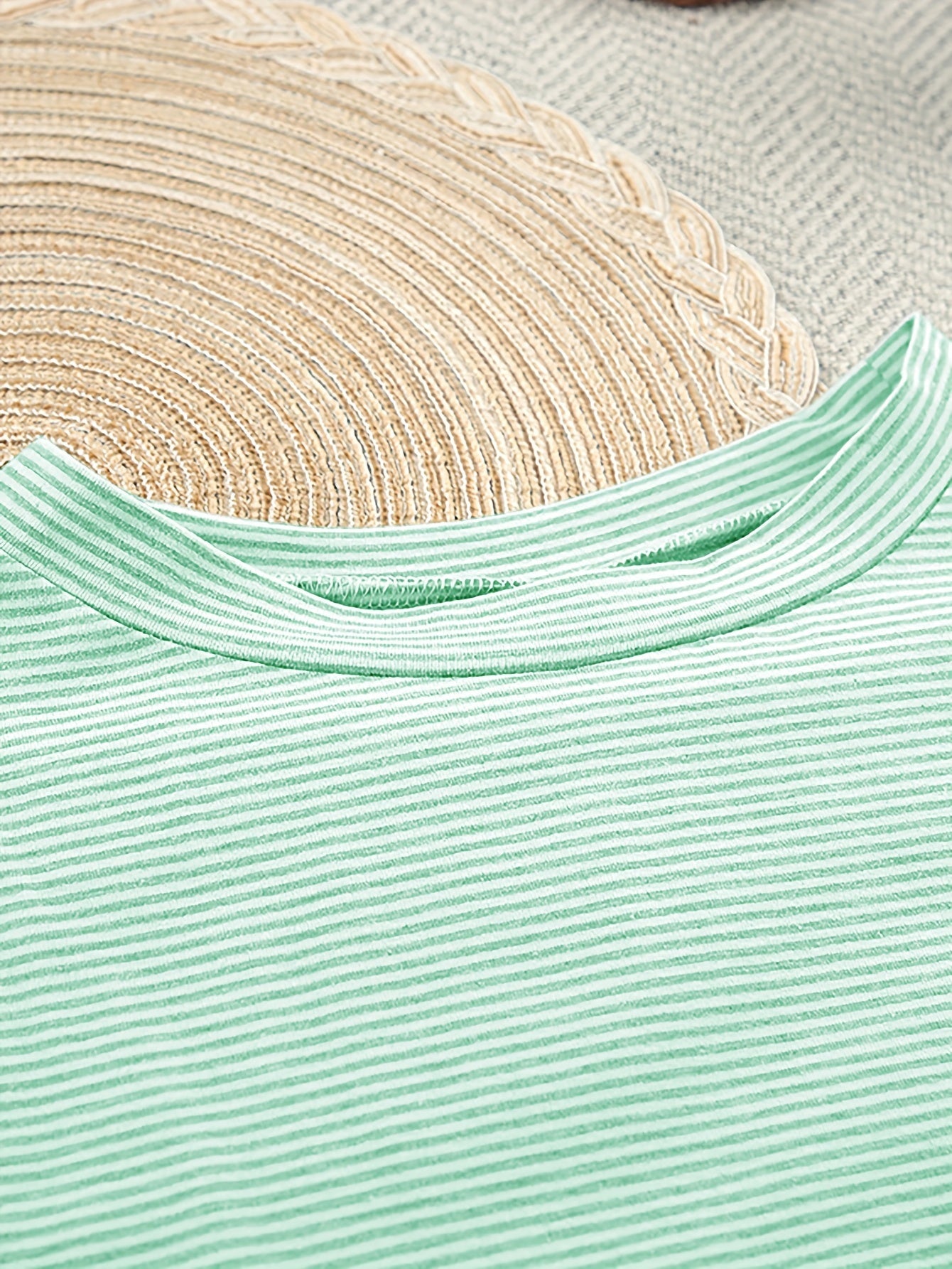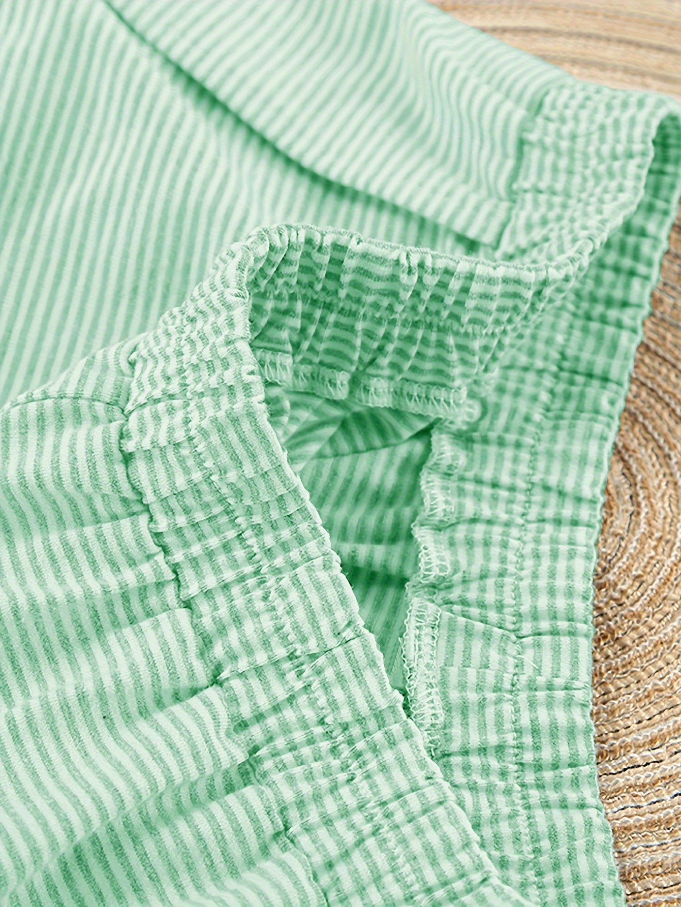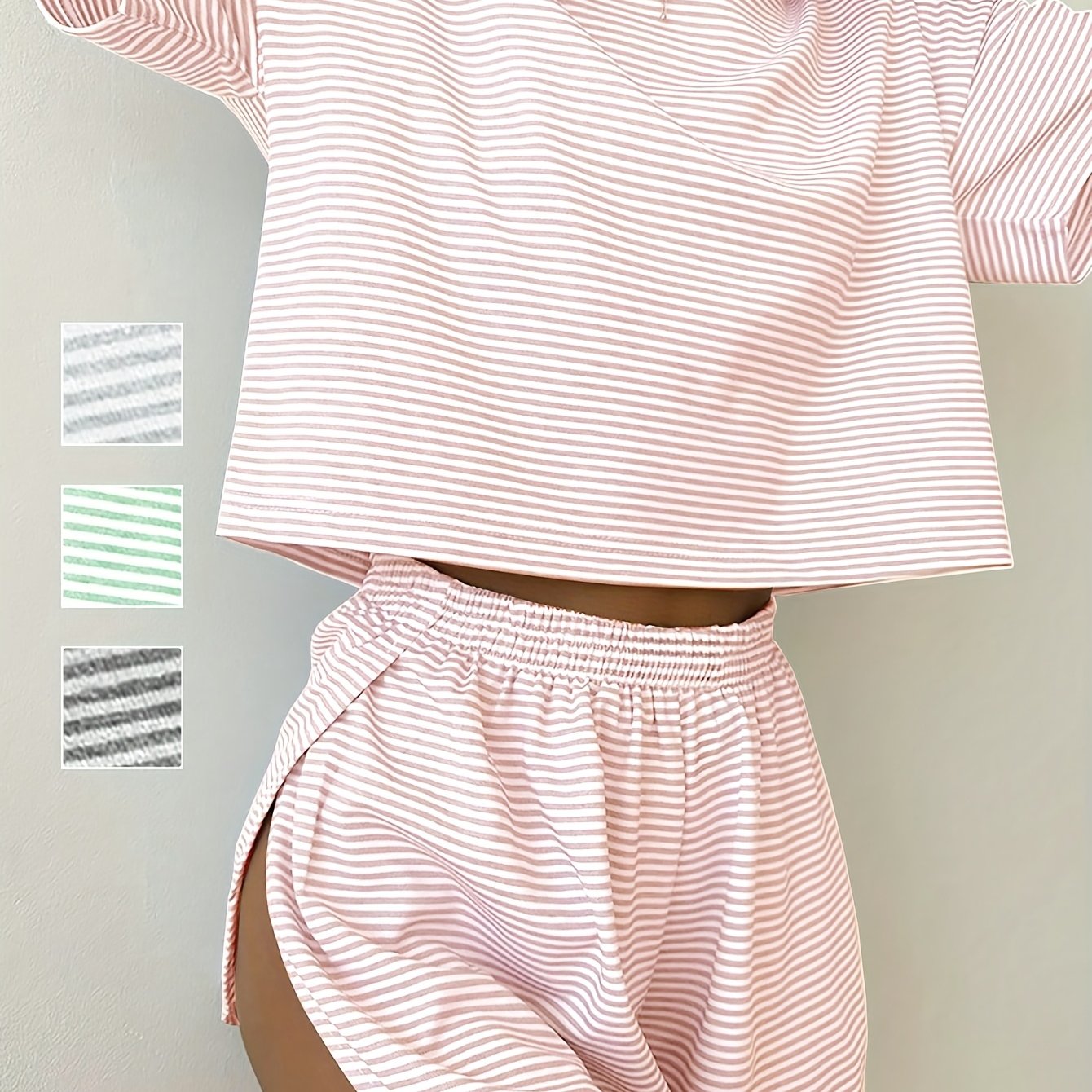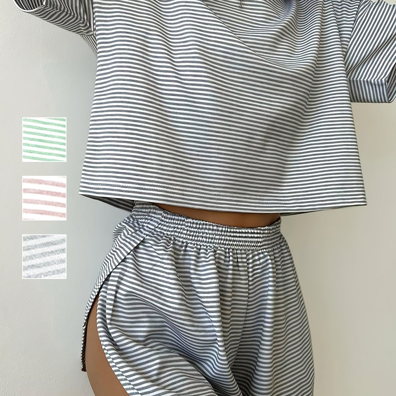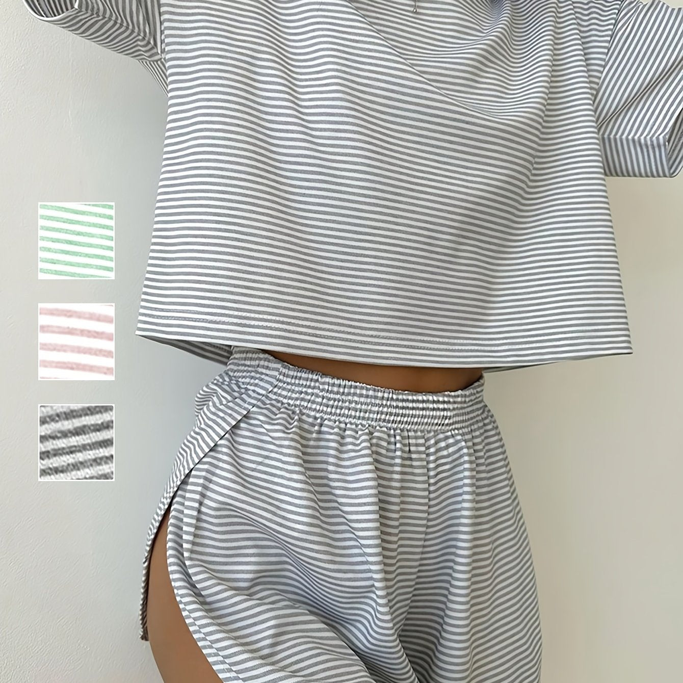 Полосатый комплект для отдыха с коротким рукавом и шортами с боковым разрезом для женской осенне-зимней одежды.