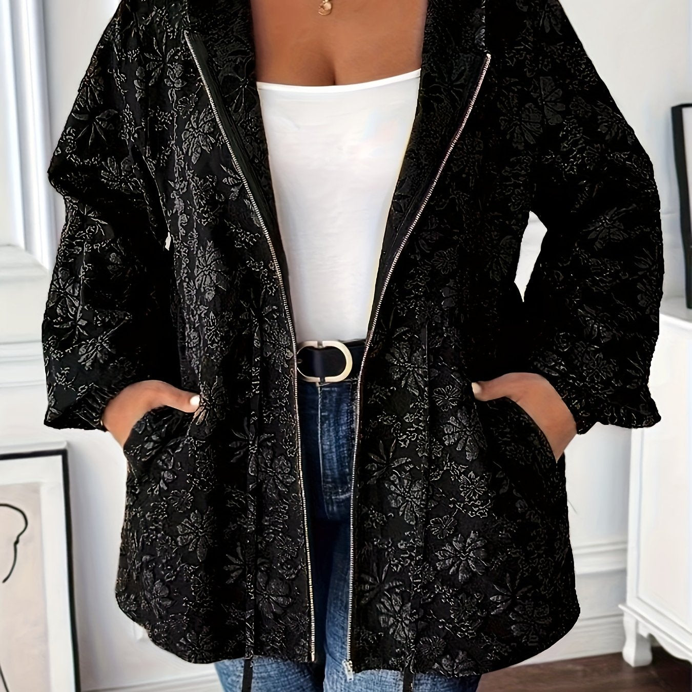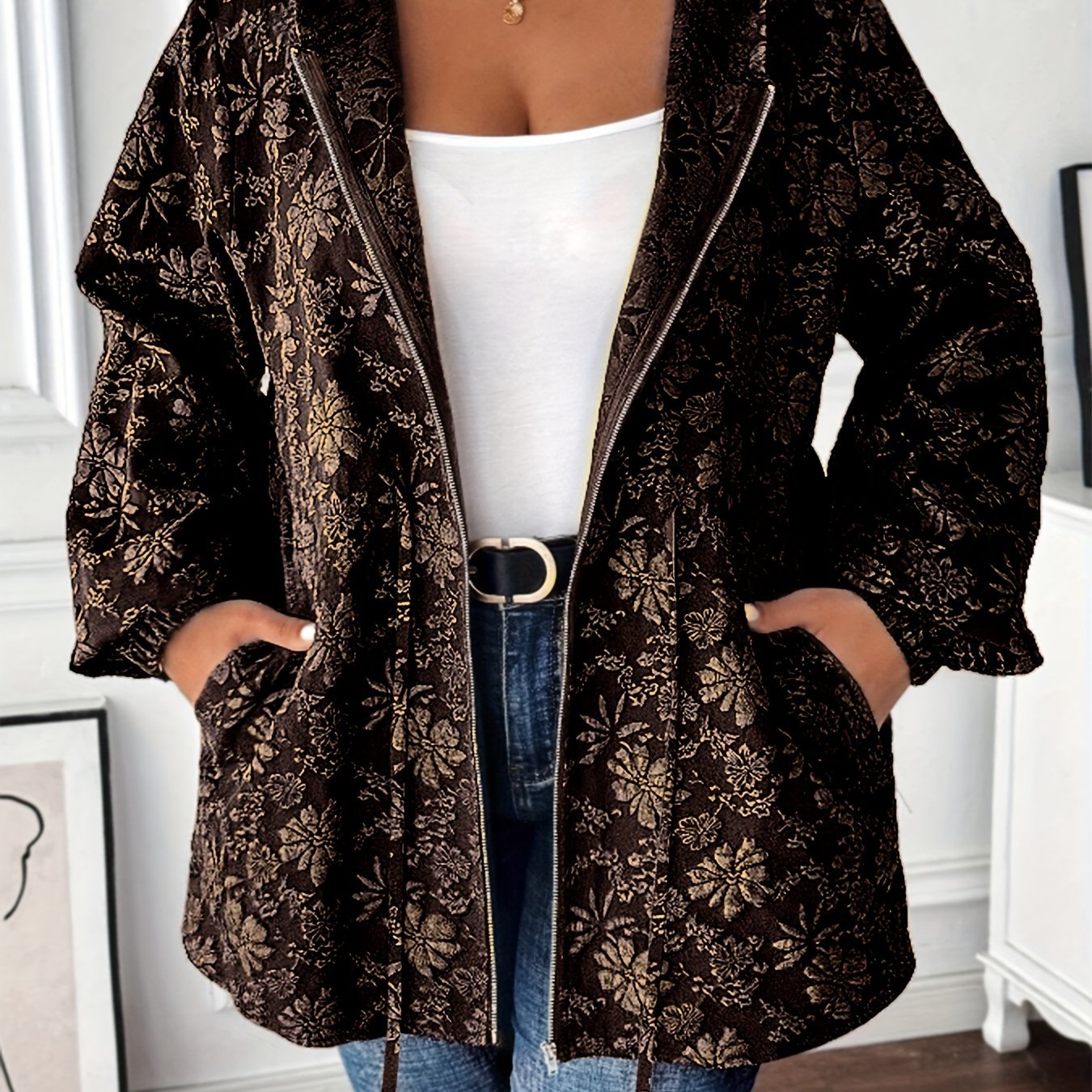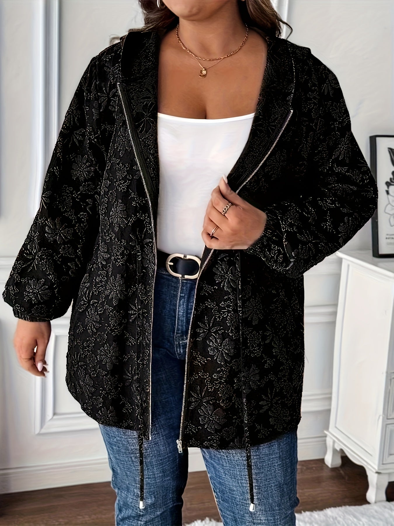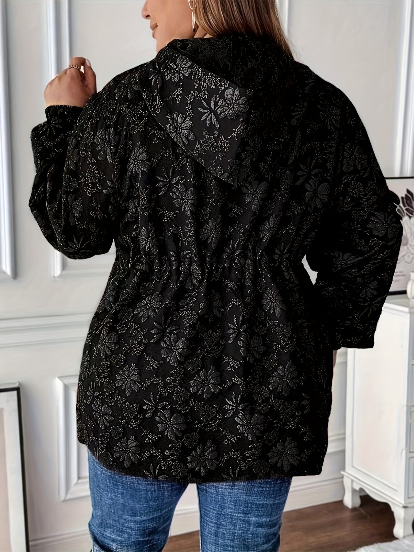 Толстовка с цветочным жаккардовым принтом для полных, с карманами и шнурком