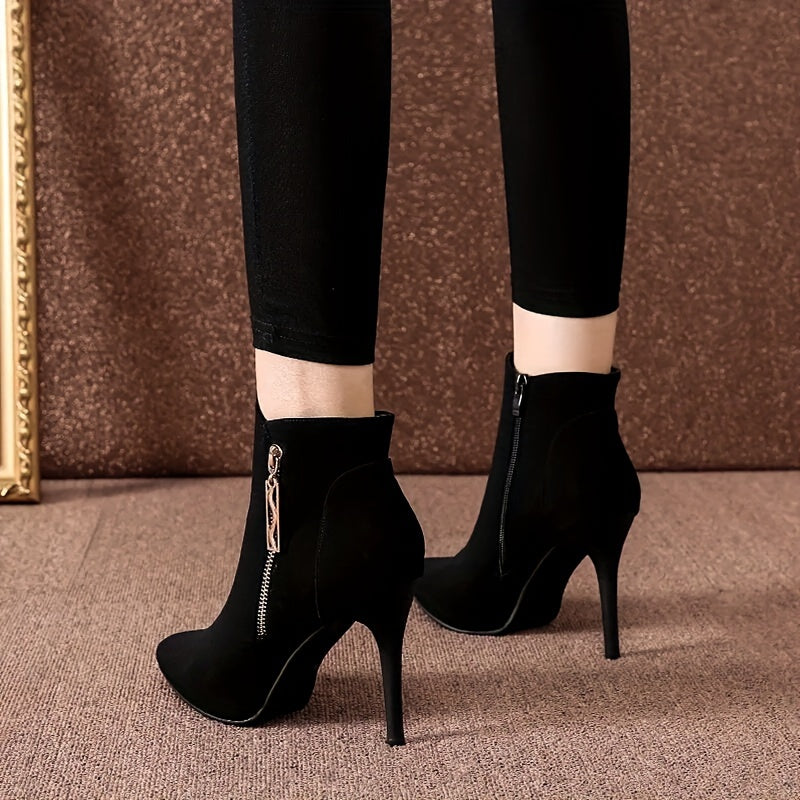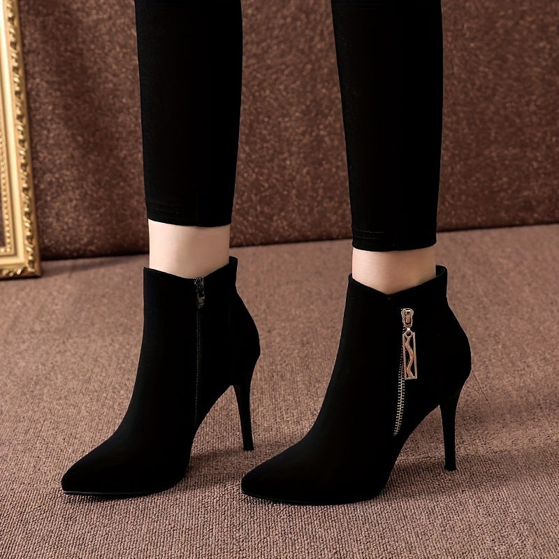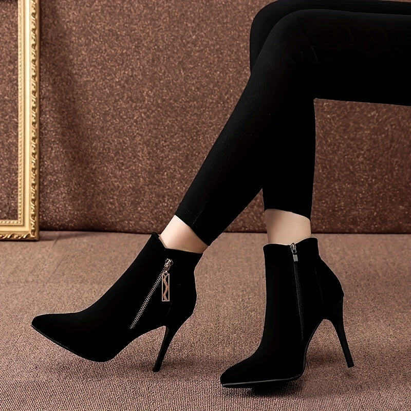 Стильные черные ankle-ботинки на высоком каблуке с заостренным носком и каблуком-стилето, с фланелевым верхом и боковой застежкой на молнии. Идеально подходят для вечеринок, свадеб и повседневной носки осенью.
