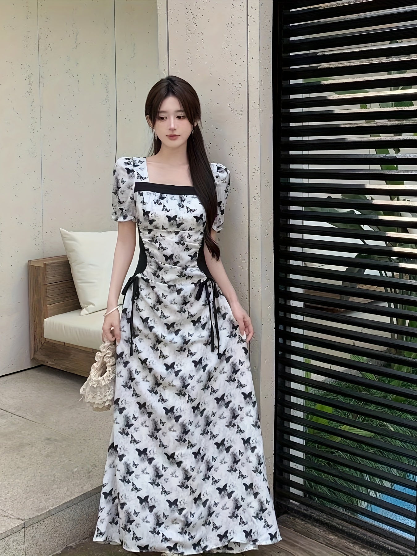 Стильное платье с принтом бабочек, с рюшами по низу, квадратным вырезом и шнуровкой. Изготовлено из полиэстера, который можно стирать в машине, идеально подходит для весны, лета или осени.