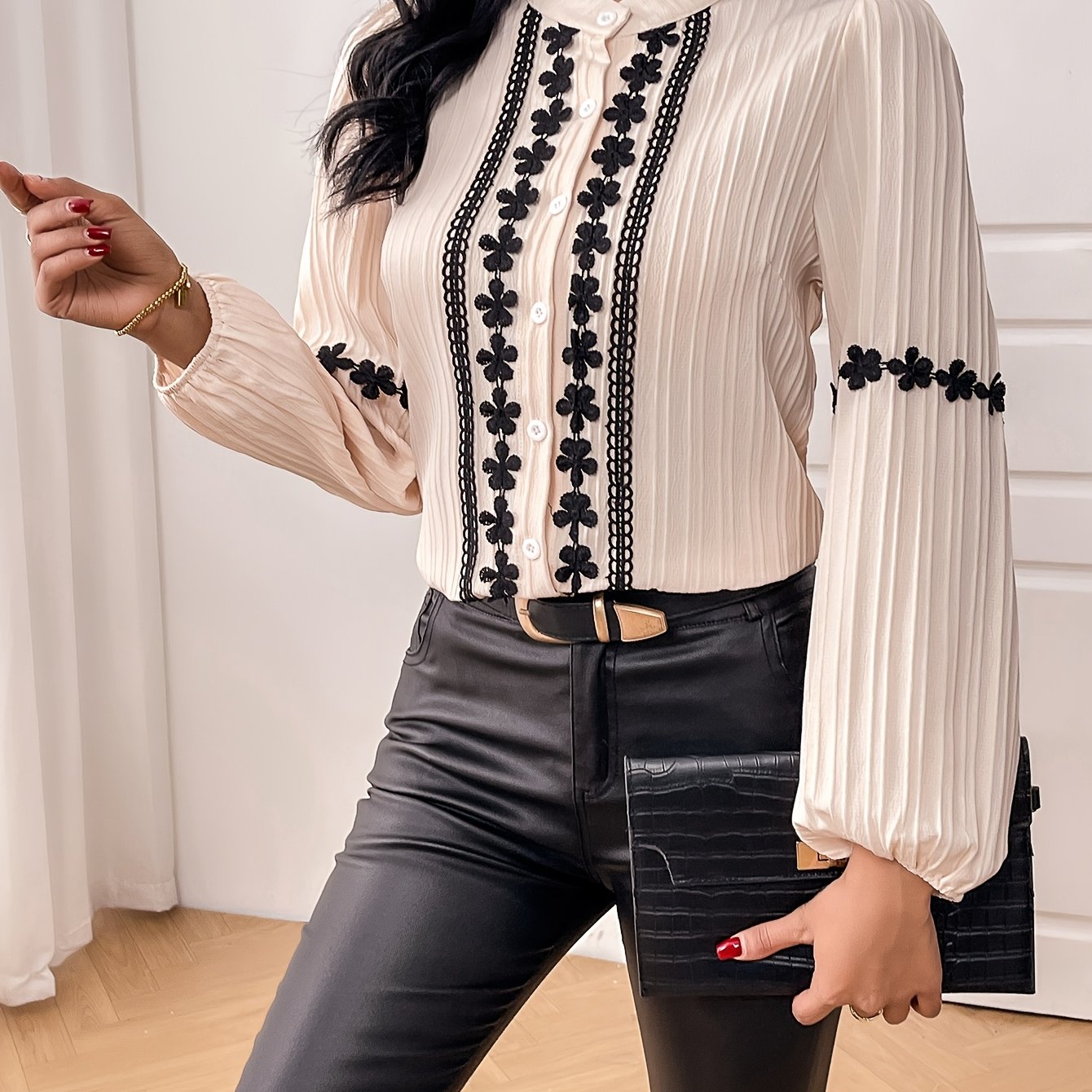 Стильная блузка с кружевной отделкой, текстурной волнистой полоской, стойкой и фонарными рукавами - идеальна для осени и зимы.