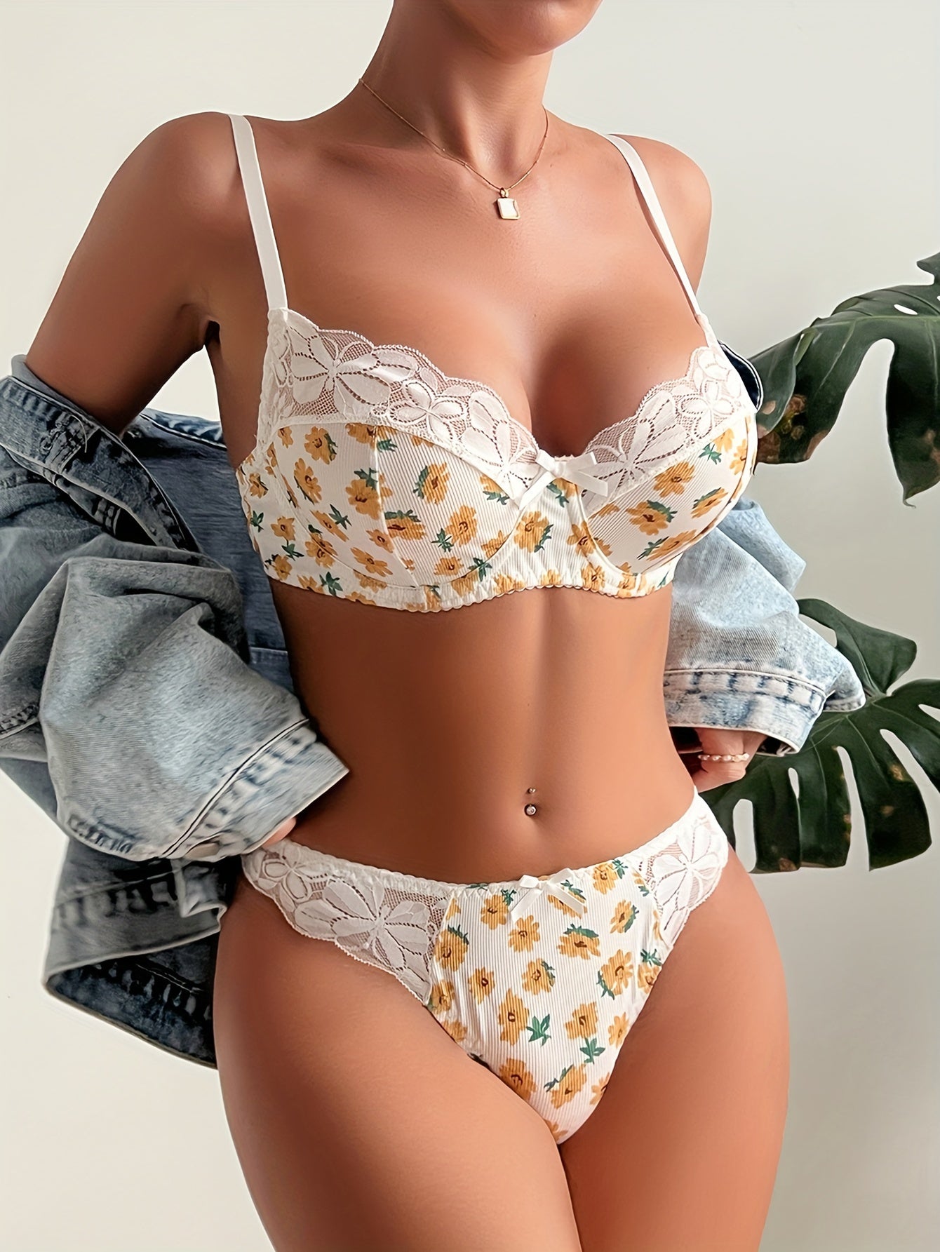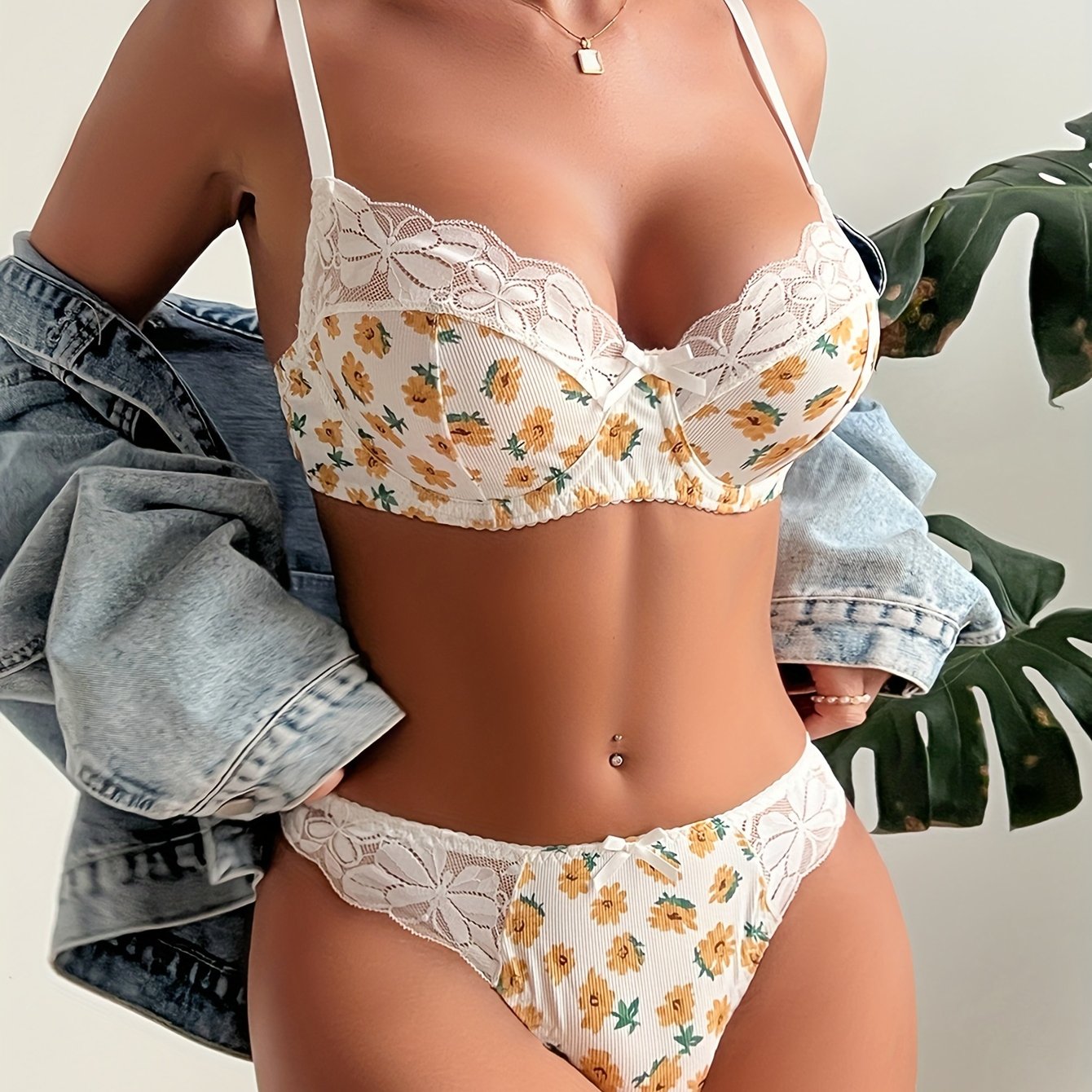 Стильный комплект бюстгальтера и трусиков с кружевной отделкой для женщин из комфортной, непрозрачной полиэстеровой смеси с случайным принтом.