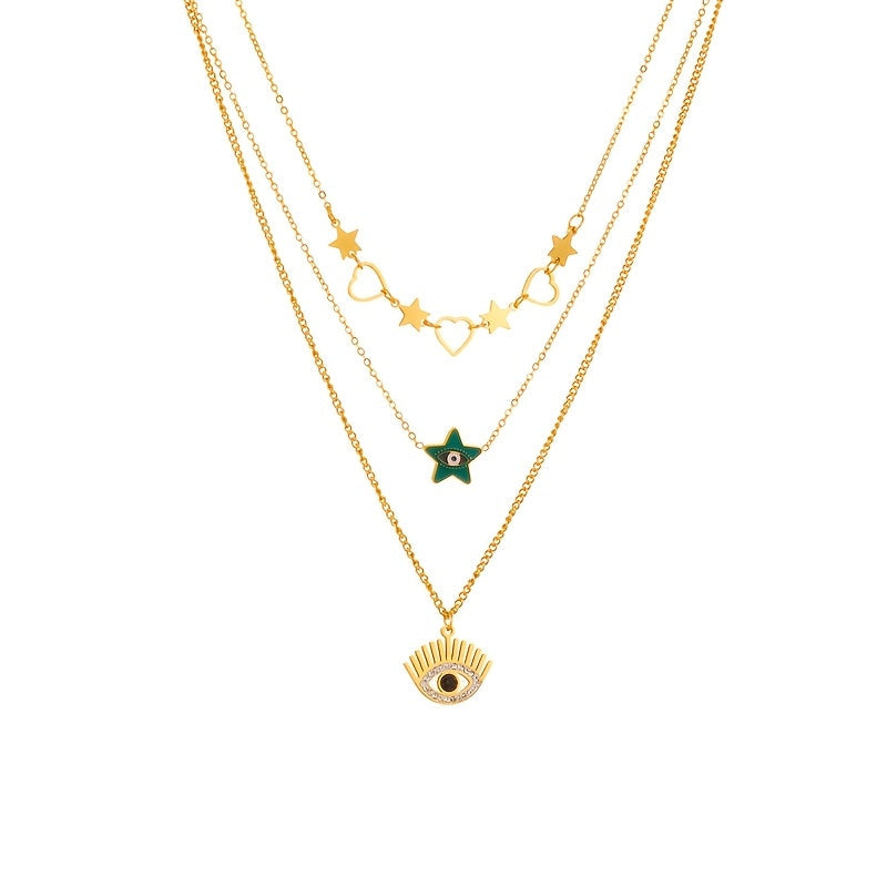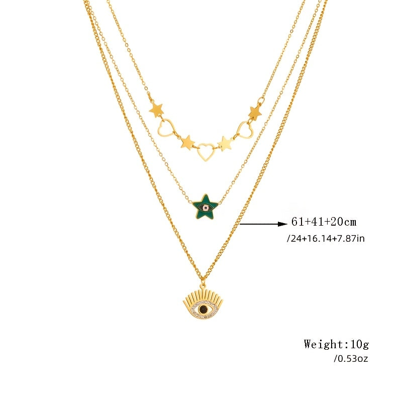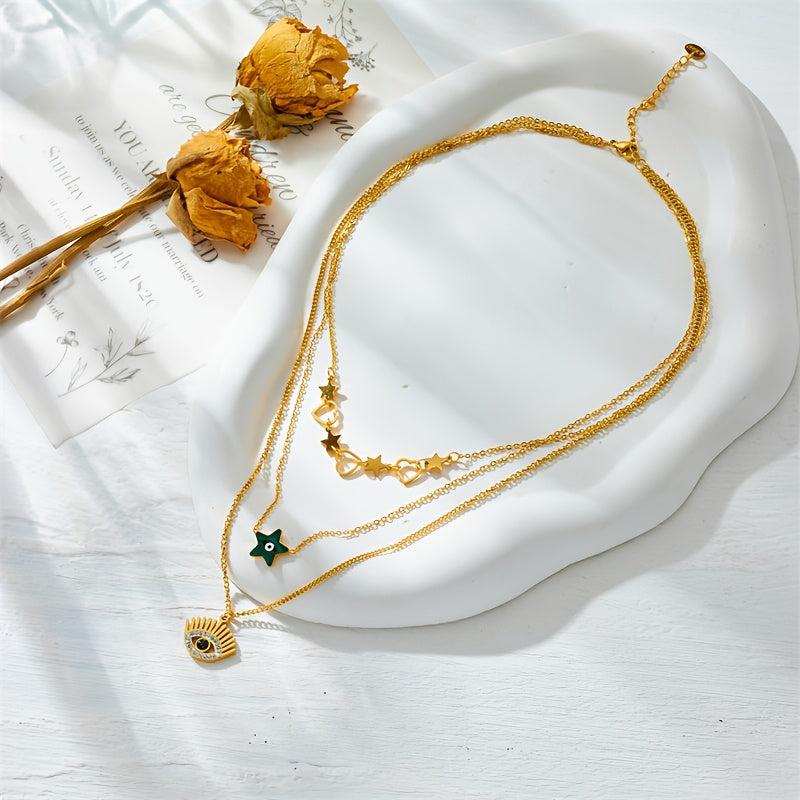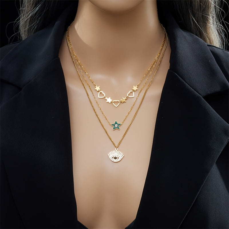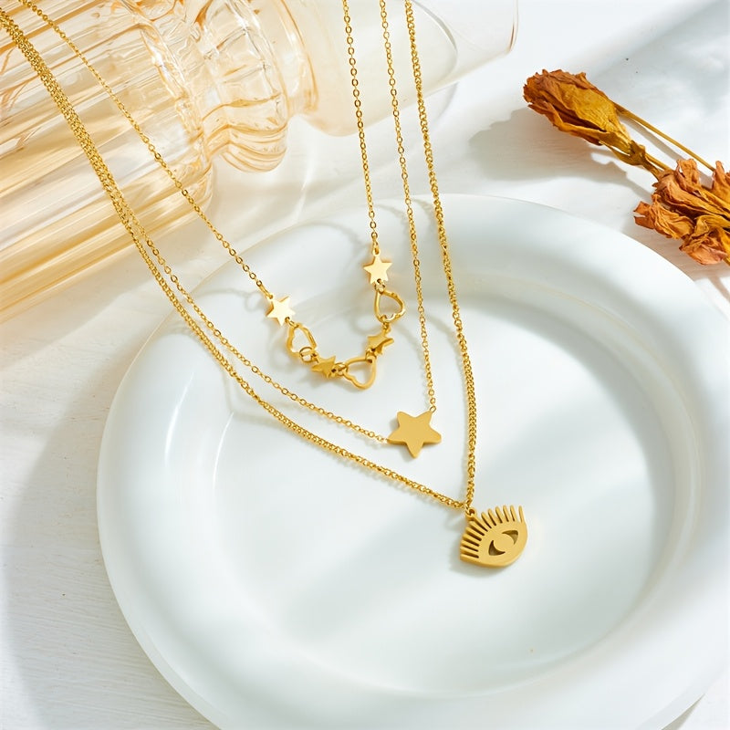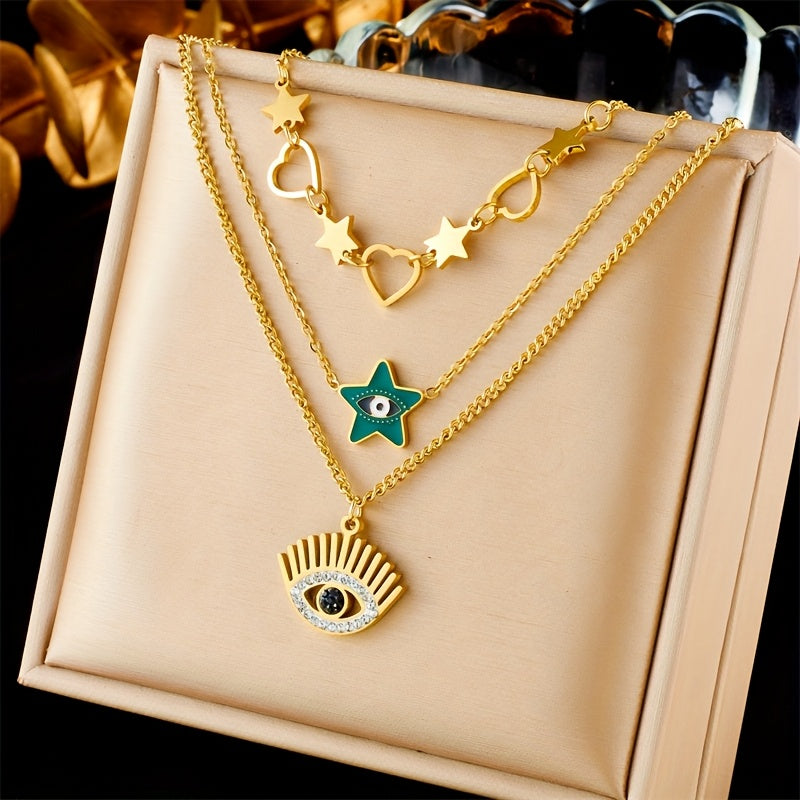 Стильное многоуровневое ожерелье с подвесками в виде глаза и звезды - изготовлено из нержавеющей стали с акцентами из кубического циркония, идеально подходит для повседневной носки и подарков, идеально для креативных, заботливых и праздничных случаев