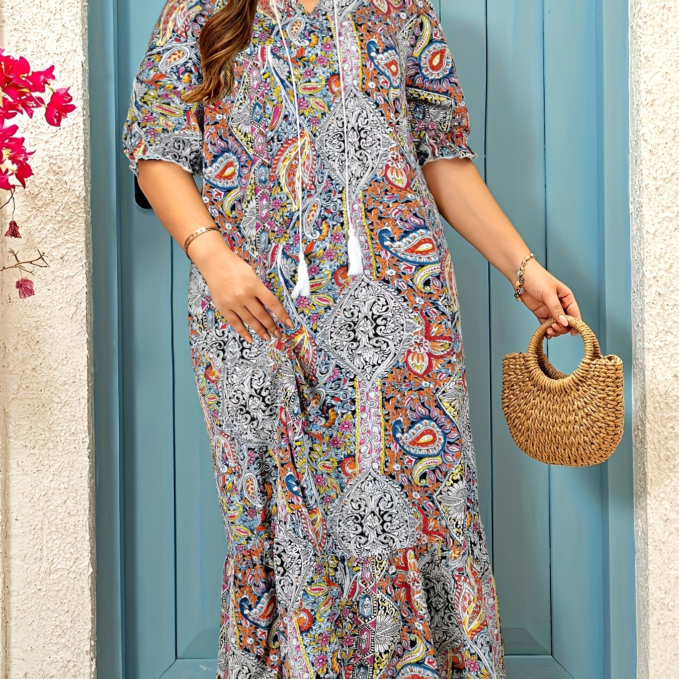 Стильное платье с принтом в стиле пейсли, V-образным вырезом, рюшами по низу и кисточками. Изготовлено из полиэстера, можно стирать в машине. Идеальная летняя мода для женщин.