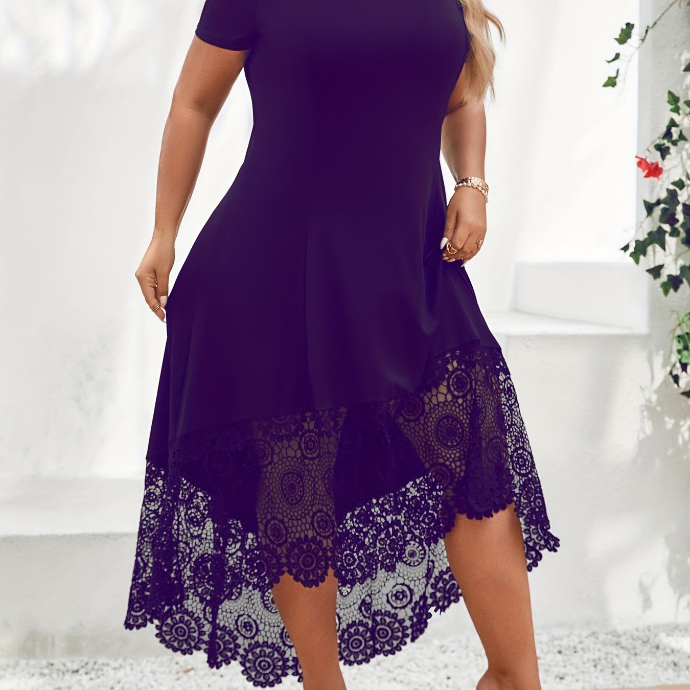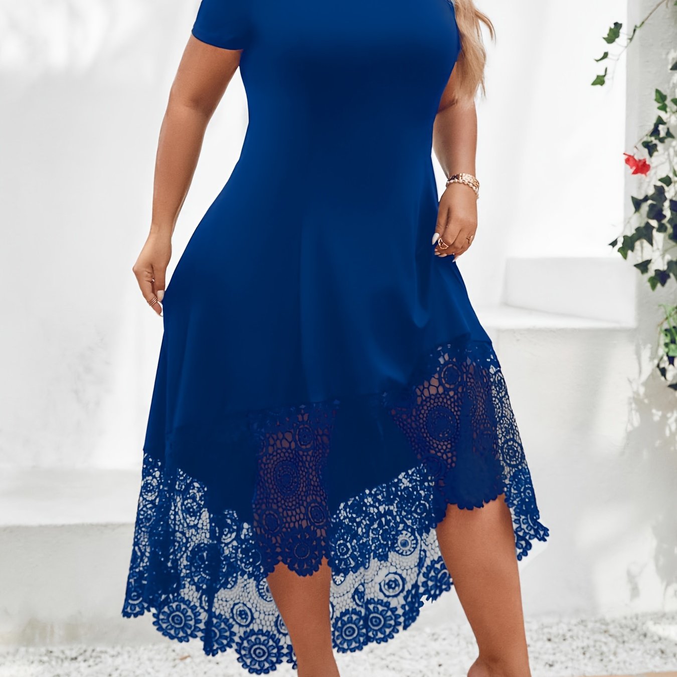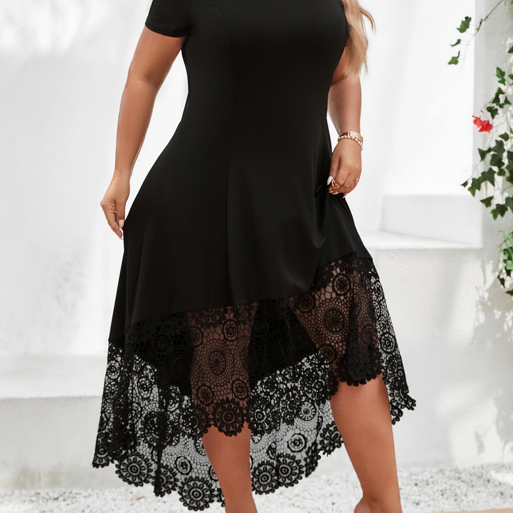 Платье большого размера черное с белым кружевом, с открытыми плечами, коротким рукавом, асимметричным подолом, летним элегантным трикотажем