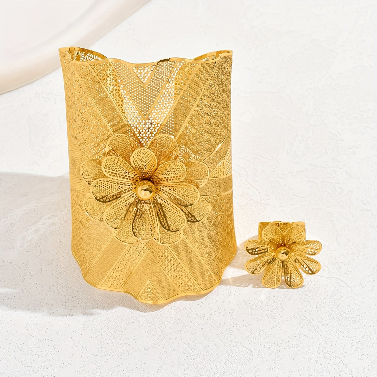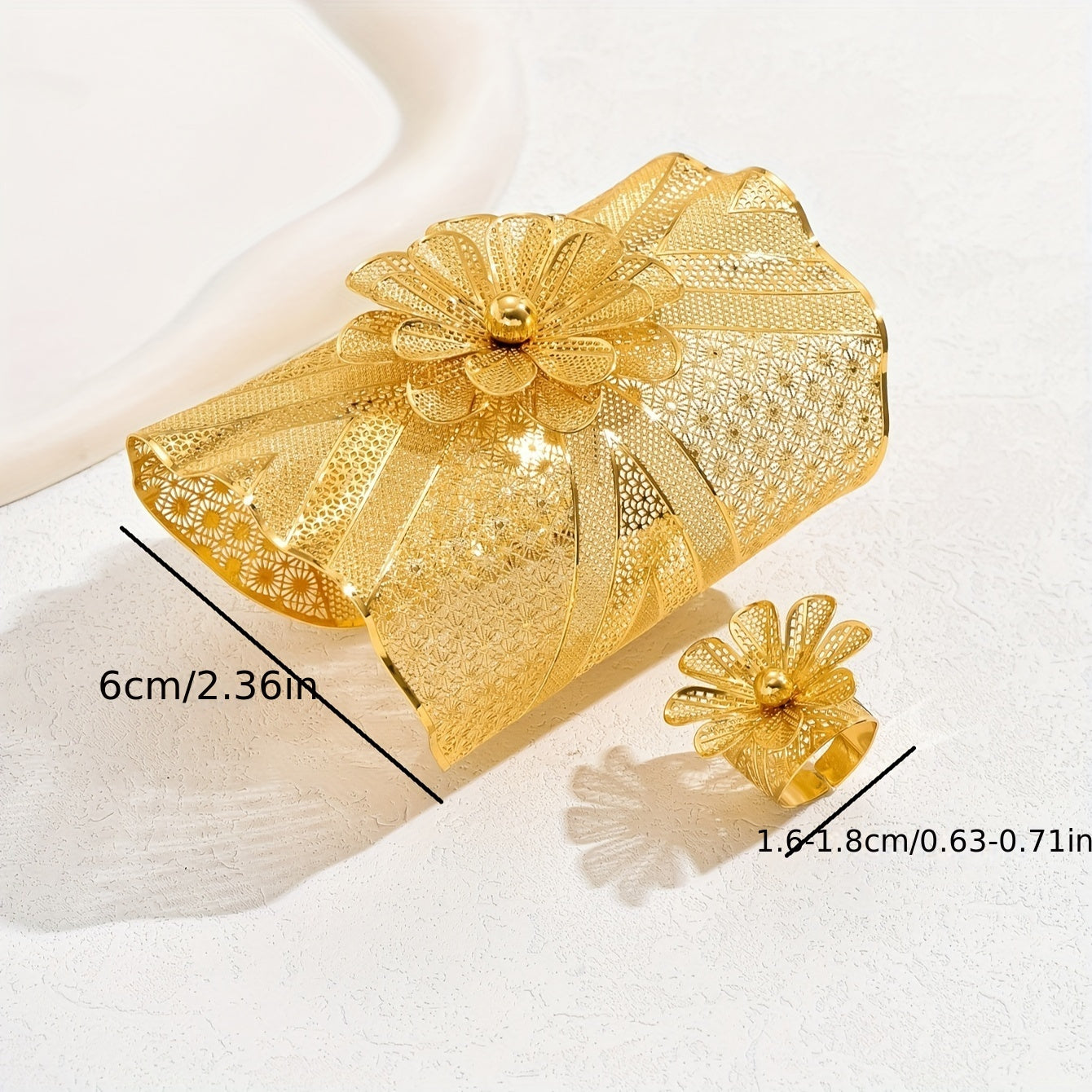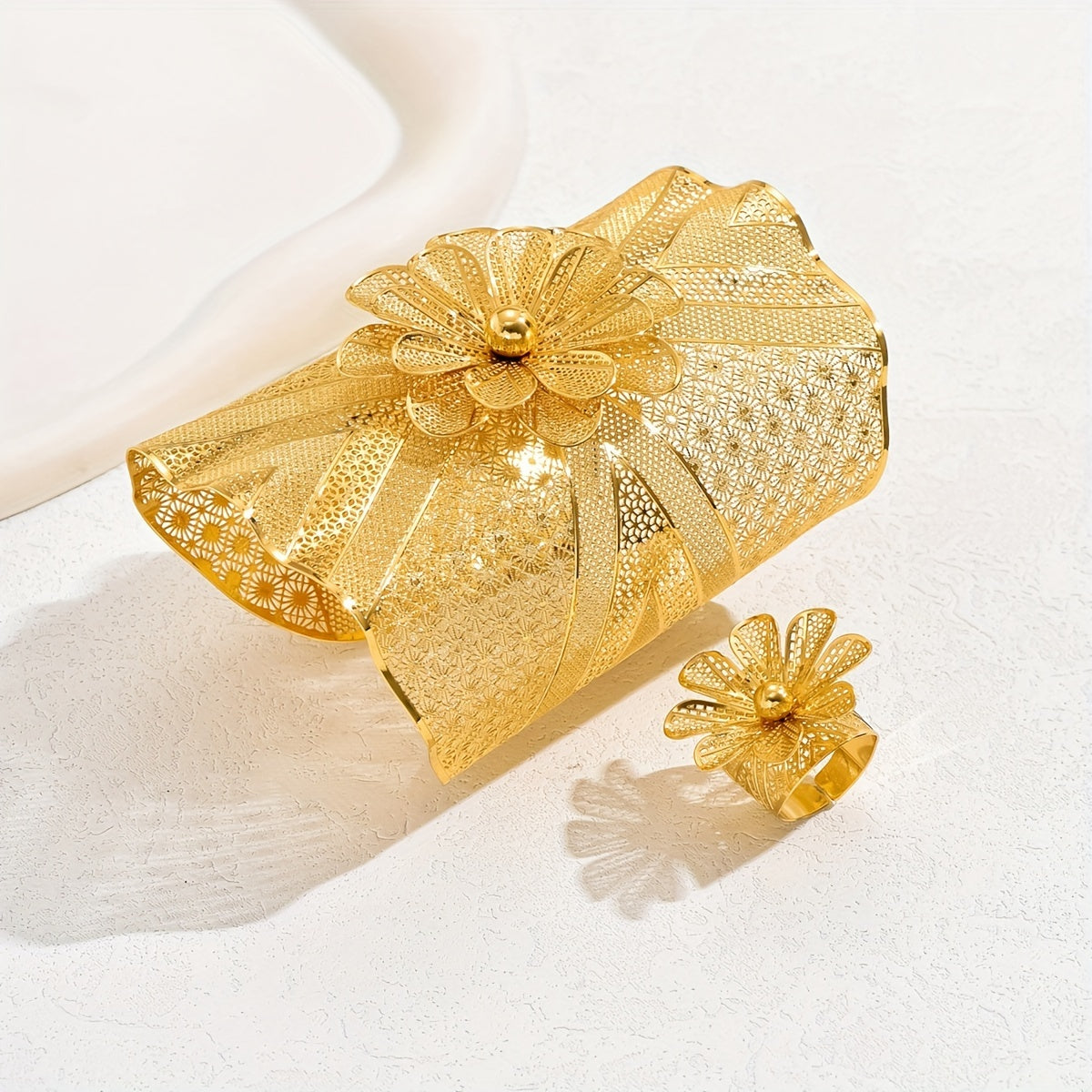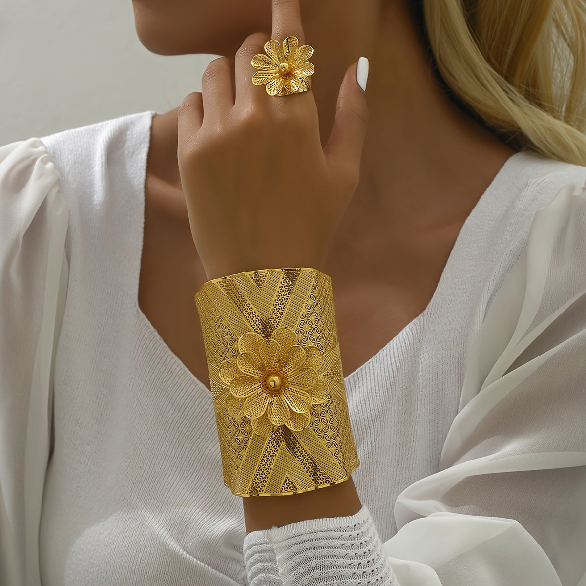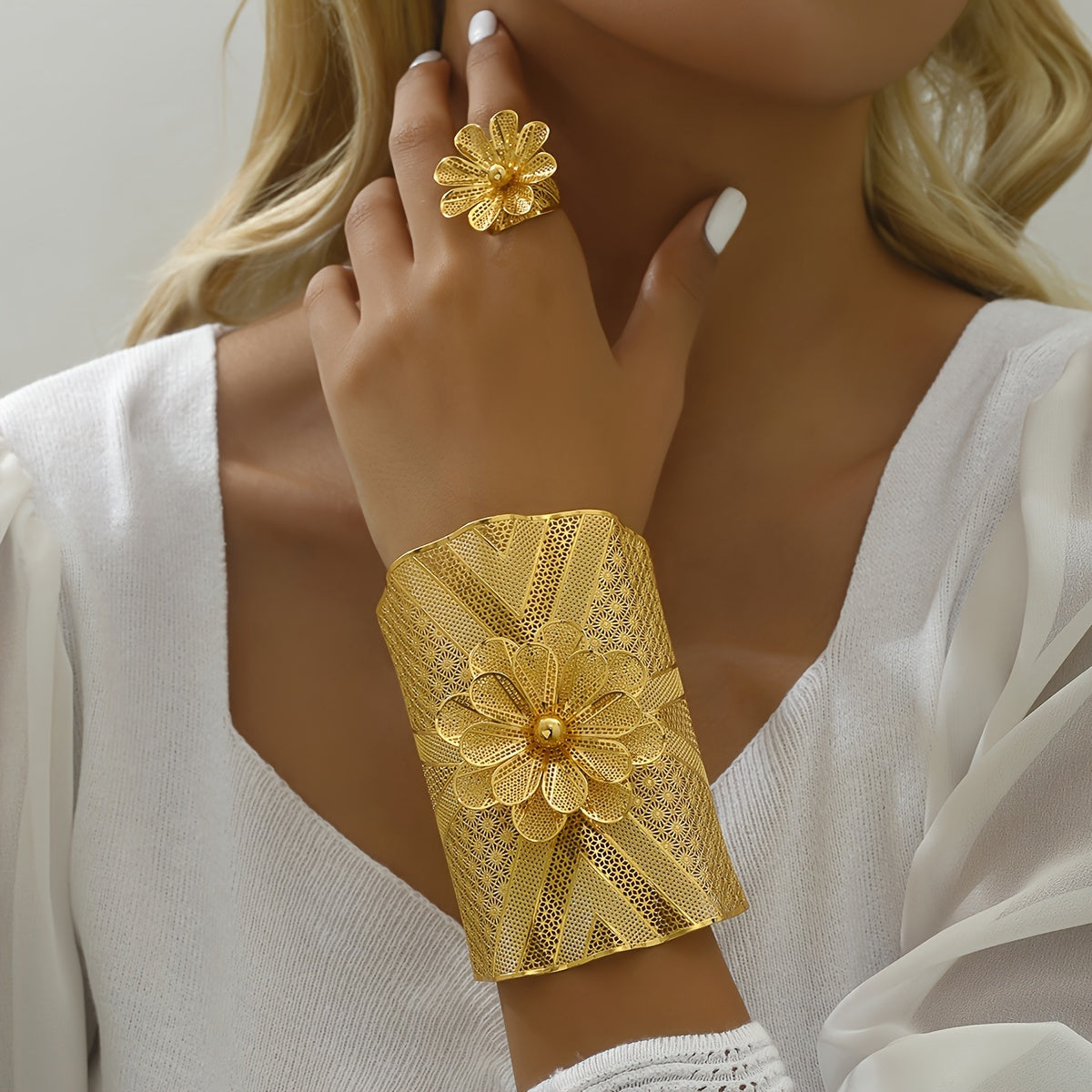 Стильный комплект из двух предметов: браслет и кольцо с замысловатыми цветочными вырезами, изготовленный из железа, идеален для свадеб и мероприятий - с европейским и американским влиянием.