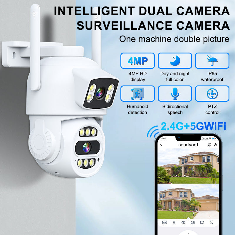 4МП Двойная объективная беспроводная охранная камера с ночным видением, двусторонним звуком, водонепроницаемость IP65