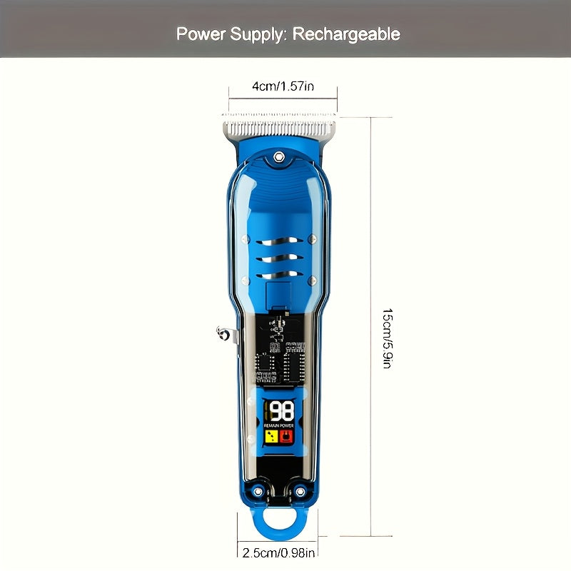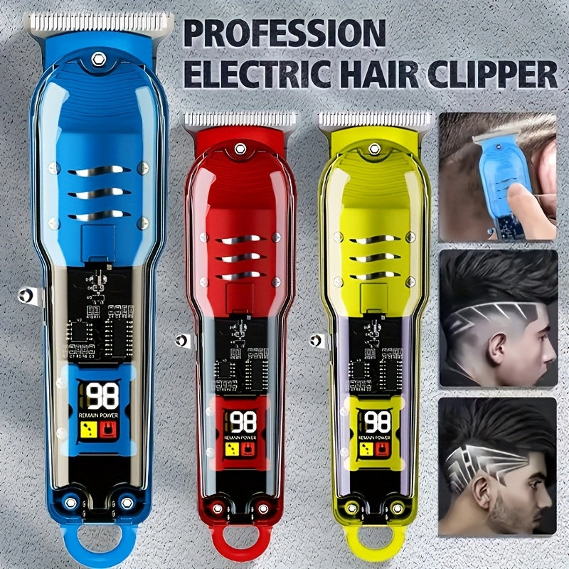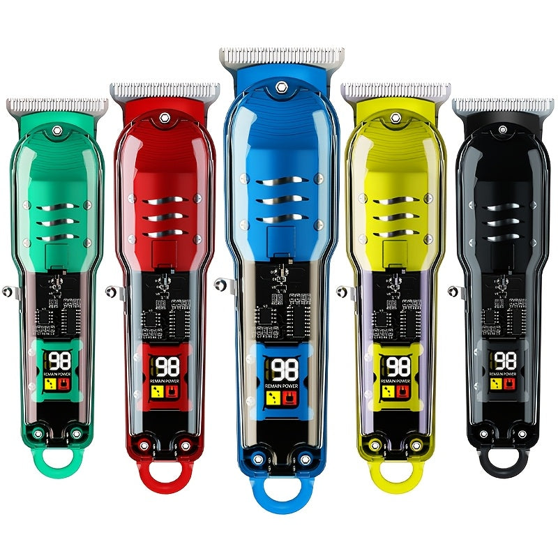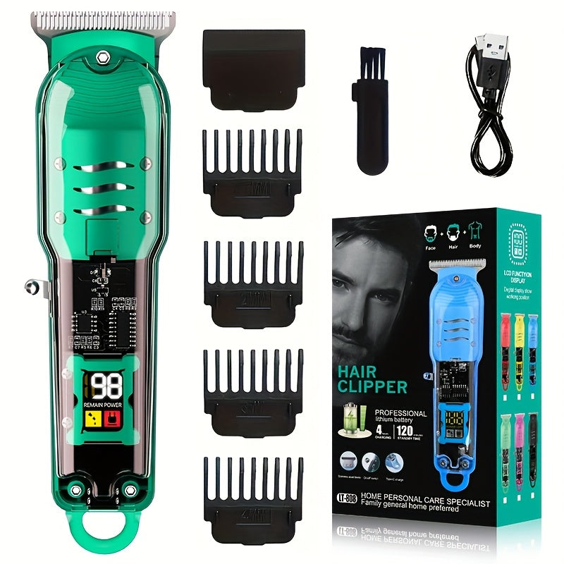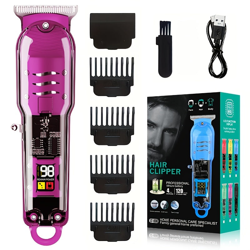 Прозрачный набор машинки для стрижки волос с ЖК-дисплеем, USB-заряжаемый. Подходит для использования в салоне и дома. Включает литиевый аккумулятор и зажимы для волос.