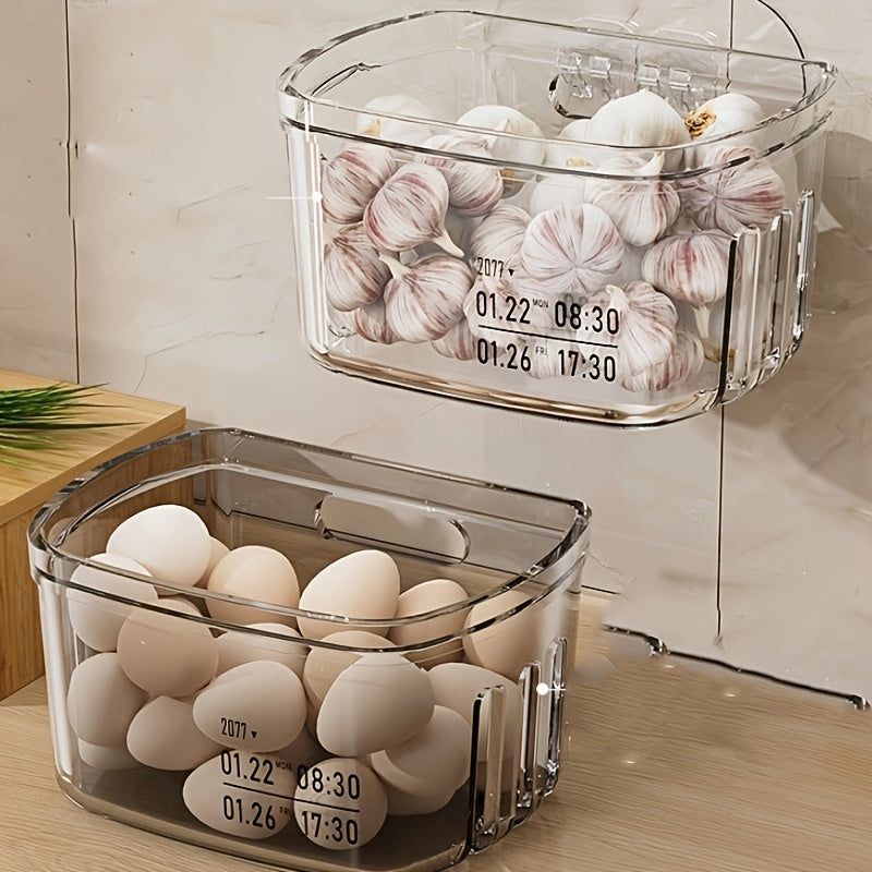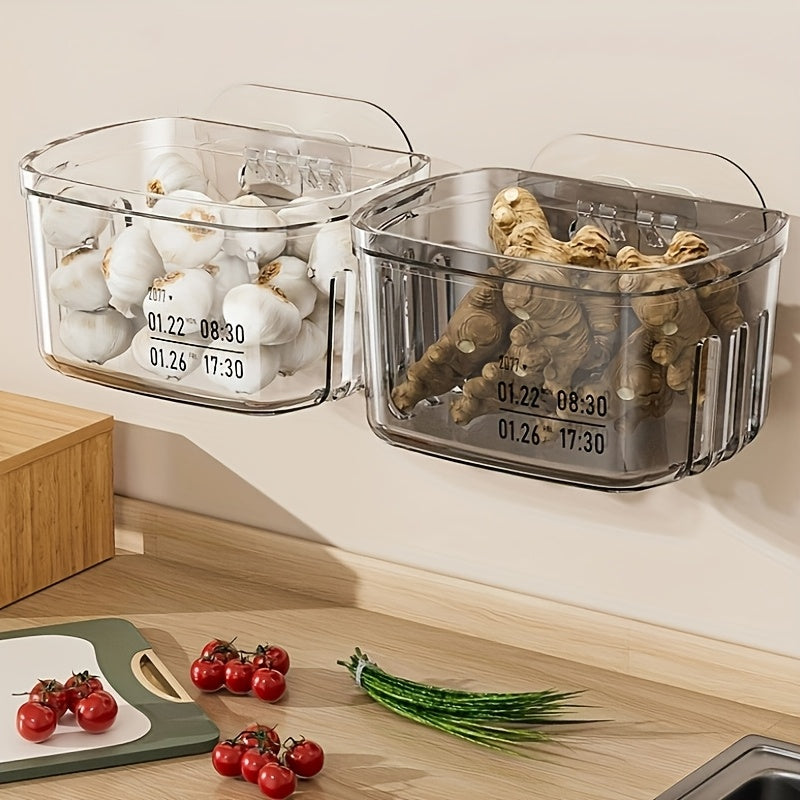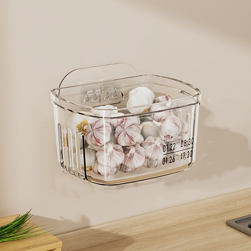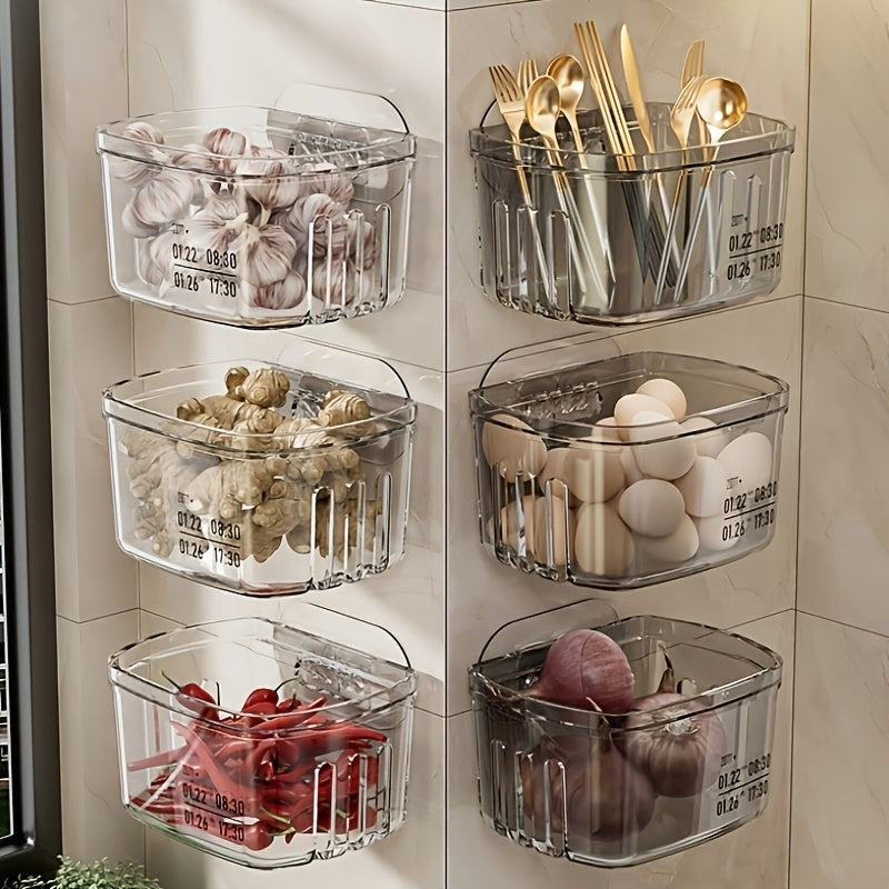 Прозрачная кухонная корзина для хранения - 1 шт. Настенный органайзер для мелких предметов, установка без сверления. Изготовлена из пластика с открытой конструкцией стеллажа для хранения.
