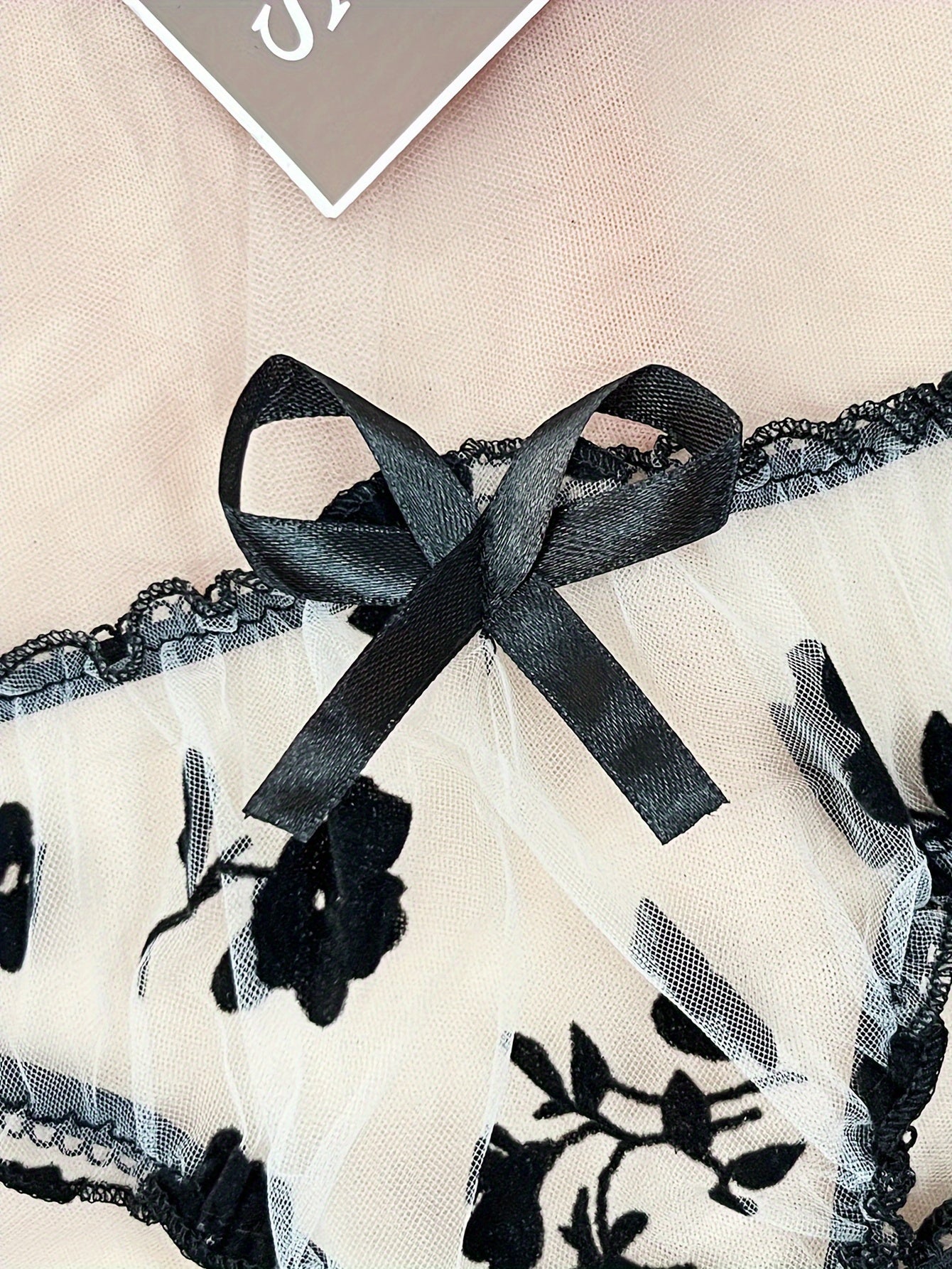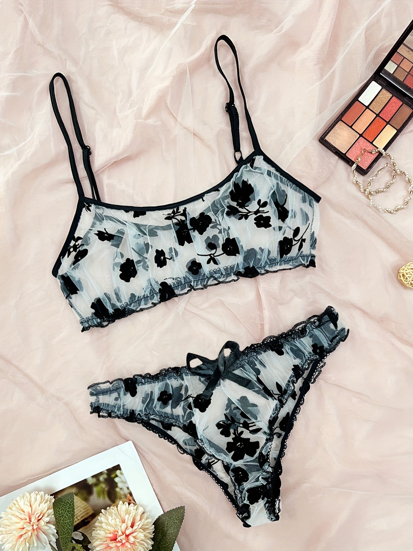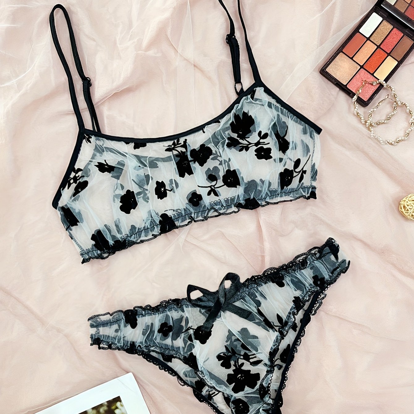 Прозрачный сетчатый комплект нижнего белья с цветочной флокировкой, регулируемыми тонкими бретелями, бантиками и подходящими трусиками.