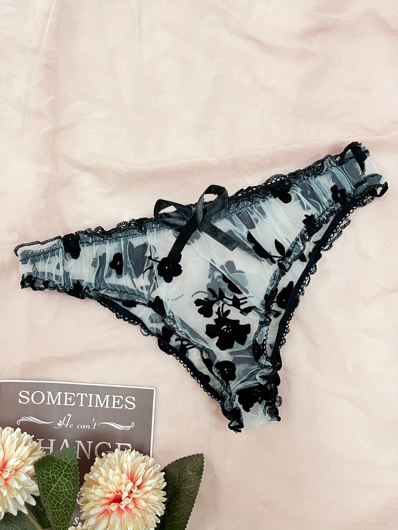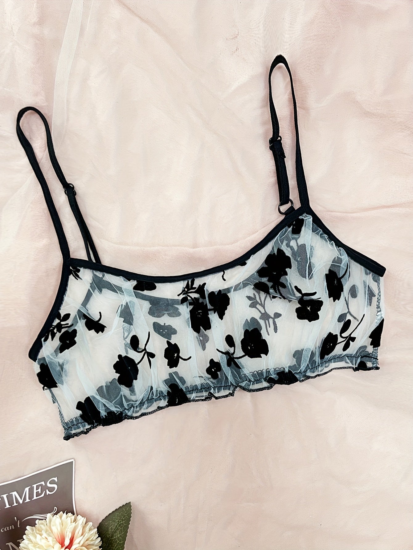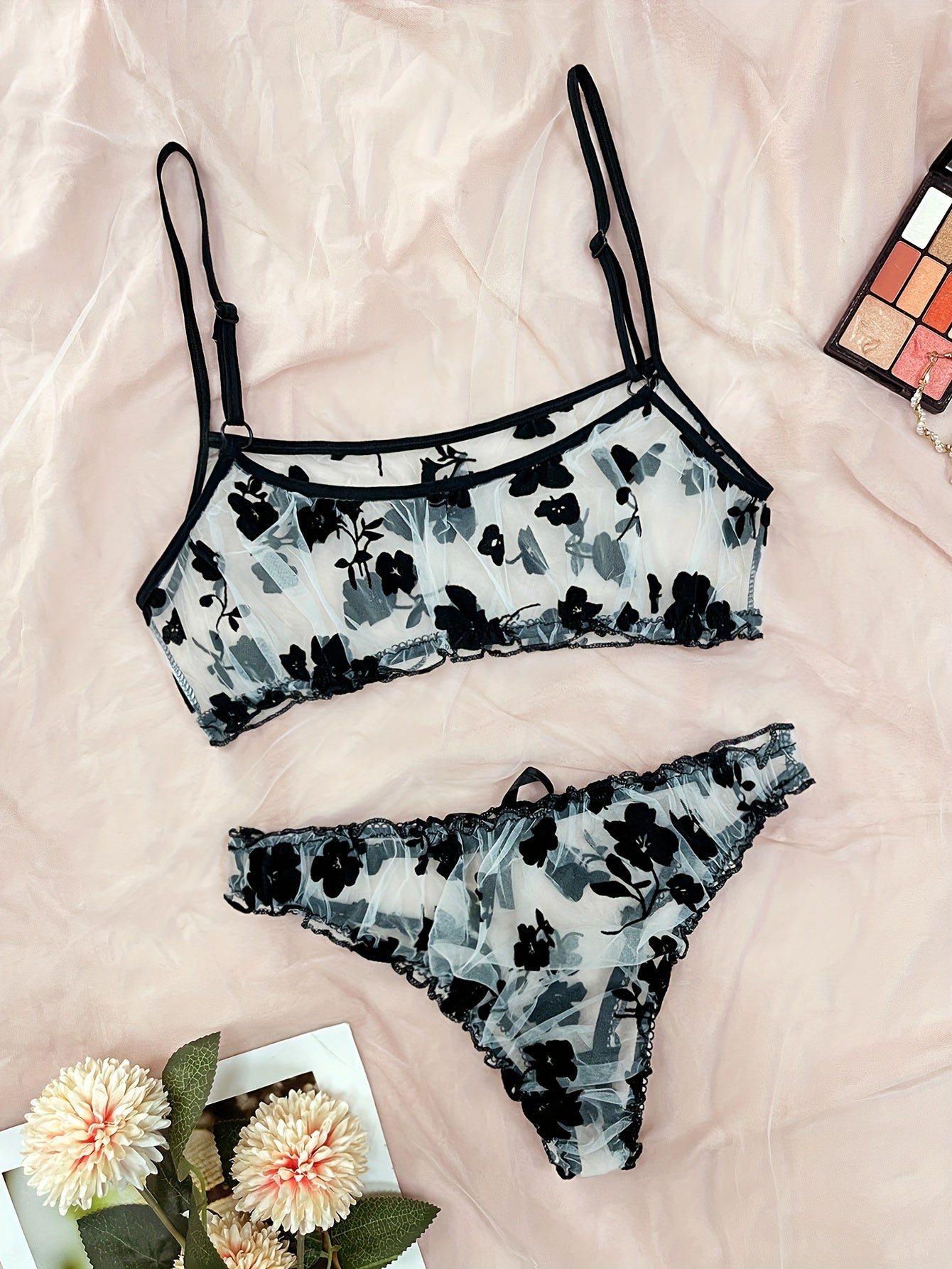 Прозрачный сетчатый комплект нижнего белья с цветочной флокировкой, регулируемыми тонкими бретелями, бантиками и подходящими трусиками.