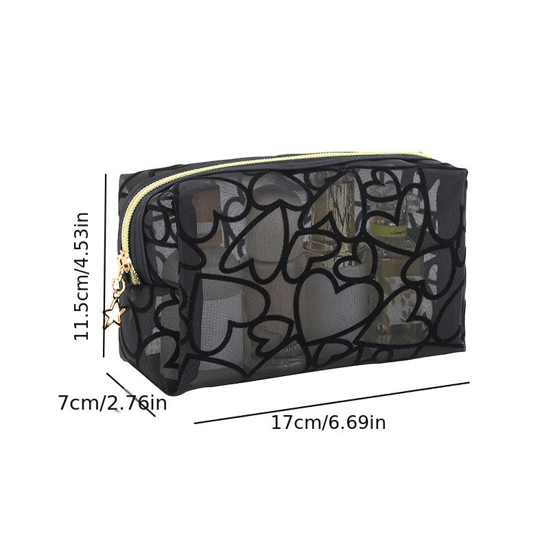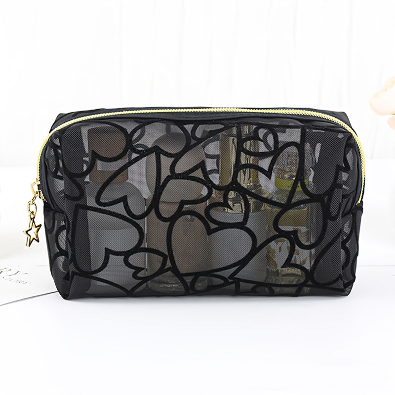 Путешествуйте стильно с этой портативной сумкой для макияжа из сетчатого материала большого объема черного цвета.
