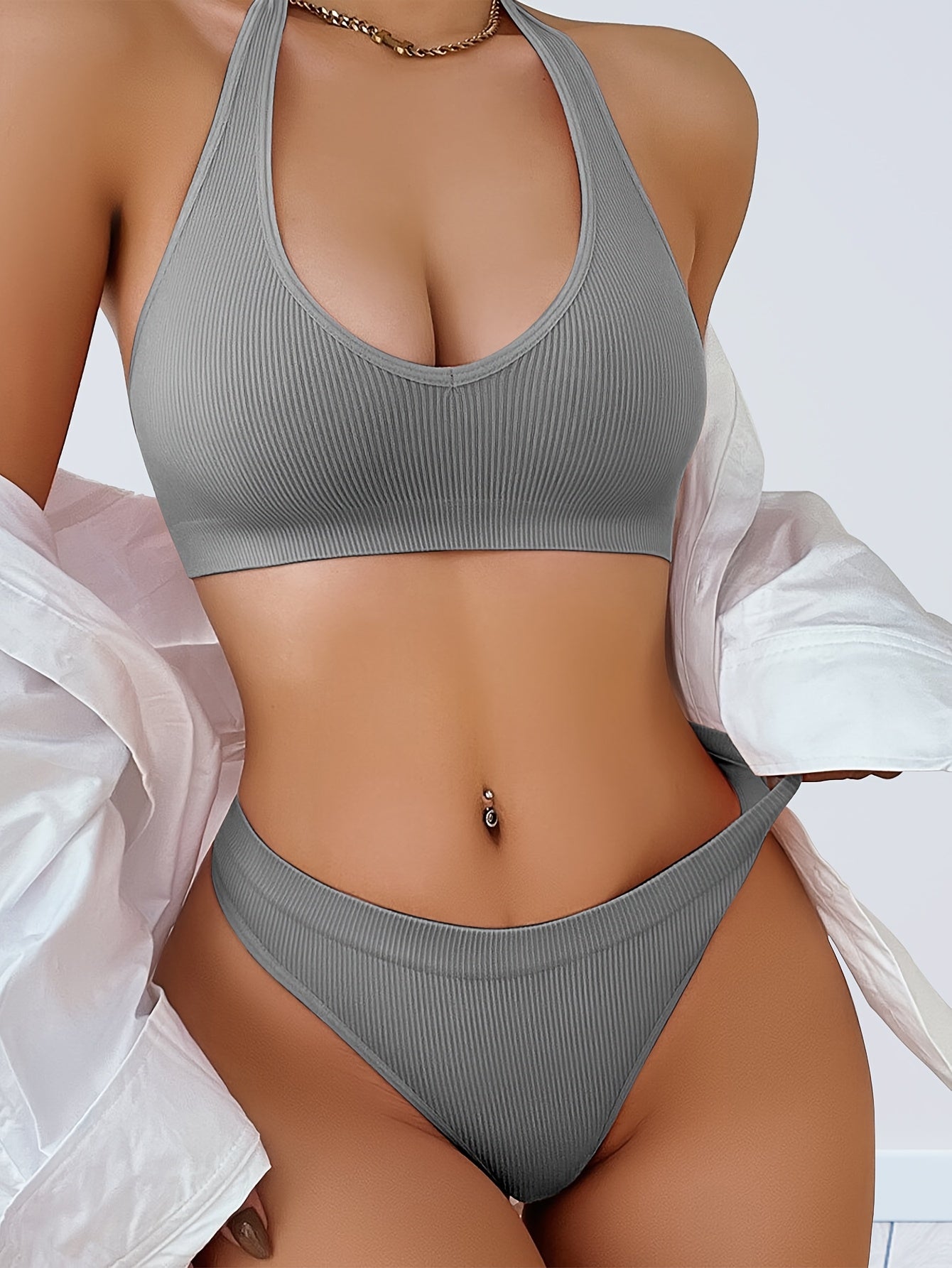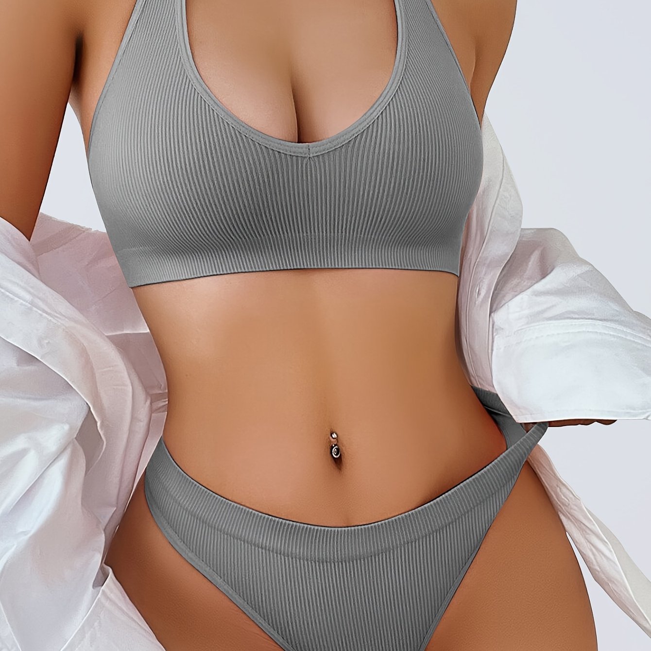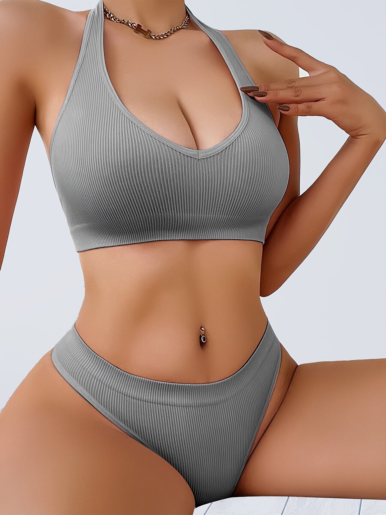 Комплект из двух предметов: женская майка-бра и трусики однотонного цвета, изготовленный из трикотажной ткани с легкой эластичностью. Удобная и дышащая спортивная одежда с вкладышами в бюстгальтере.