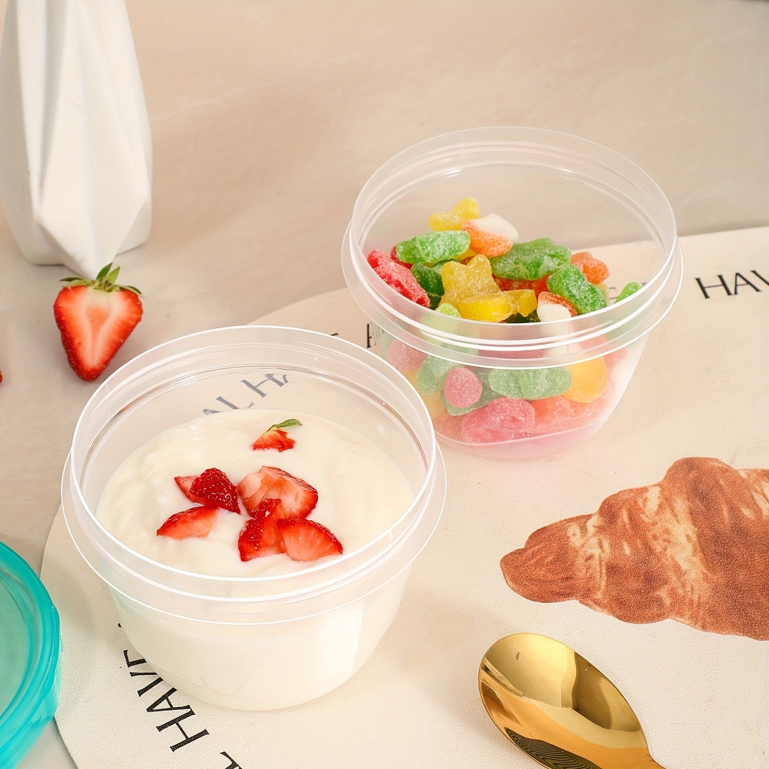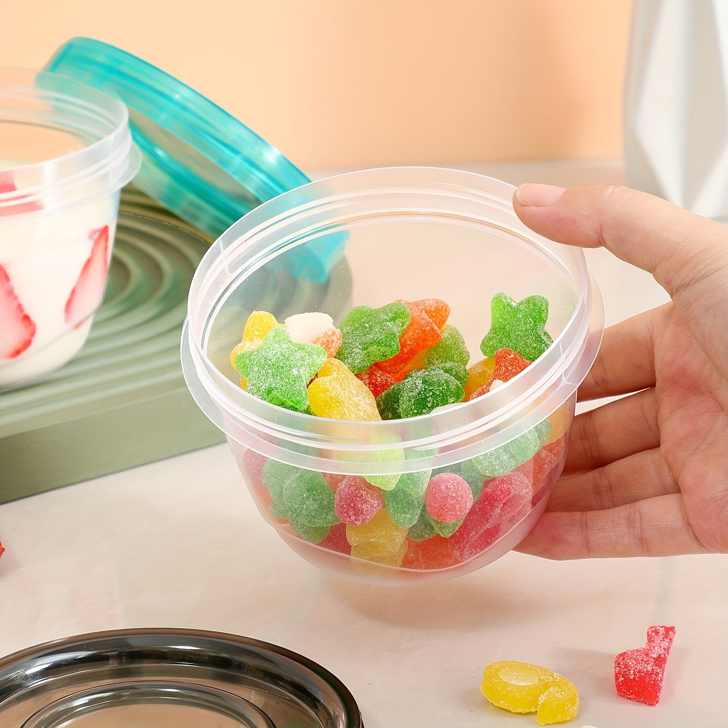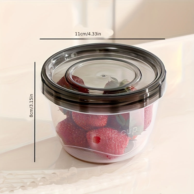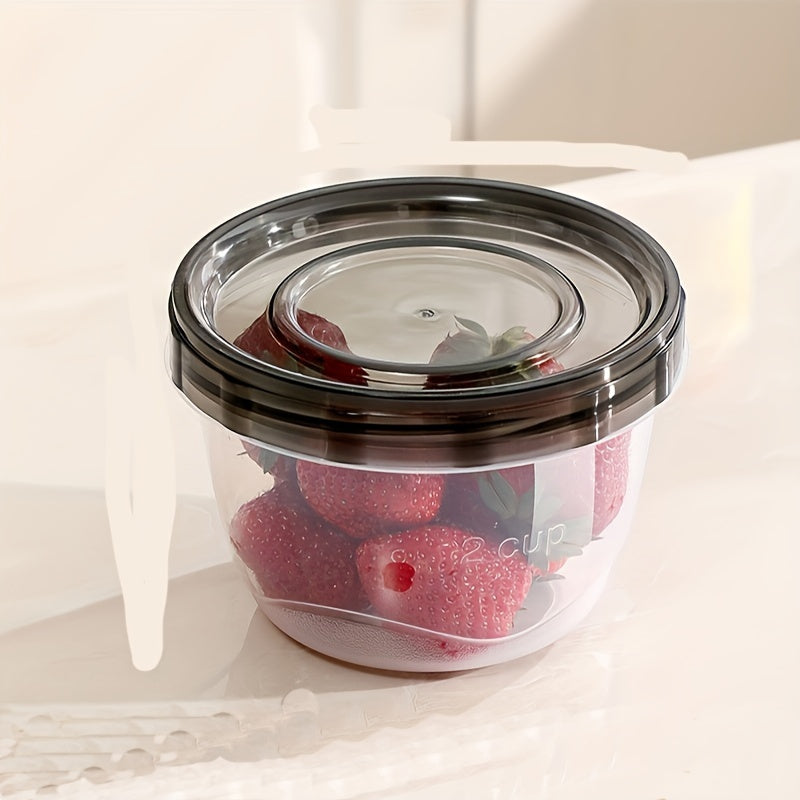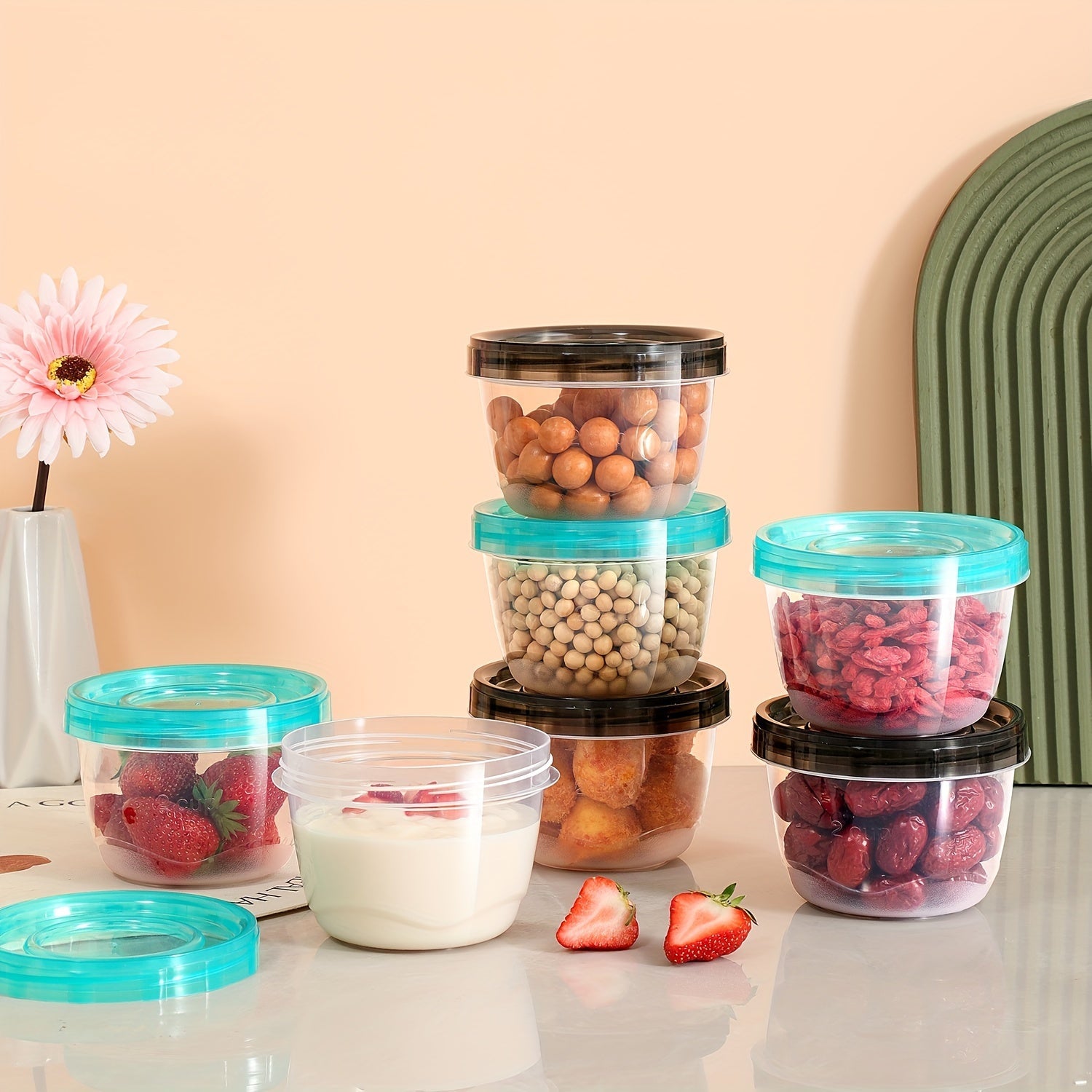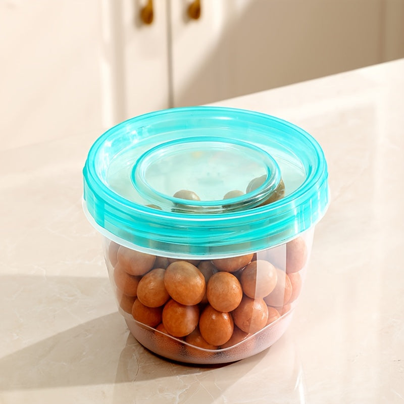 Две прозрачные пищевые емкости с синими крышками — пригодные для использования в микроволновой печи и сохраняющие свежесть круглые коробки для хранения зерна, орехов, фруктов и многого другого — идеально подходят для использования на домашней кухне.