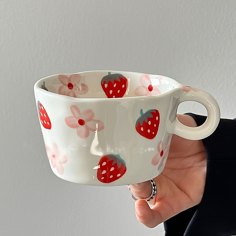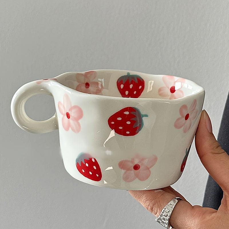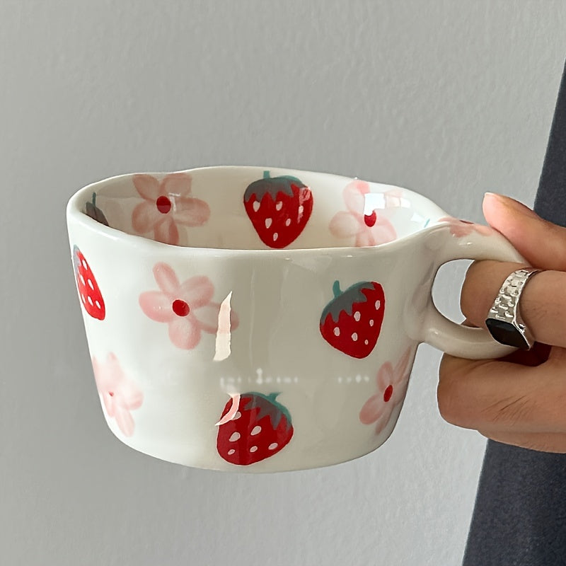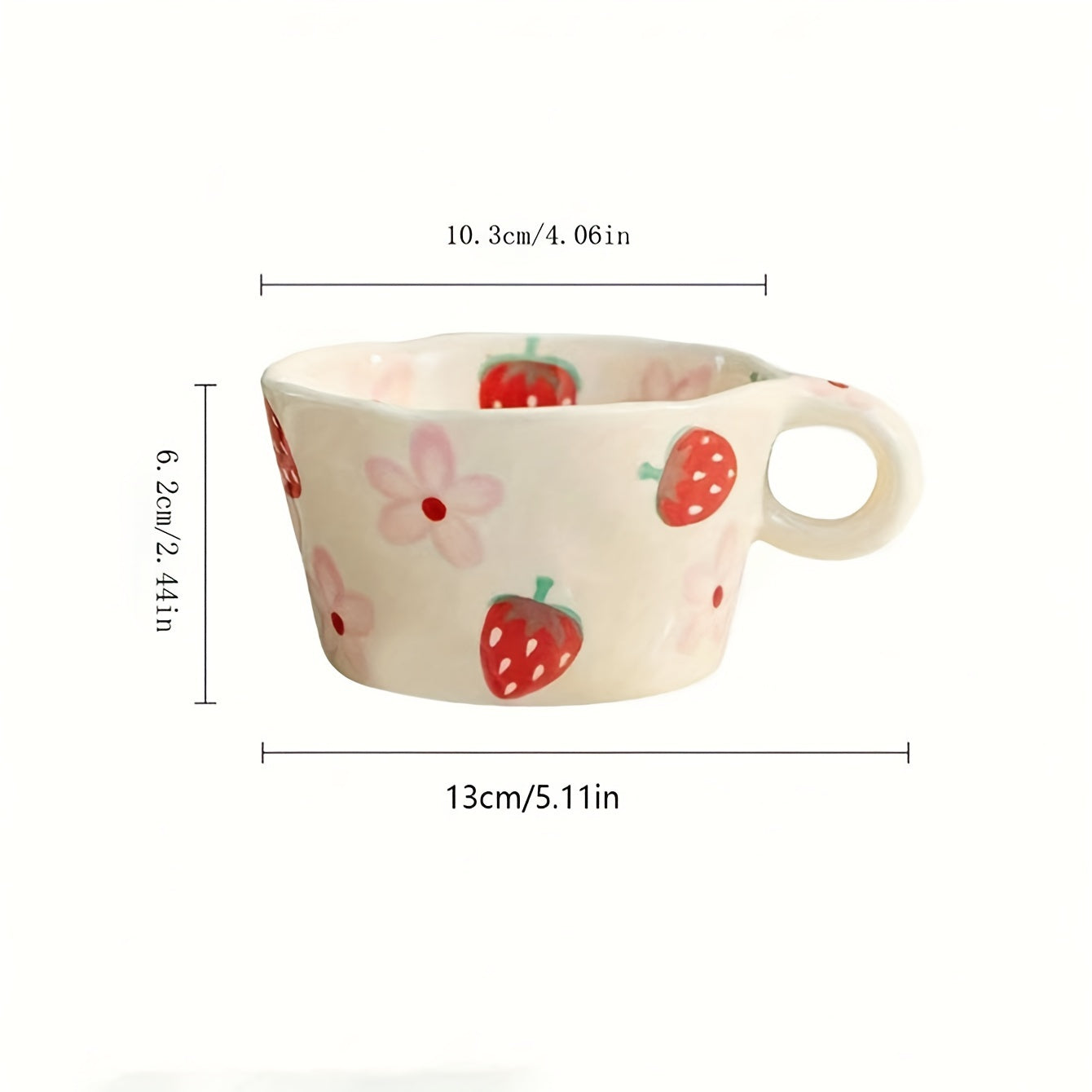 Уникальная ручная роспись керамической кружки с очаровательным дизайном клубники и цветов, идеально подходит для кофе или чая. Идеальный подарок на День святого Валентина, многоразовая и высокого качества, с нерегулярным художественным стилем.