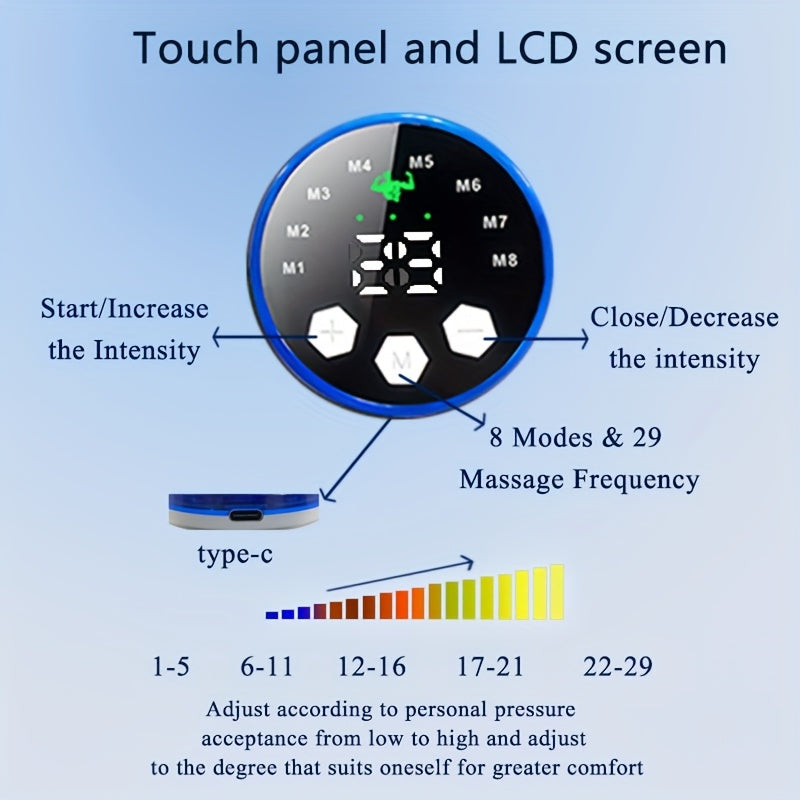 Массажный пояс с USB-зарядкой, 8 режимов и 29 уровней интенсивности. Интеллектуальное таймерное управление, подходит для домашнего массажа и является отличным подарком. Можно использовать по всему телу.