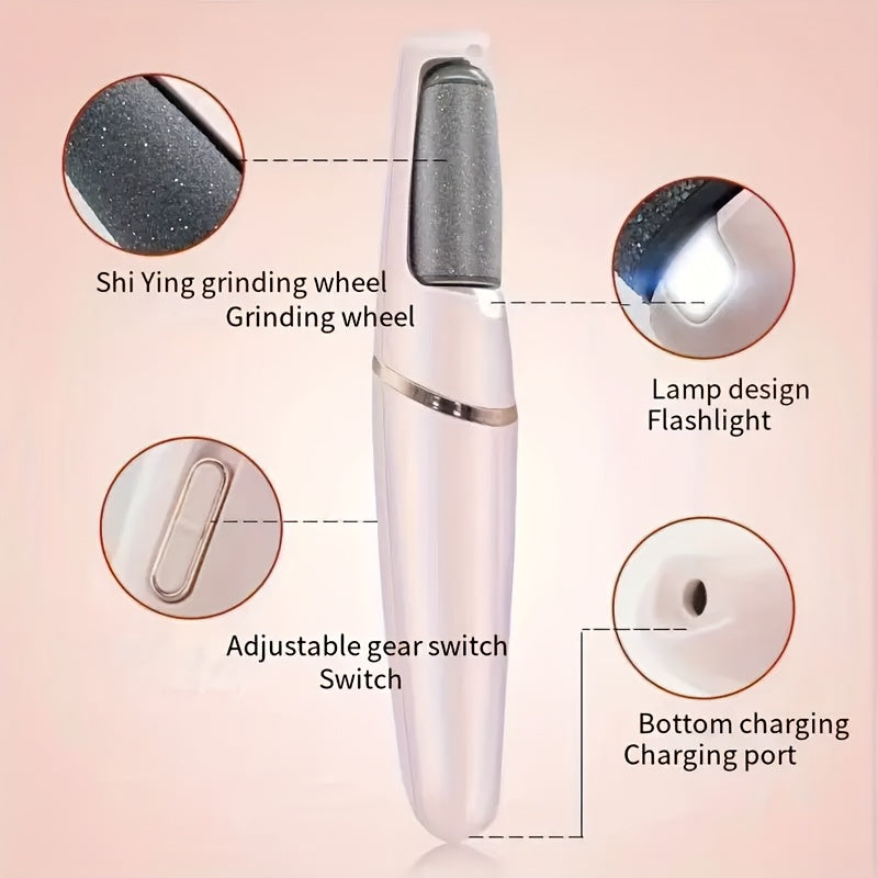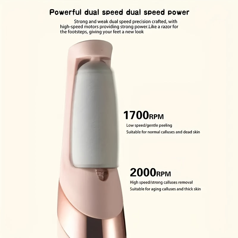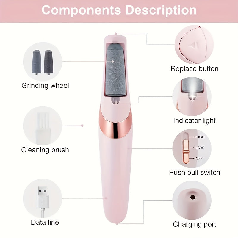 USB-заряжаемый инструмент для ухода за ногами с двойными роликовыми головками для гладких стоп, разработанный для домашнего спа-опыта. Выполнен в розовом цвете с золотыми акцентами и эргономичным дизайном для современного эстетического восприятия.