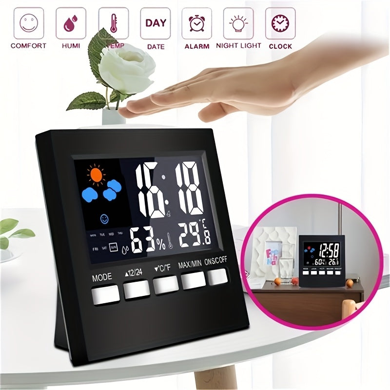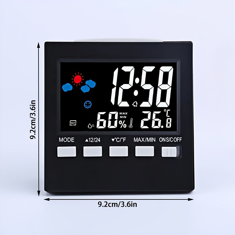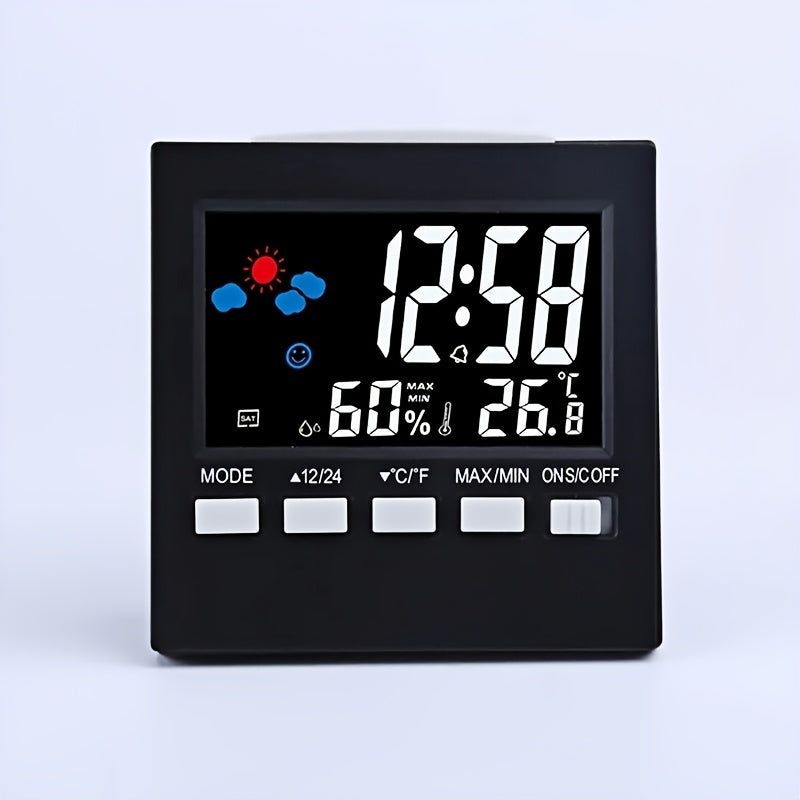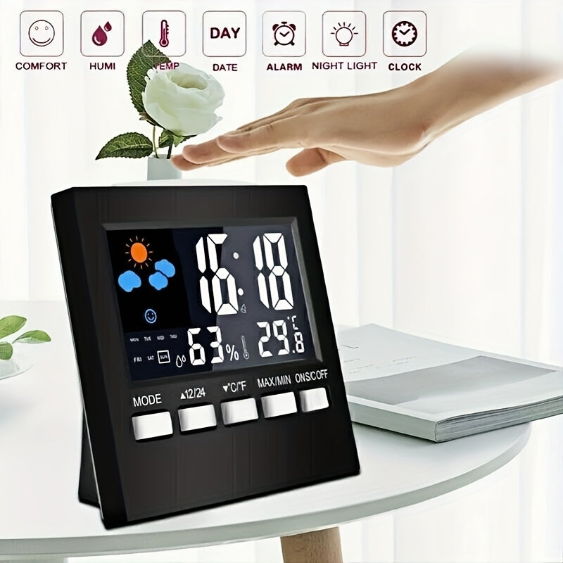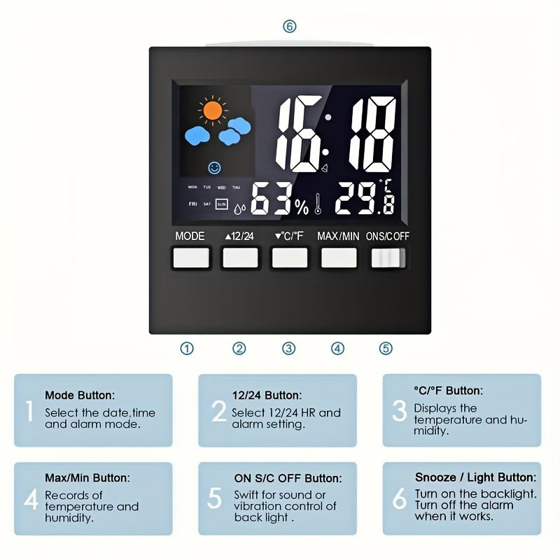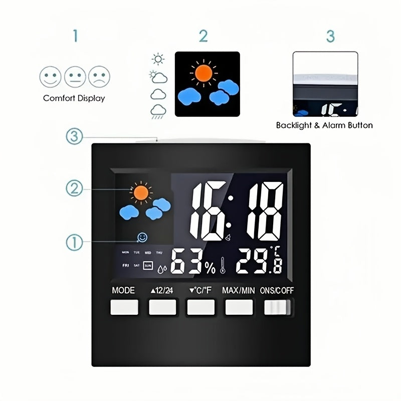 Метеостанция с ЖК-дисплеем, монитором температуры и влажности в помещении, будильником, календарем и голосовым управлением.