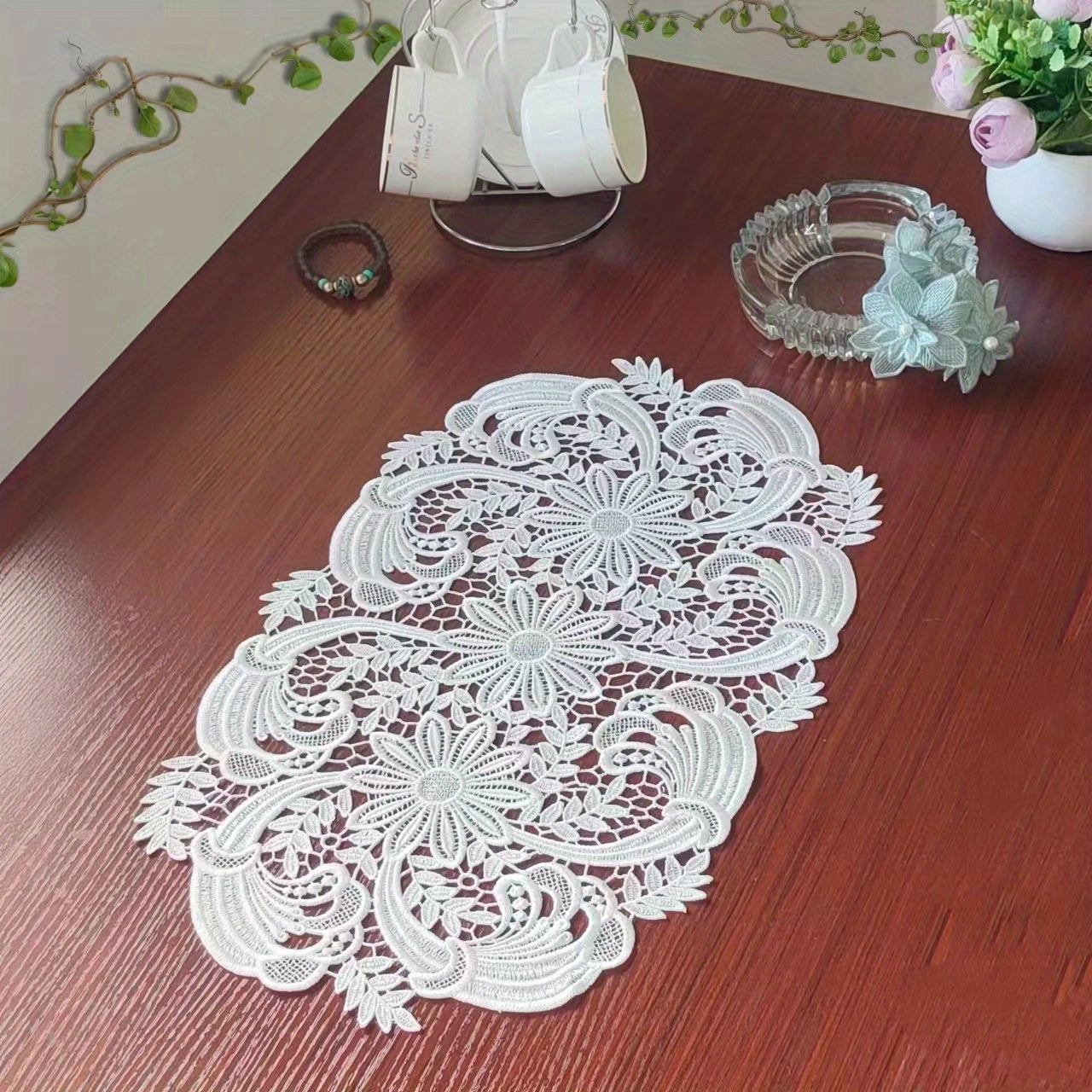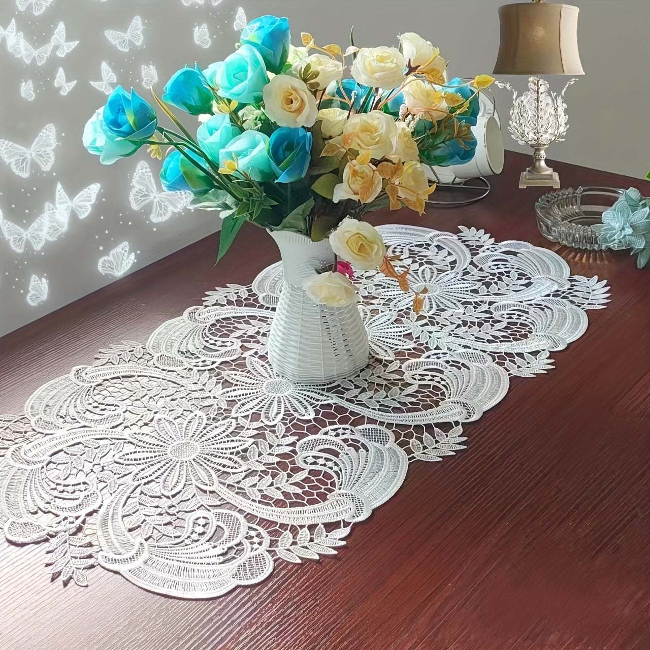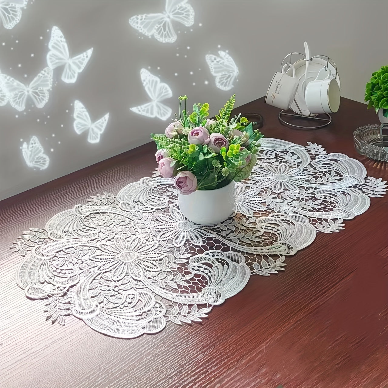 Белая бархатная кружевная овальная скатерть с цветочным узором, идеально подходящая для праздничной сервировки стола. Мотив бабочки на декоративной ткани для столового и домашнего декора.