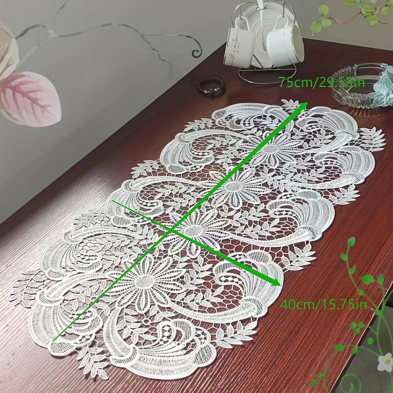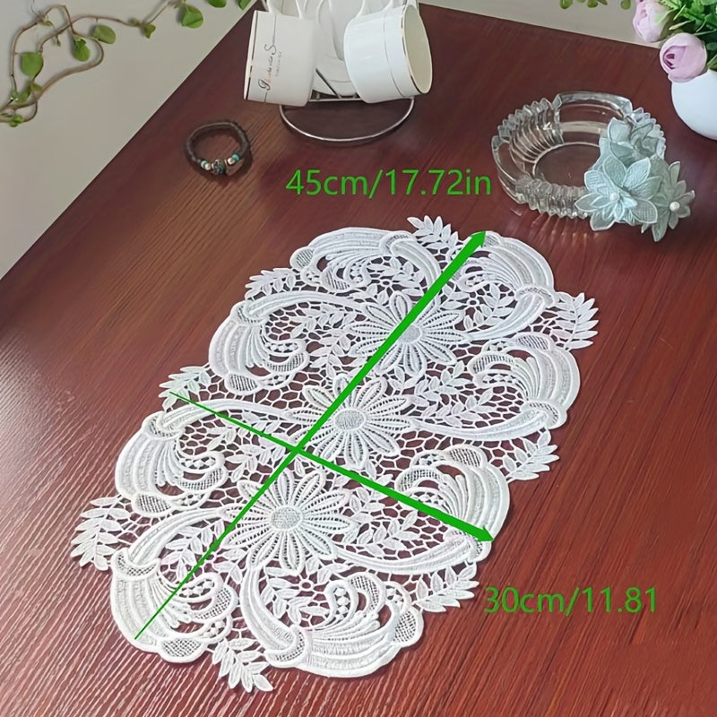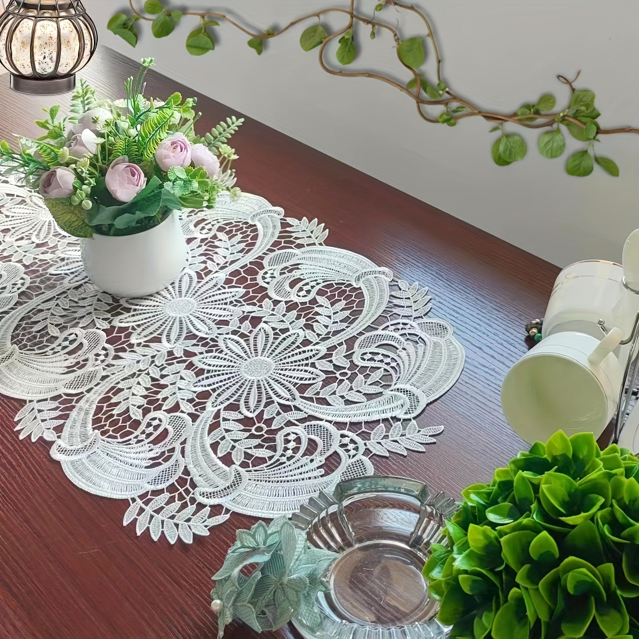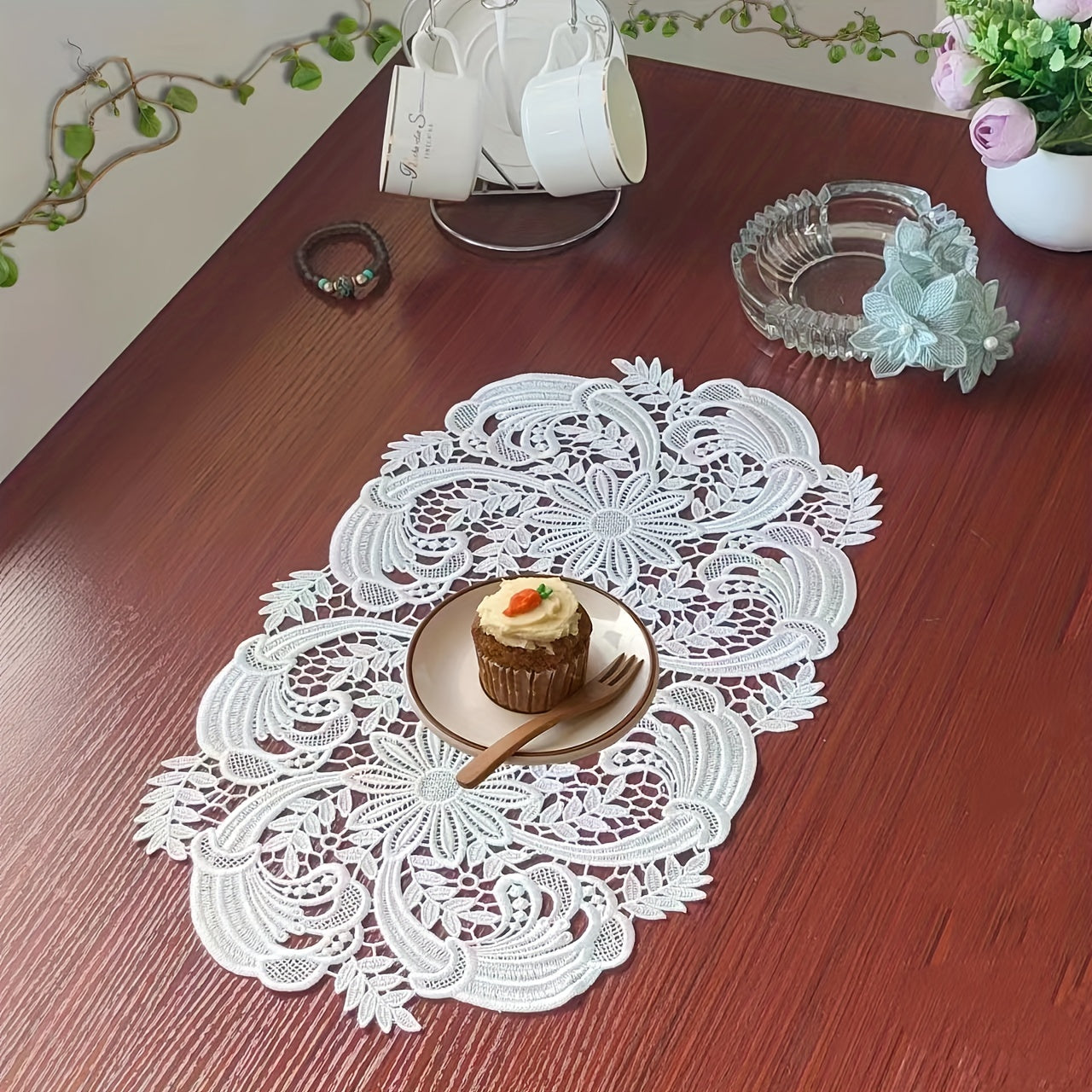 Белая бархатная кружевная овальная скатерть с цветочным узором, идеально подходящая для праздничной сервировки стола. Мотив бабочки на декоративной ткани для столового и домашнего декора.
