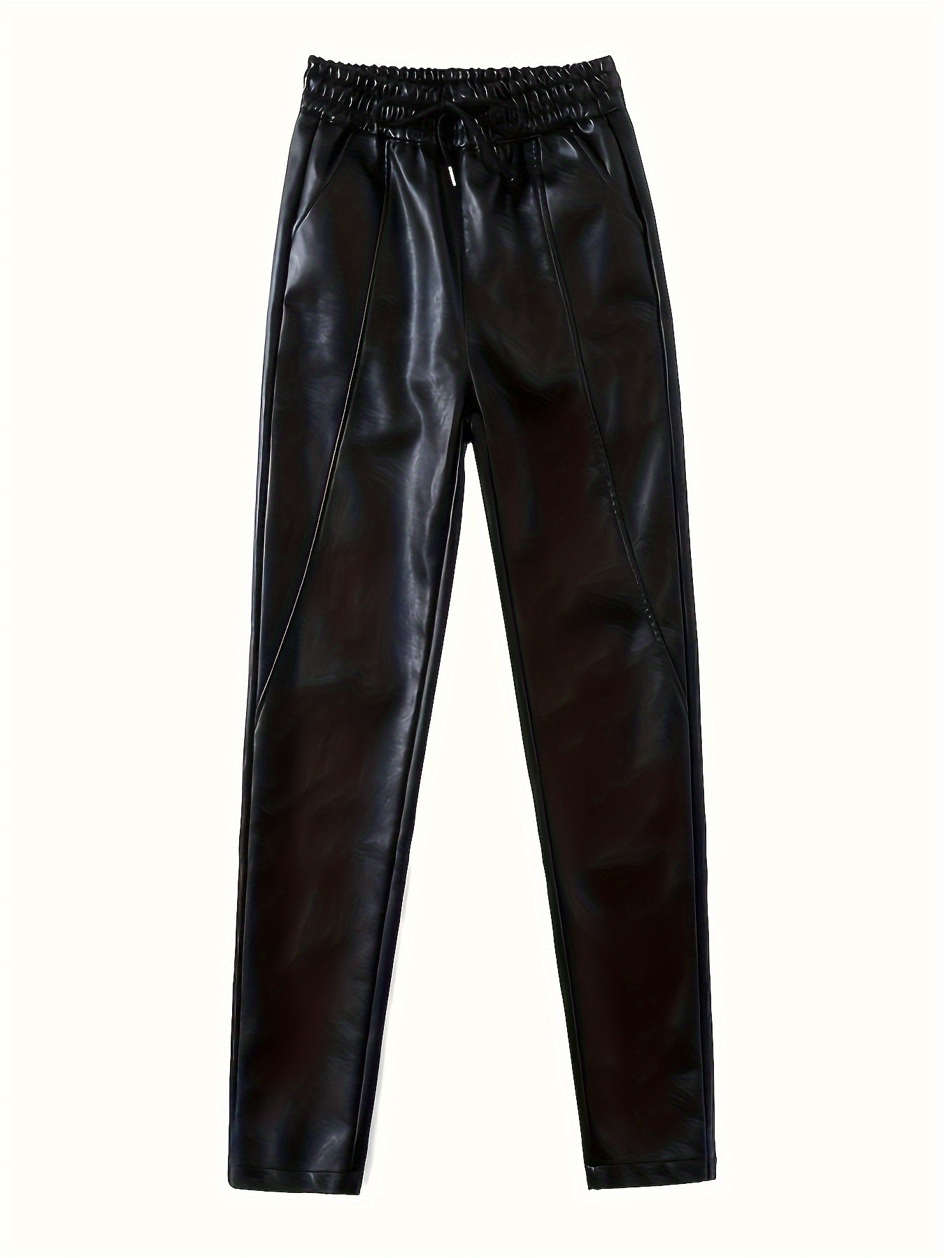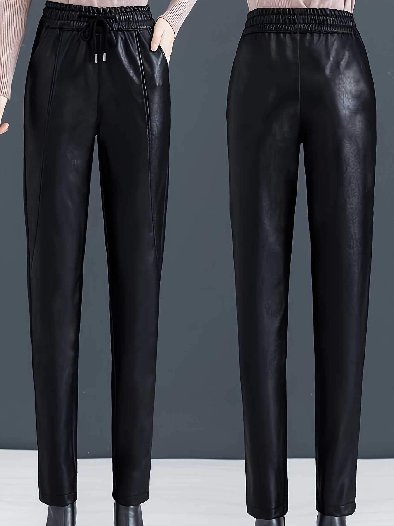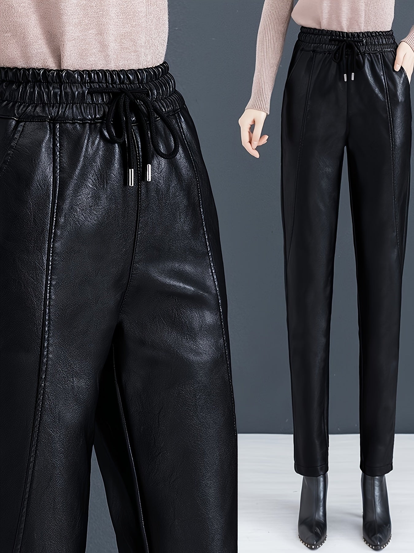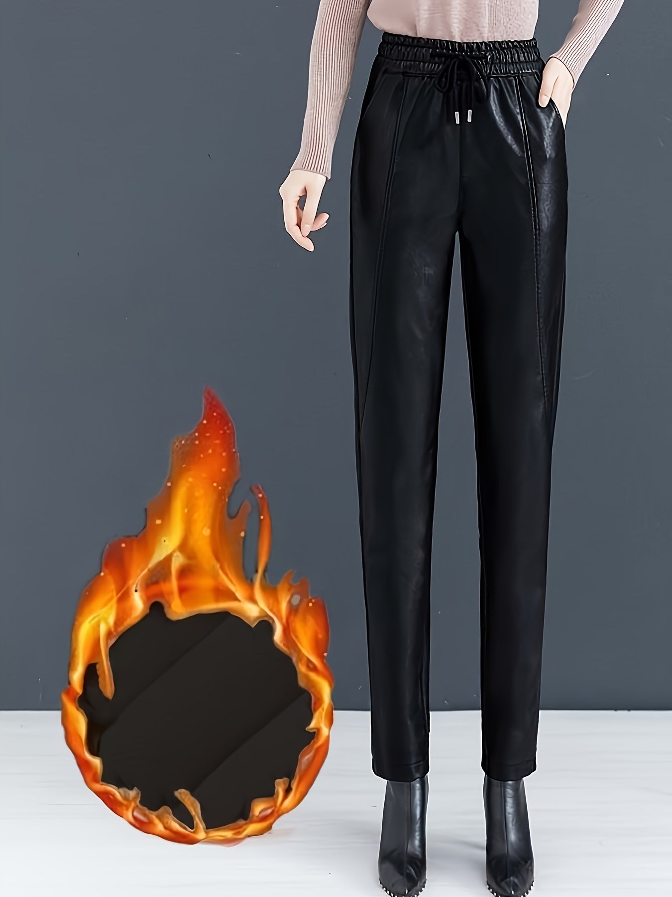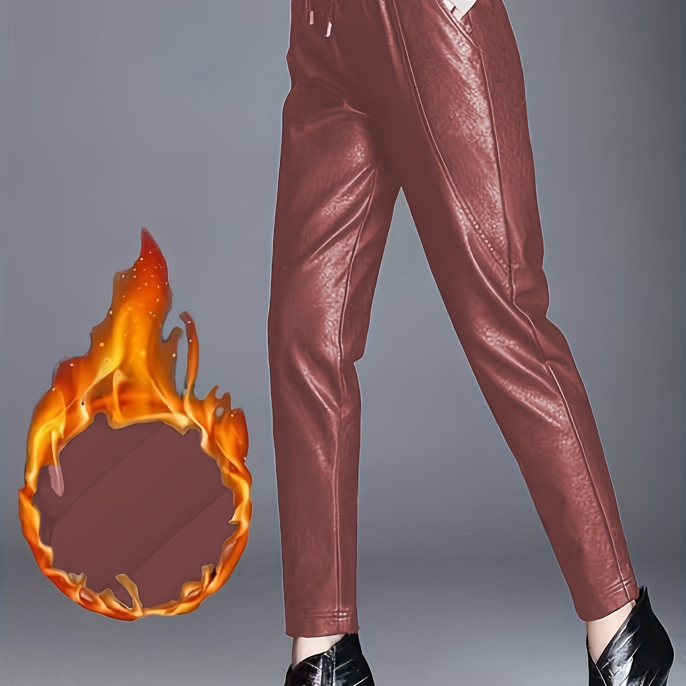 Зимние женские брюки для отдыха из искусственной кожи с флисовой подкладкой, с завязкой на талии и карманами.