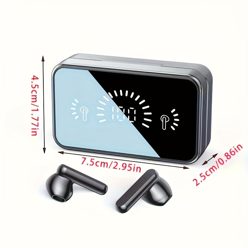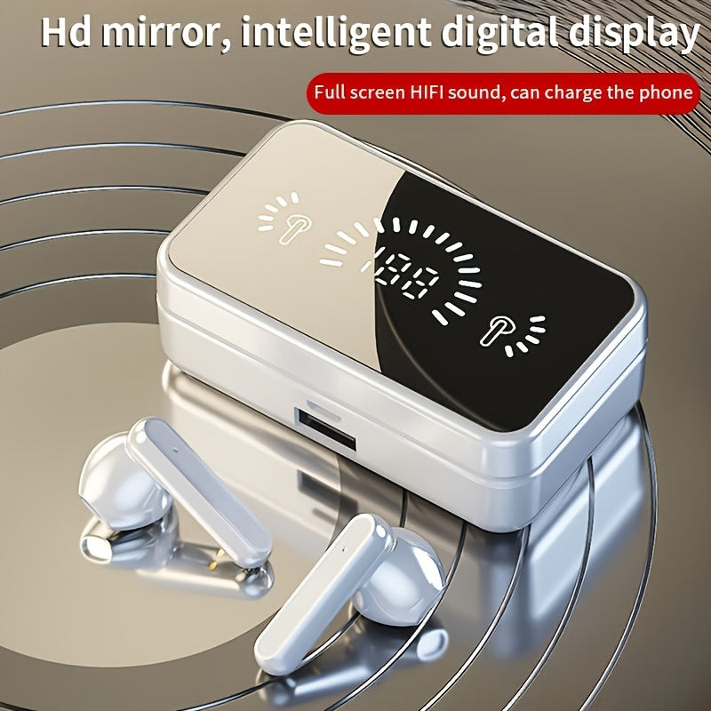 Беспроводные наушники с цифровым дисплеем, зеркальным зарядным кейсом, высоким качеством звука для спорта, игр и музыки.