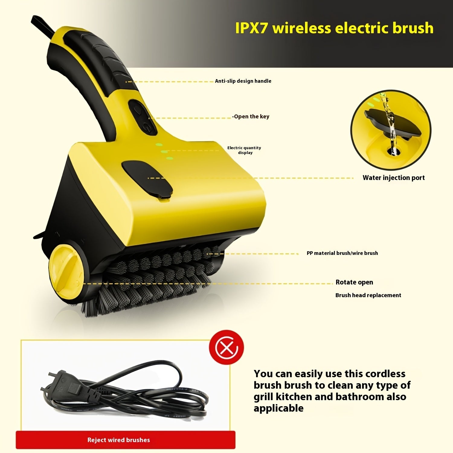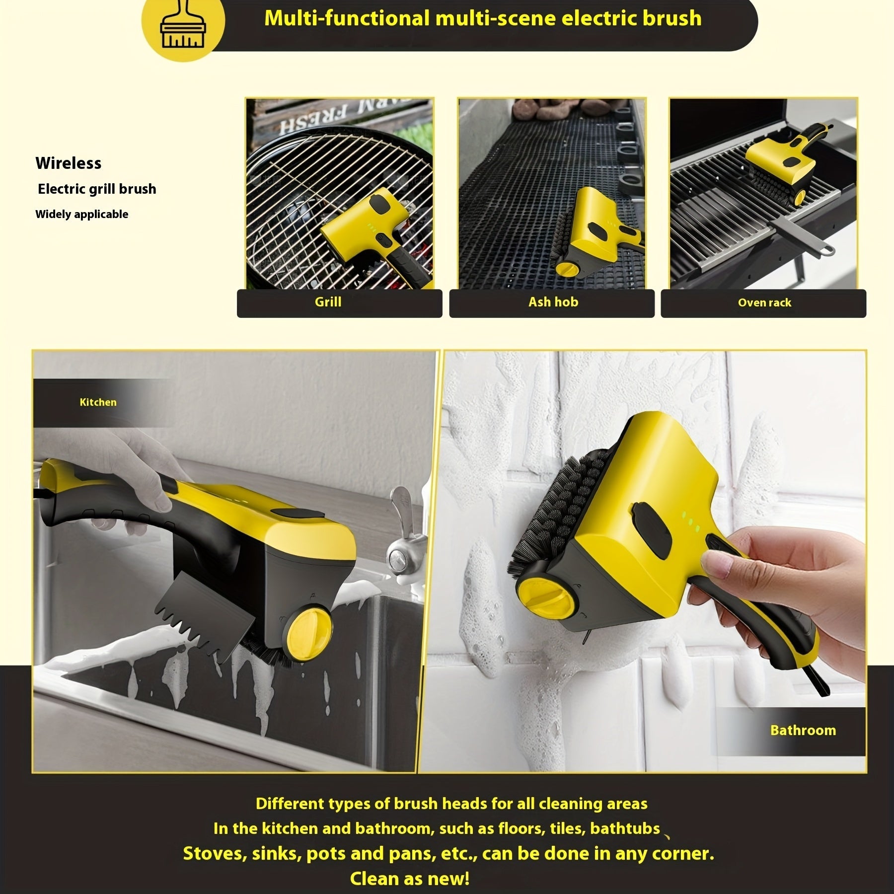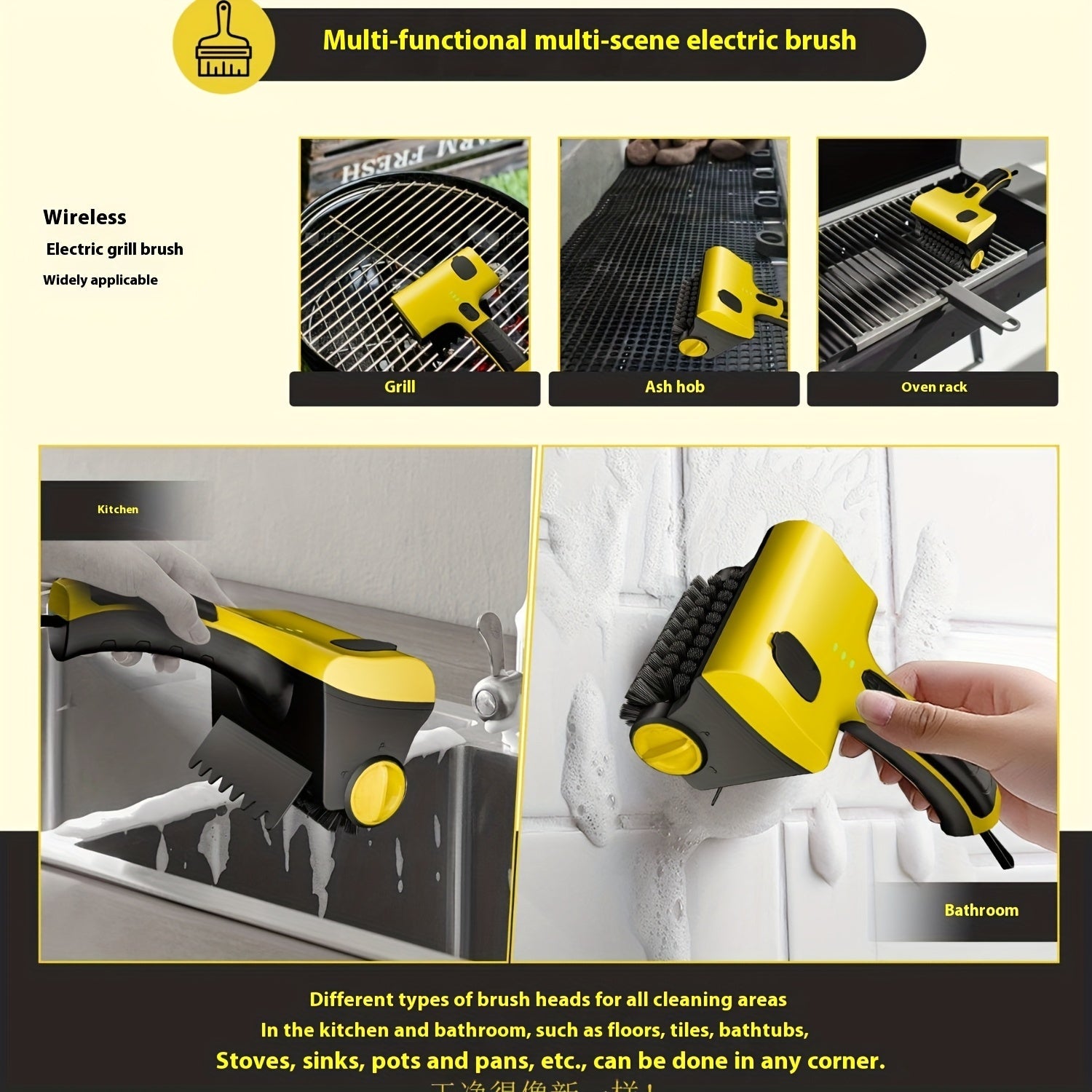 Беспроводная электрическая щетка для чистки гриля с заменяемой щеткой, подходит для чистки плитки на кухне.