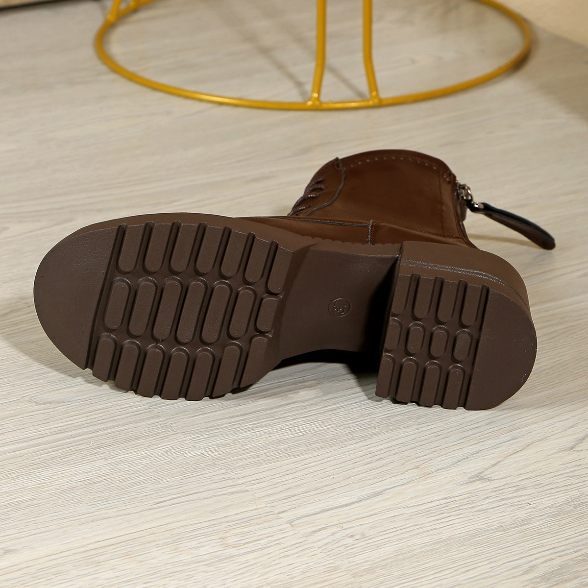 Women Chunky Platform Ankle Boots Brown Faux Leather Round Toe with Zipper