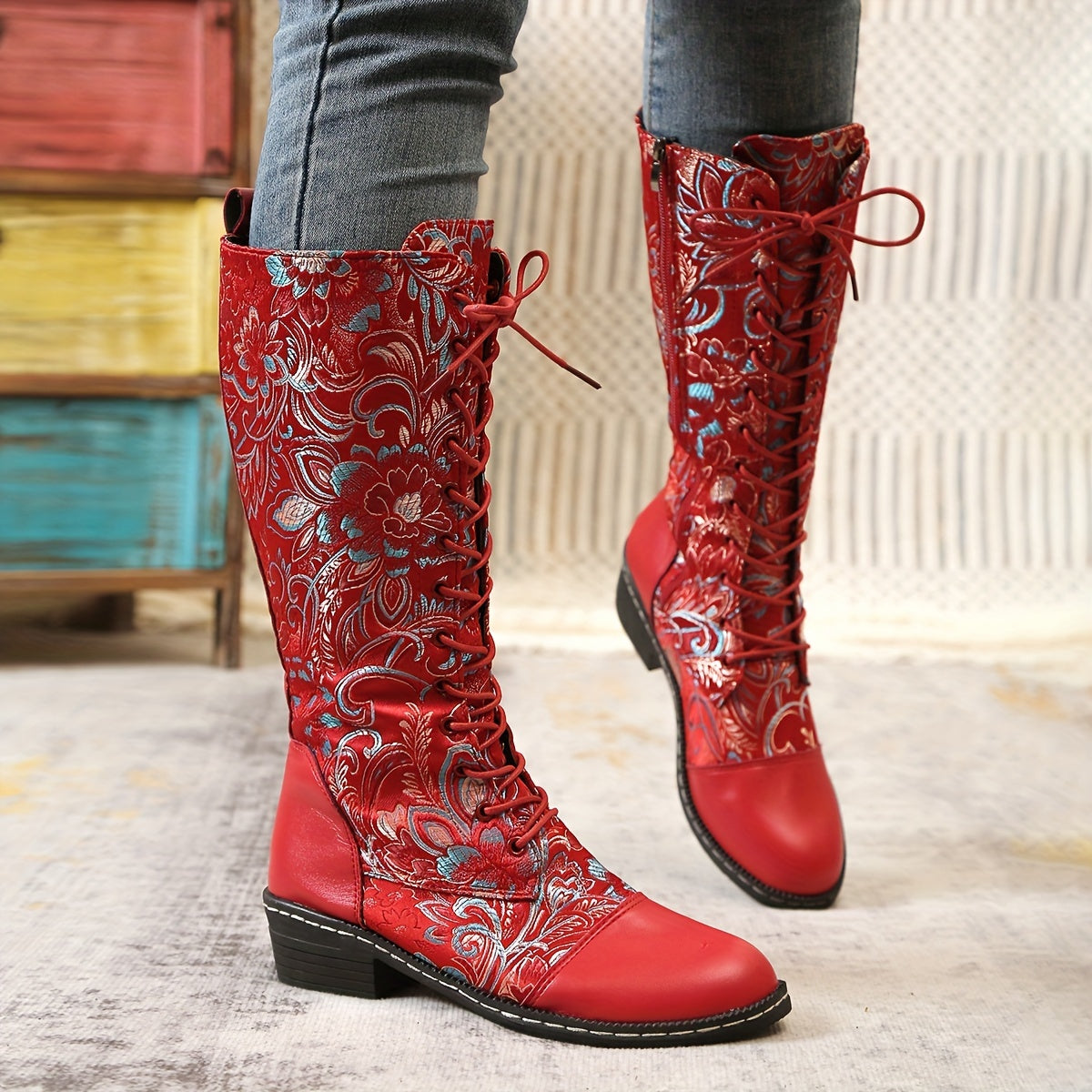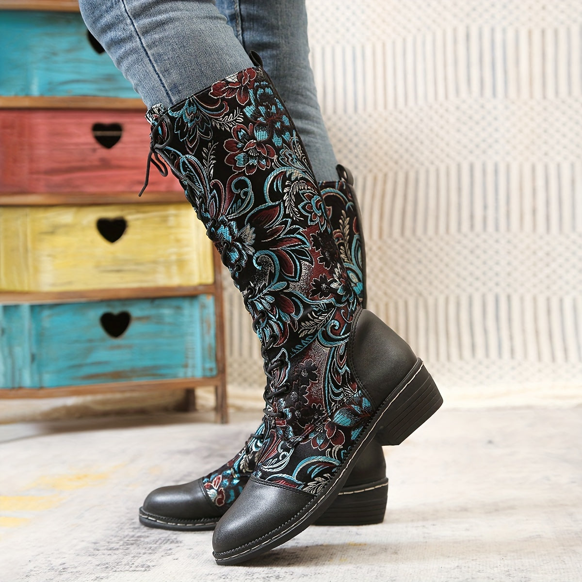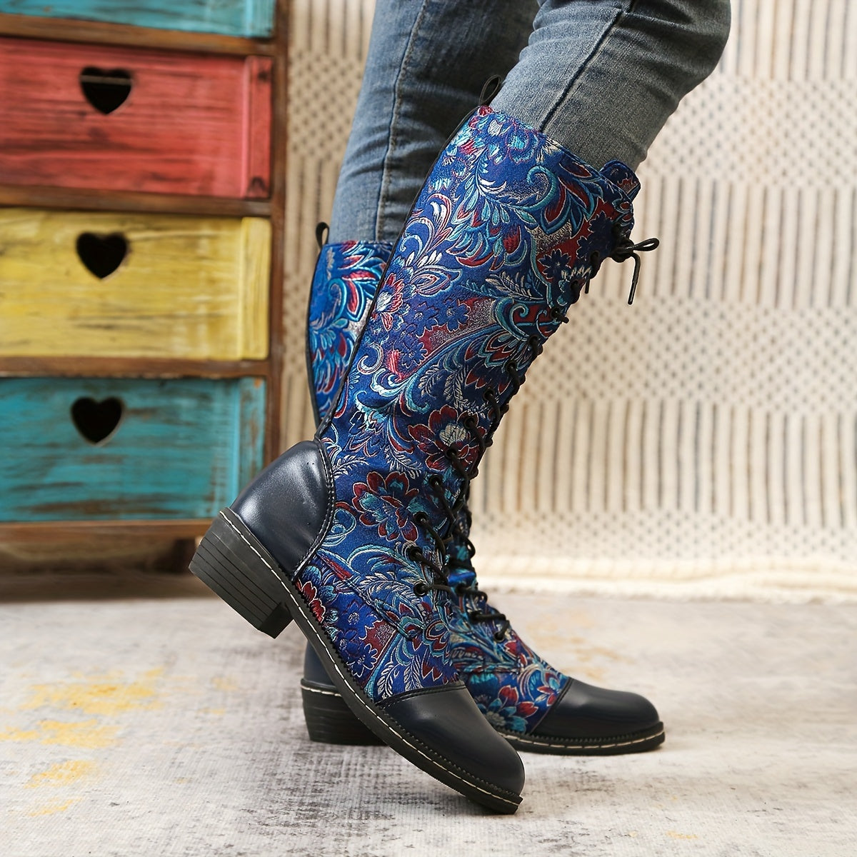 Женские ботинки с цветочным принтом до середины икры, на шнуровке и молнии, на массивном каблуке из ткани