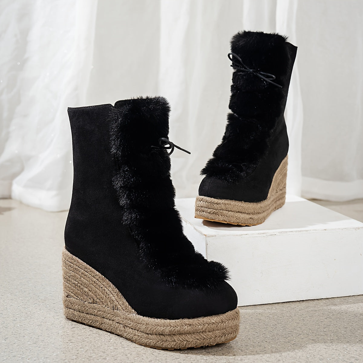 Женские льняные ботильоны на платформе с клиновидным каблуком и меховой отделкой, на молнии