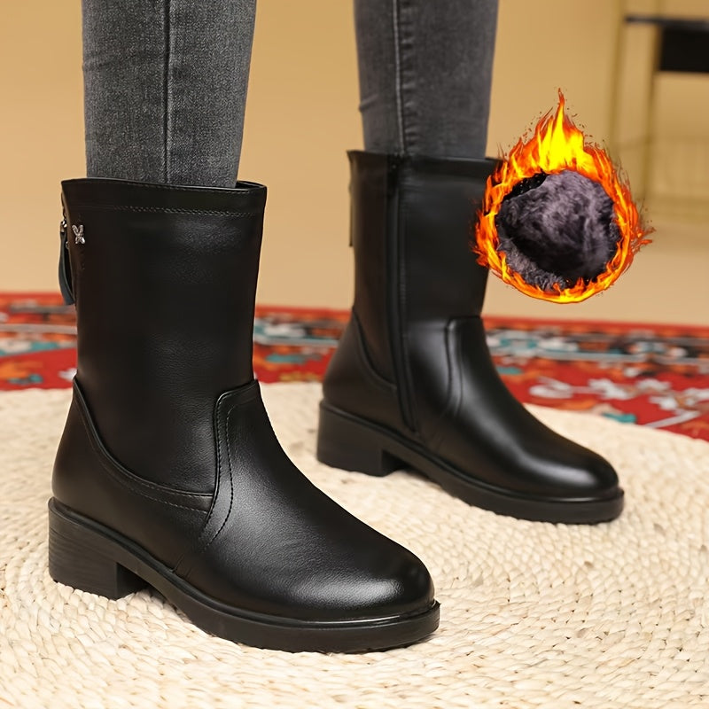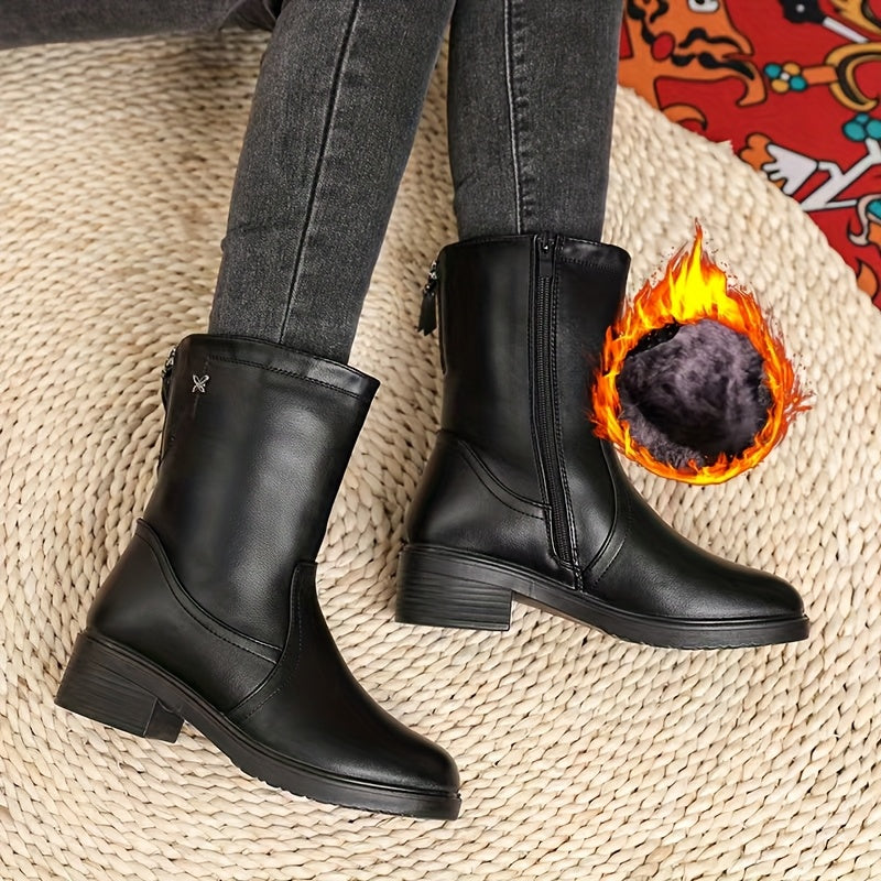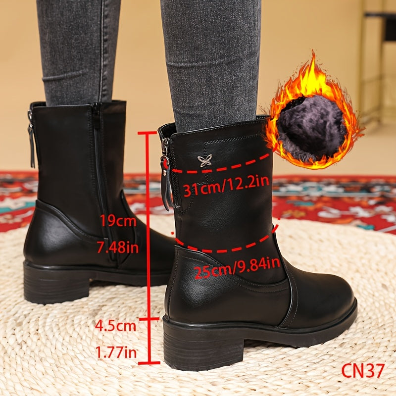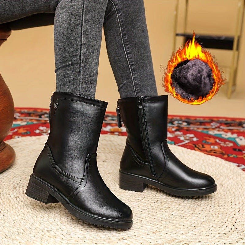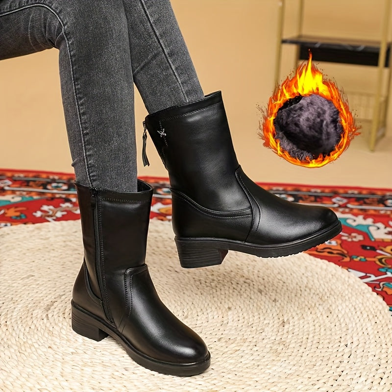 Женские черные кожаные сапоги с платформой до середины икры и застежкой-молнией