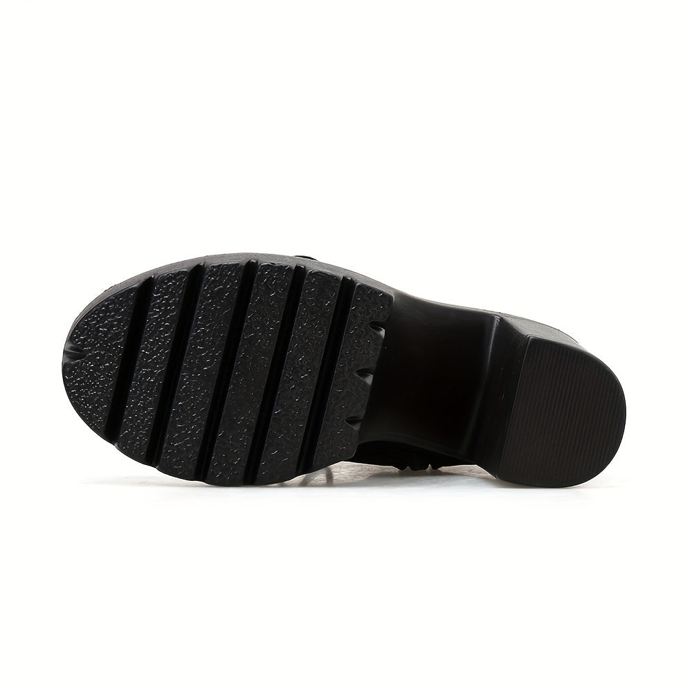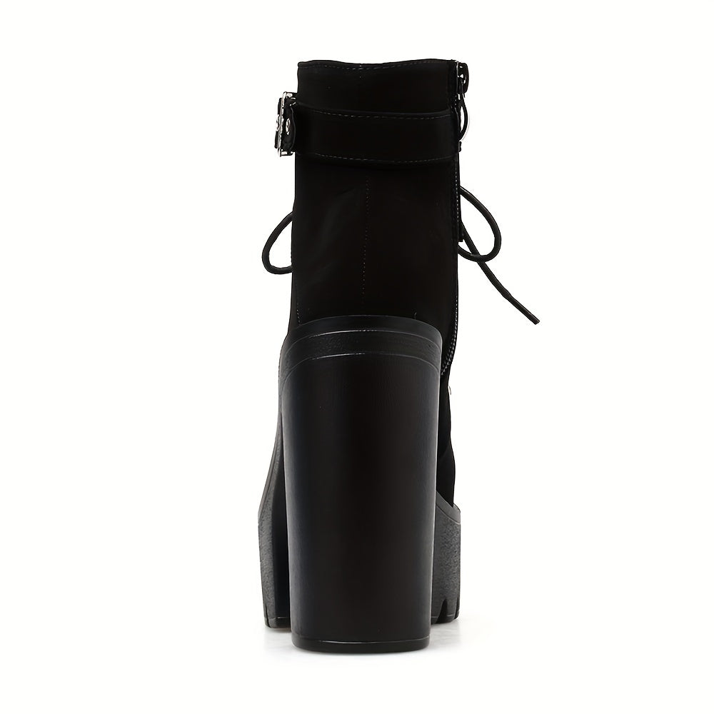 Women's Black Platform Block Heel Ankle Boots, Lace Up Buckle Strap, Fashion Party Motorcycle Style