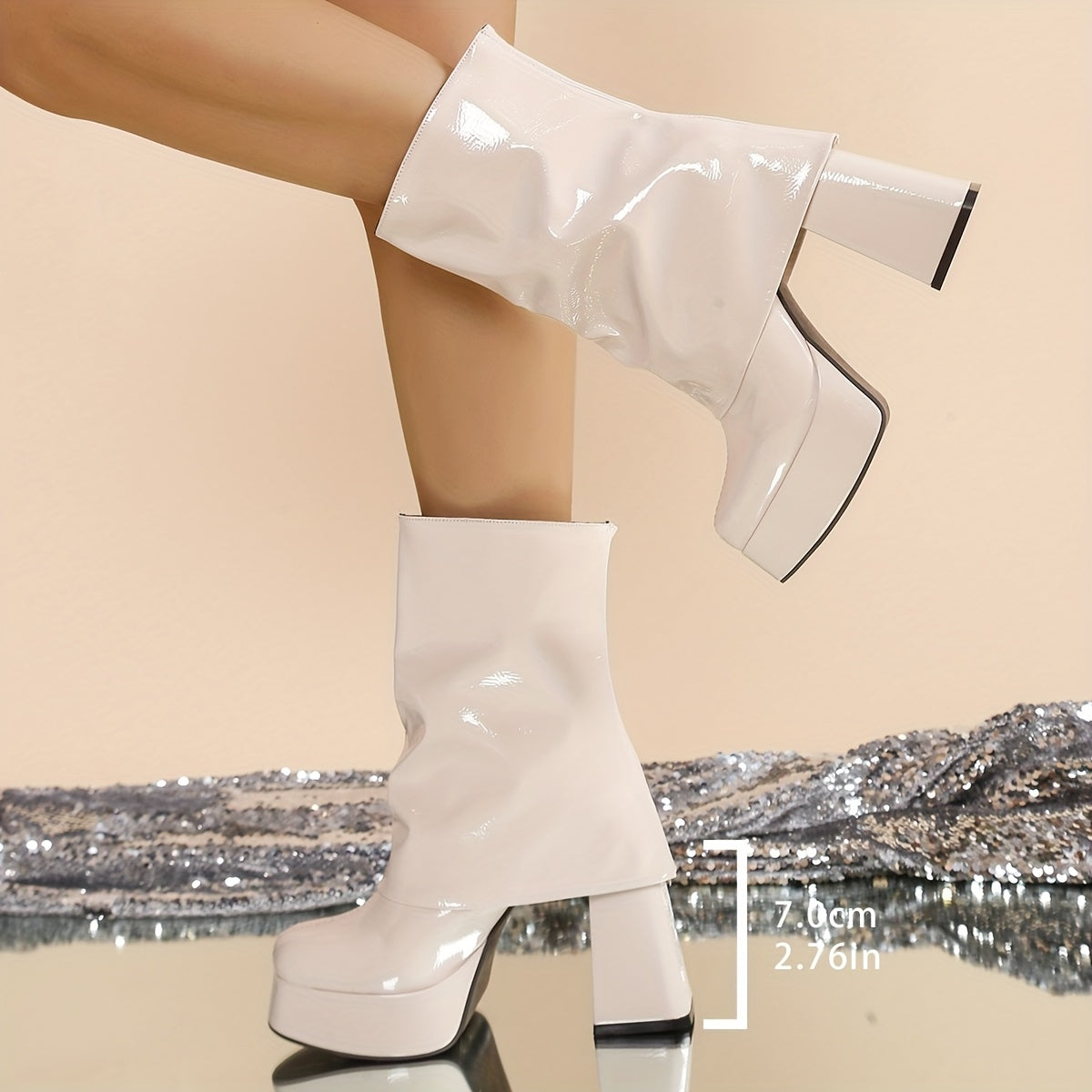Женские черные кожаные полусапоги до середины икры с металлическими акцентами и толстым каблуком