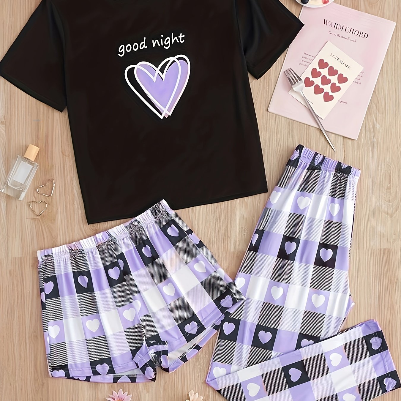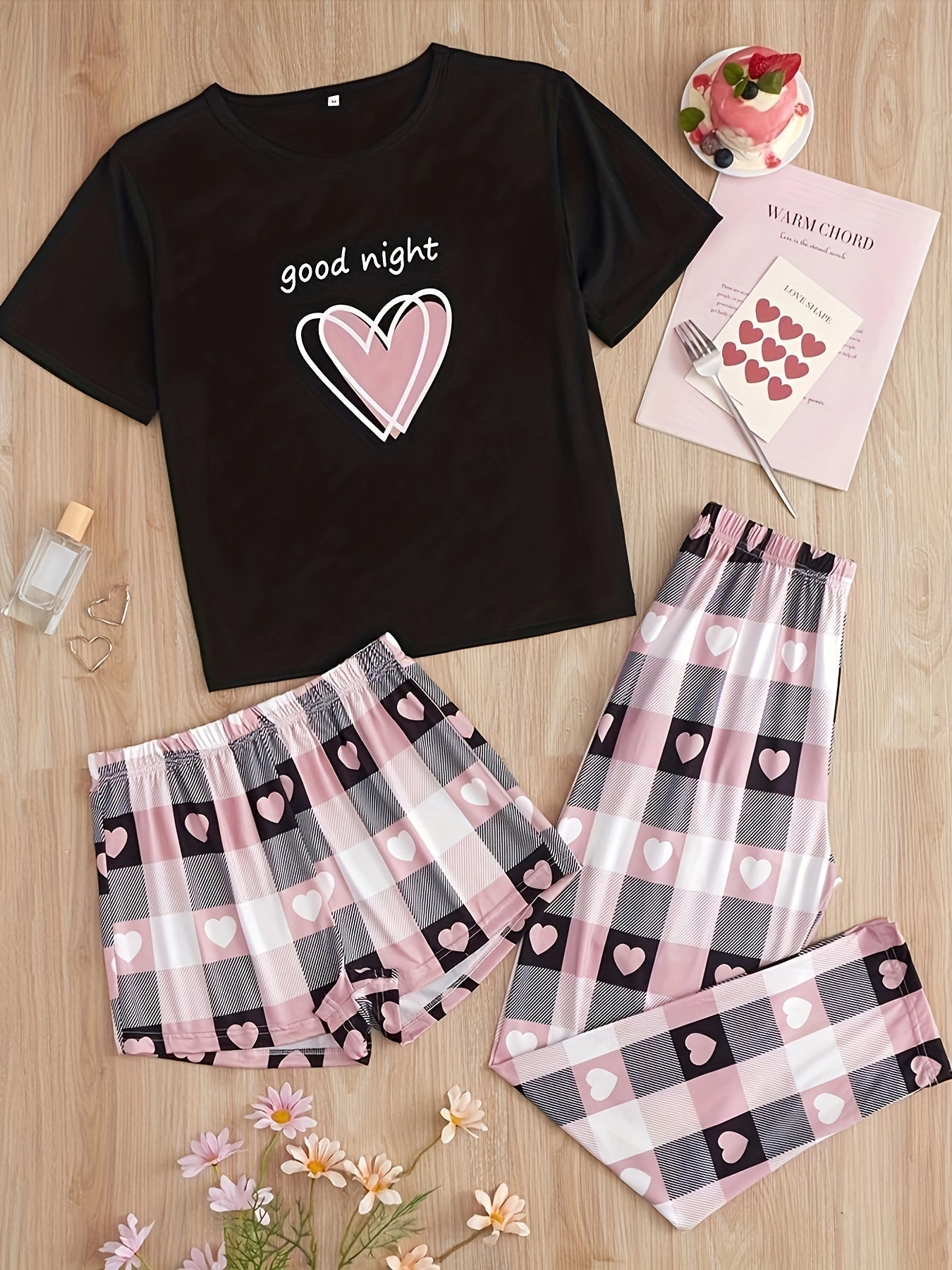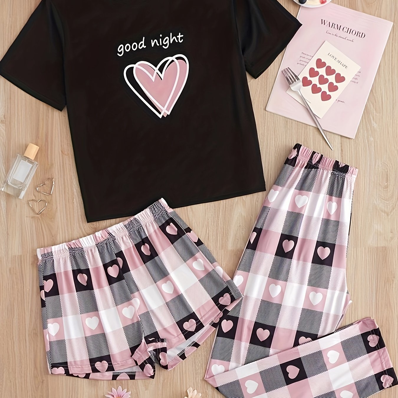 Женский повседневный комплект пижамы с сердечками и клетчатым принтом, слоганом, коротким рукавом и свободным кроем.