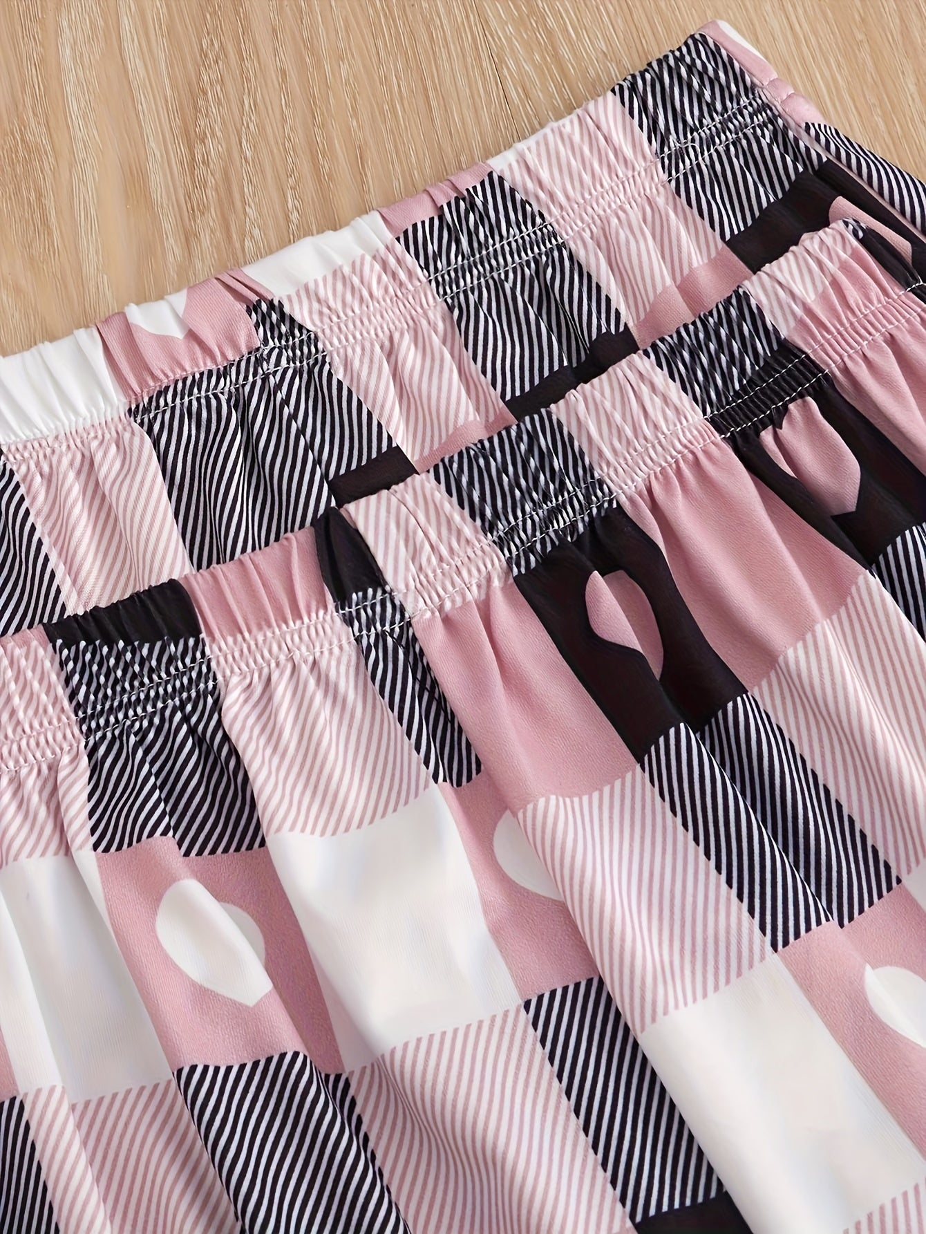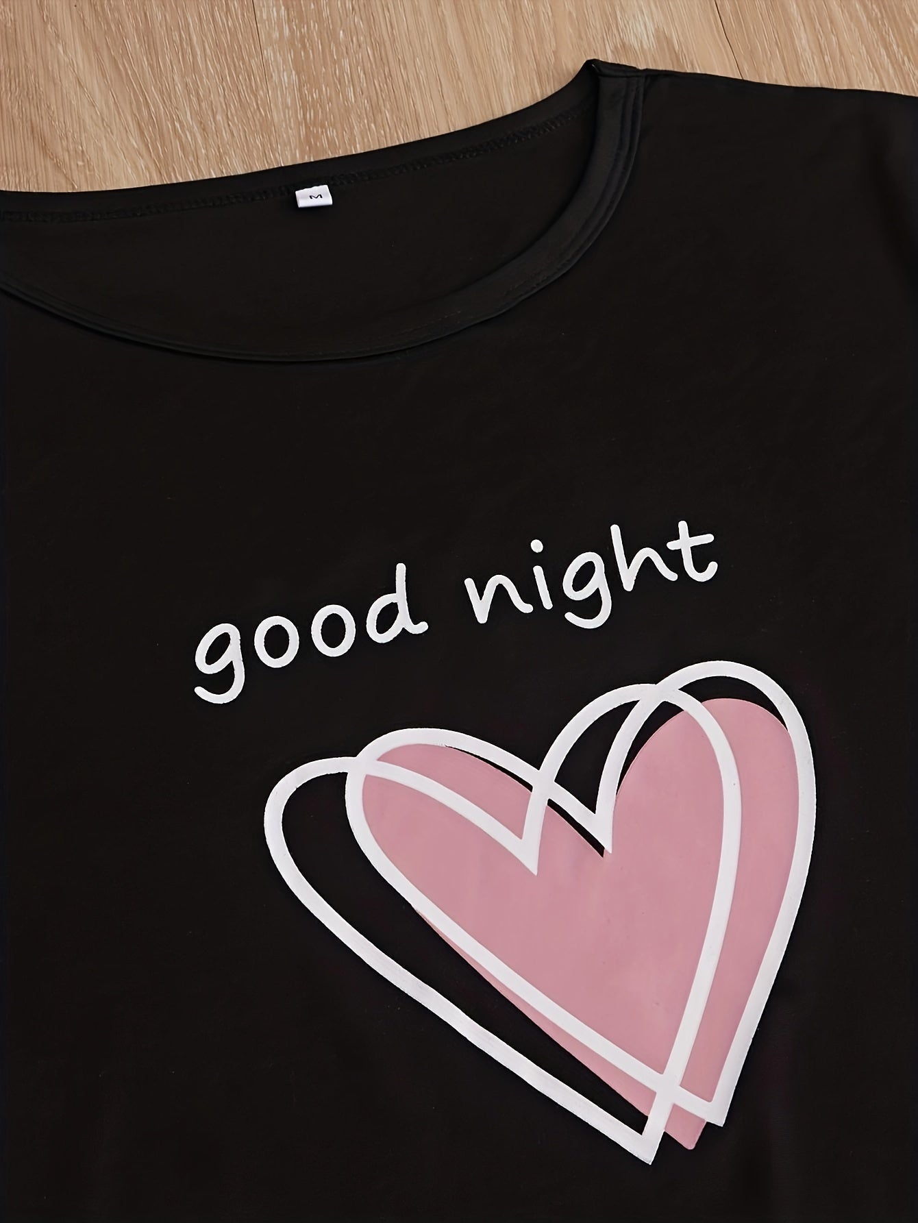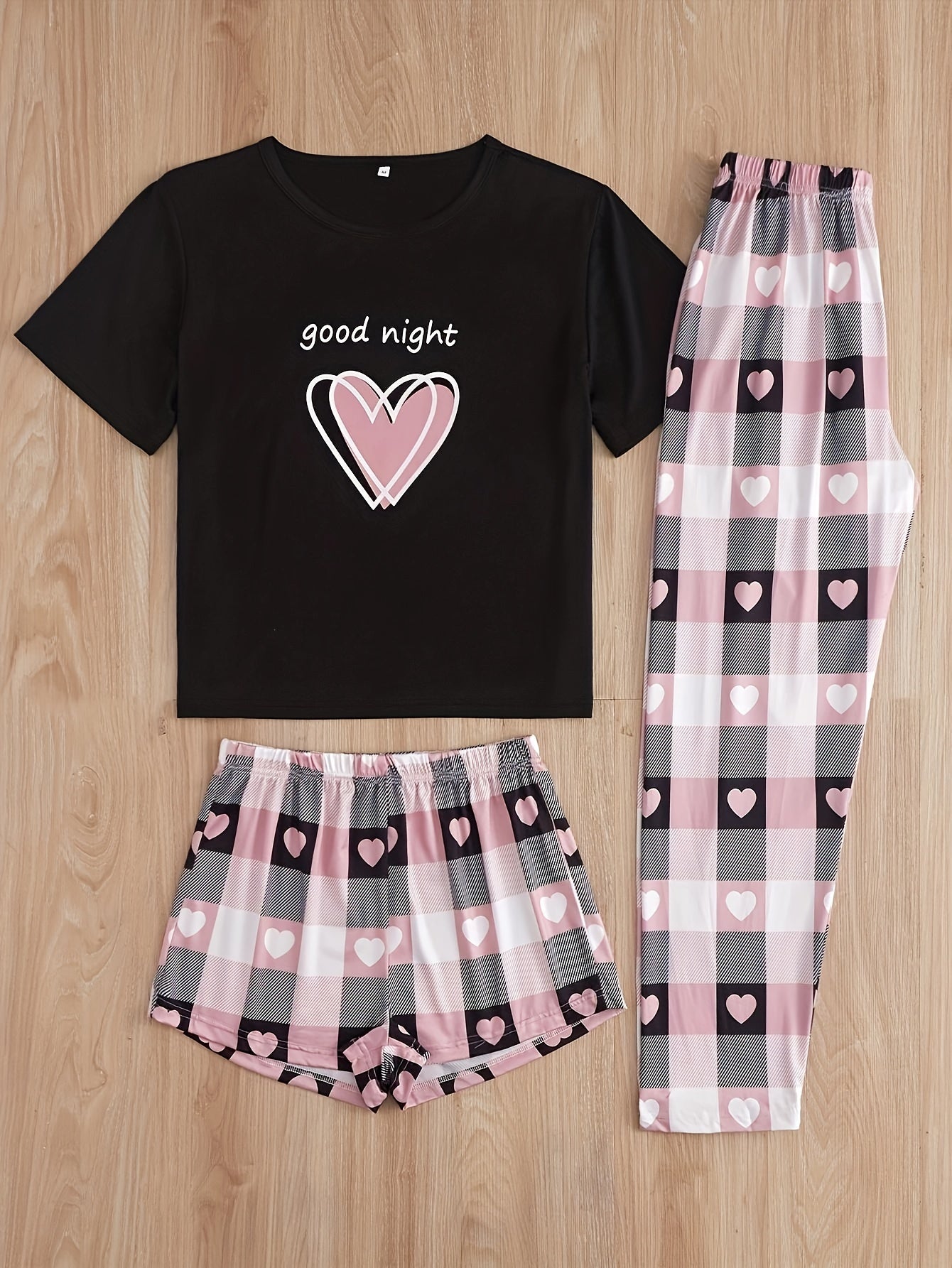 Женский повседневный комплект пижамы с сердечками и клетчатым принтом, слоганом, коротким рукавом и свободным кроем.