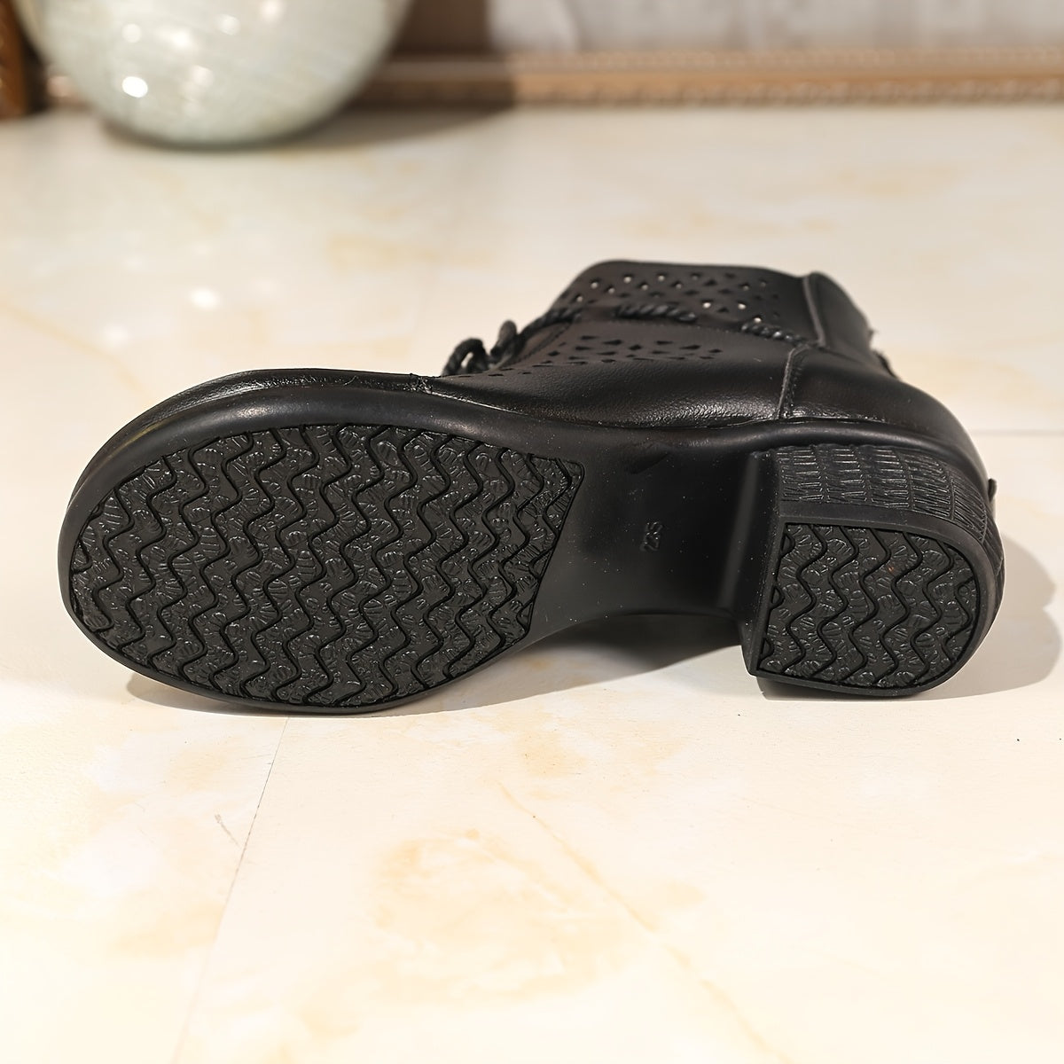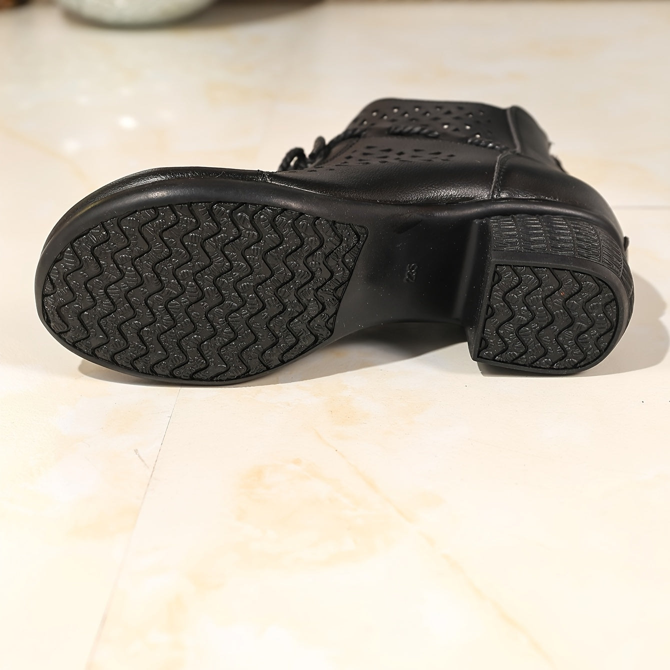Women's Ethnic Cut-Out Ankle Boots with Bow Faux Leather Chunky Heel Black
