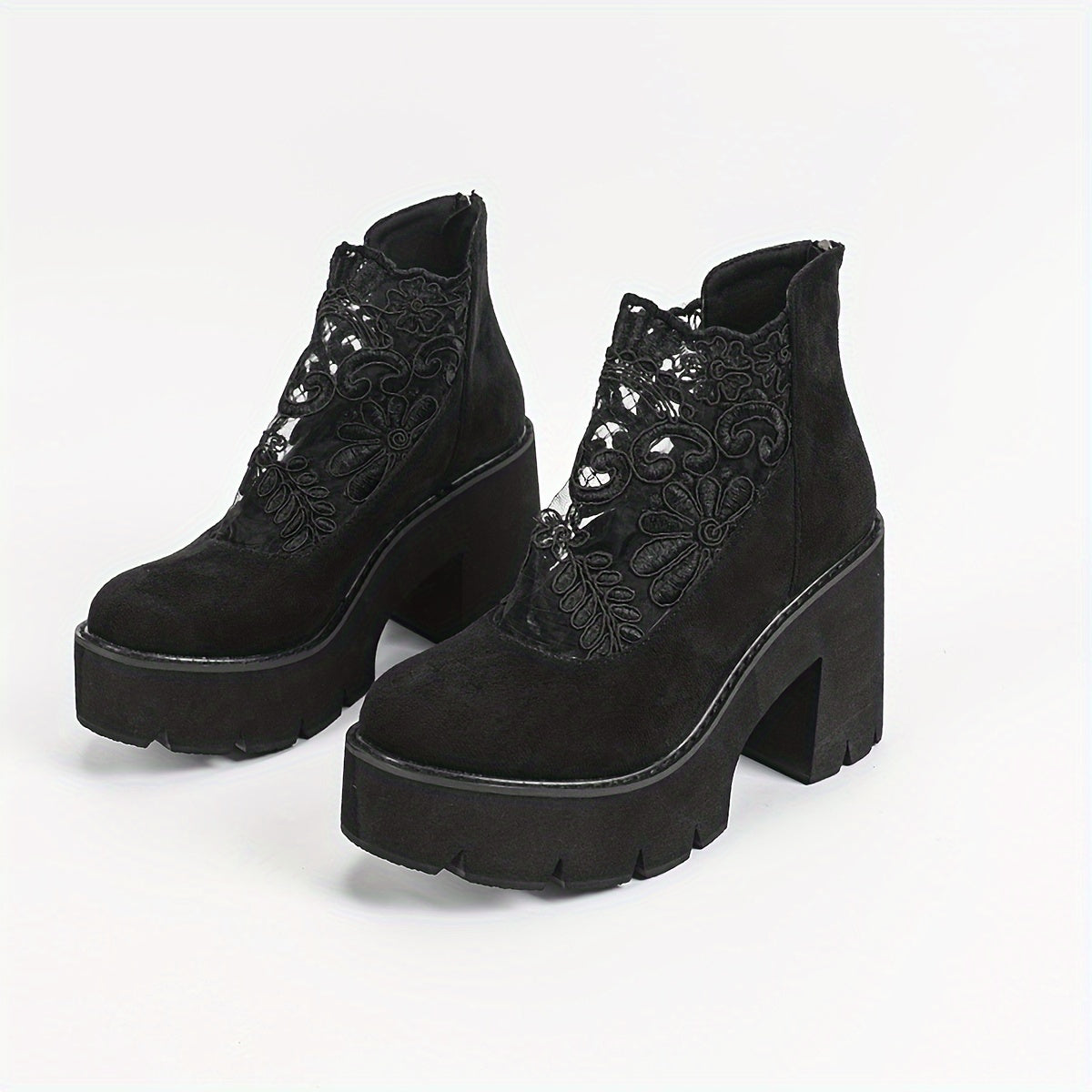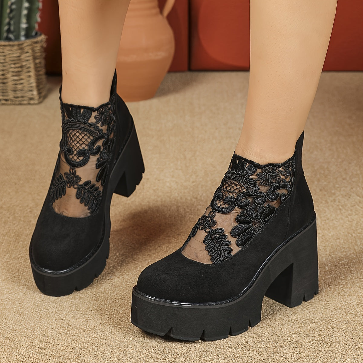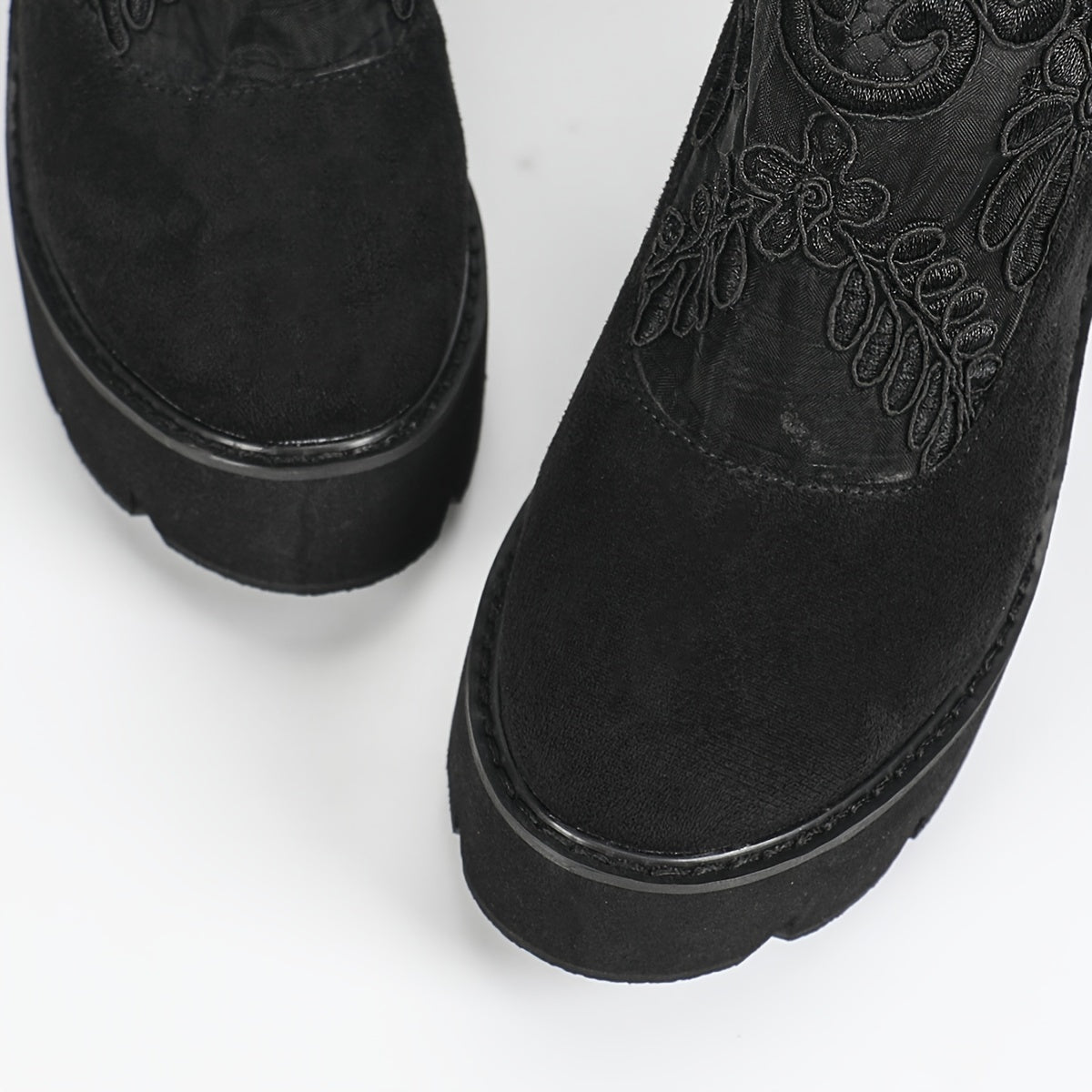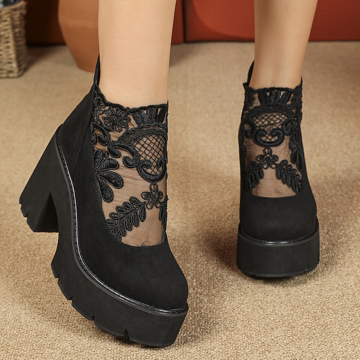 Женские ankle-ботинки с цветочной вышивкой, черной сеткой, молнией на средней голени, массивным каблуком, верхом из кордюроя, тканевой подкладкой, резиновой подошвой и бархатной стелькой.