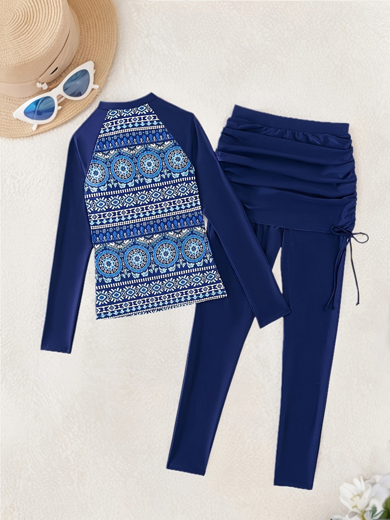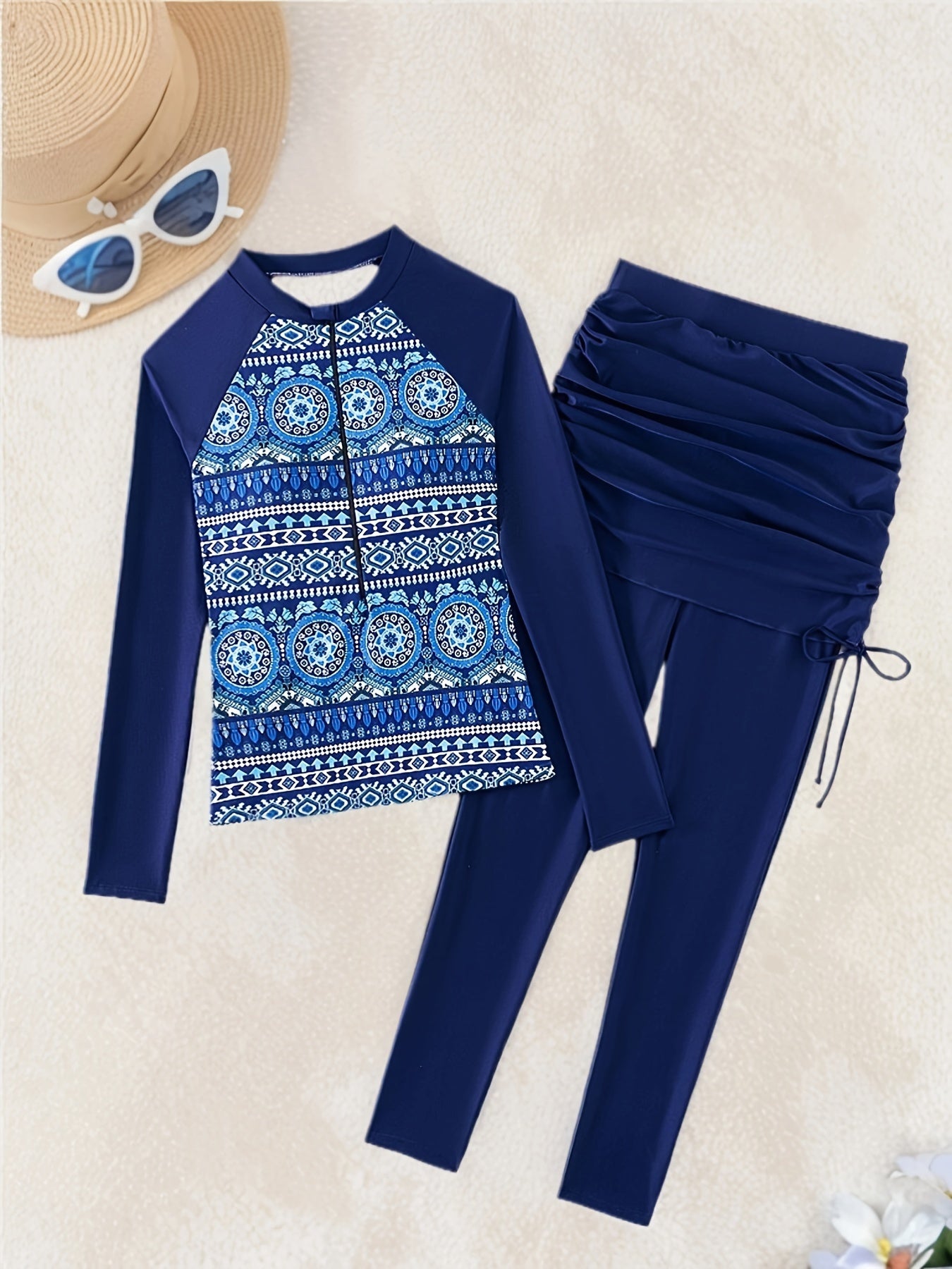 Женский купальник с высоким воротником, молнией и этническим принтом, включает длинные брюки. Купальная одежда и одежда.
