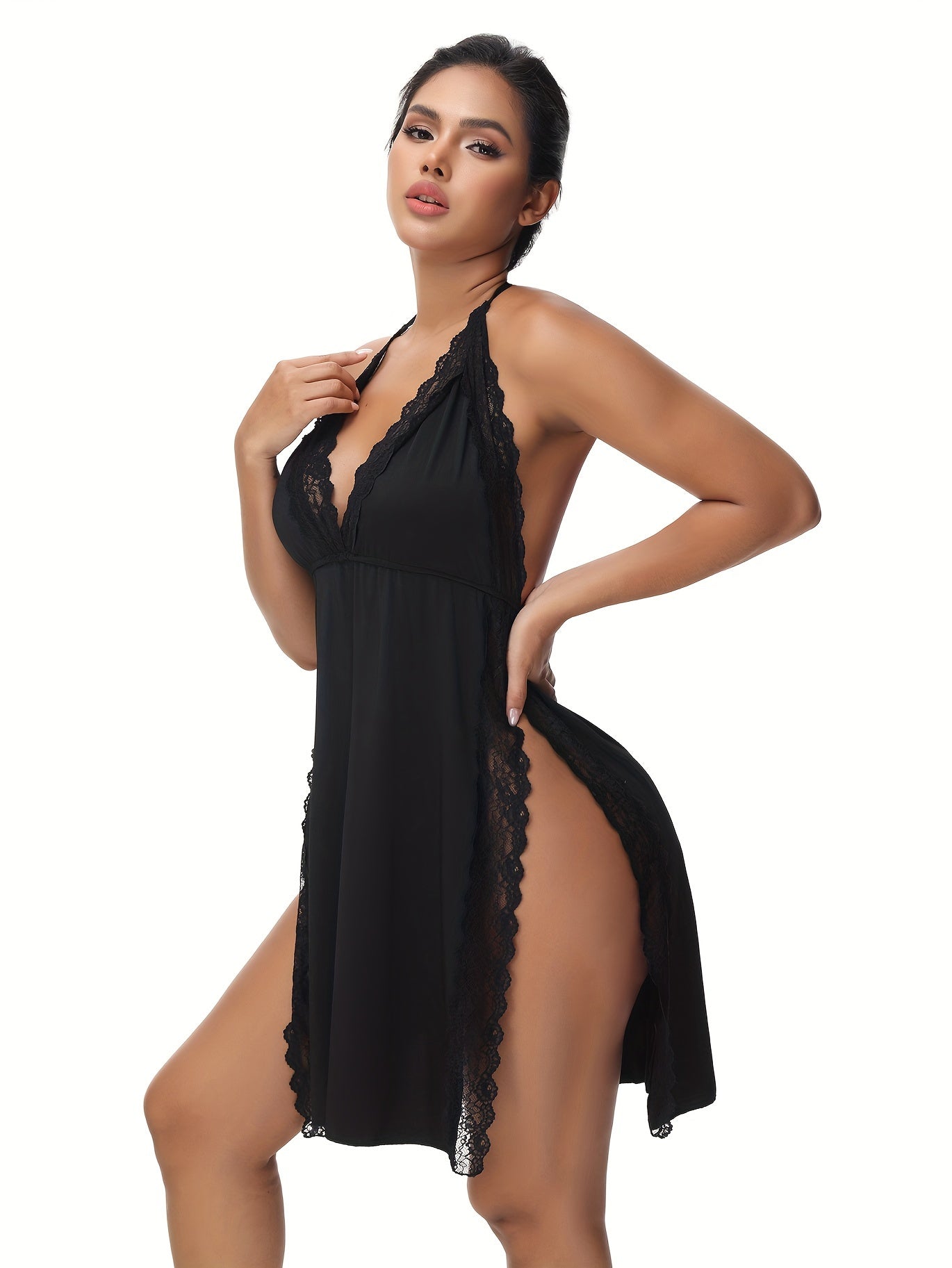 Женские кружевные пижамы без спинки с разрезом на бедре, с V-образным вырезом, домашний костюм из спандекс-ткани