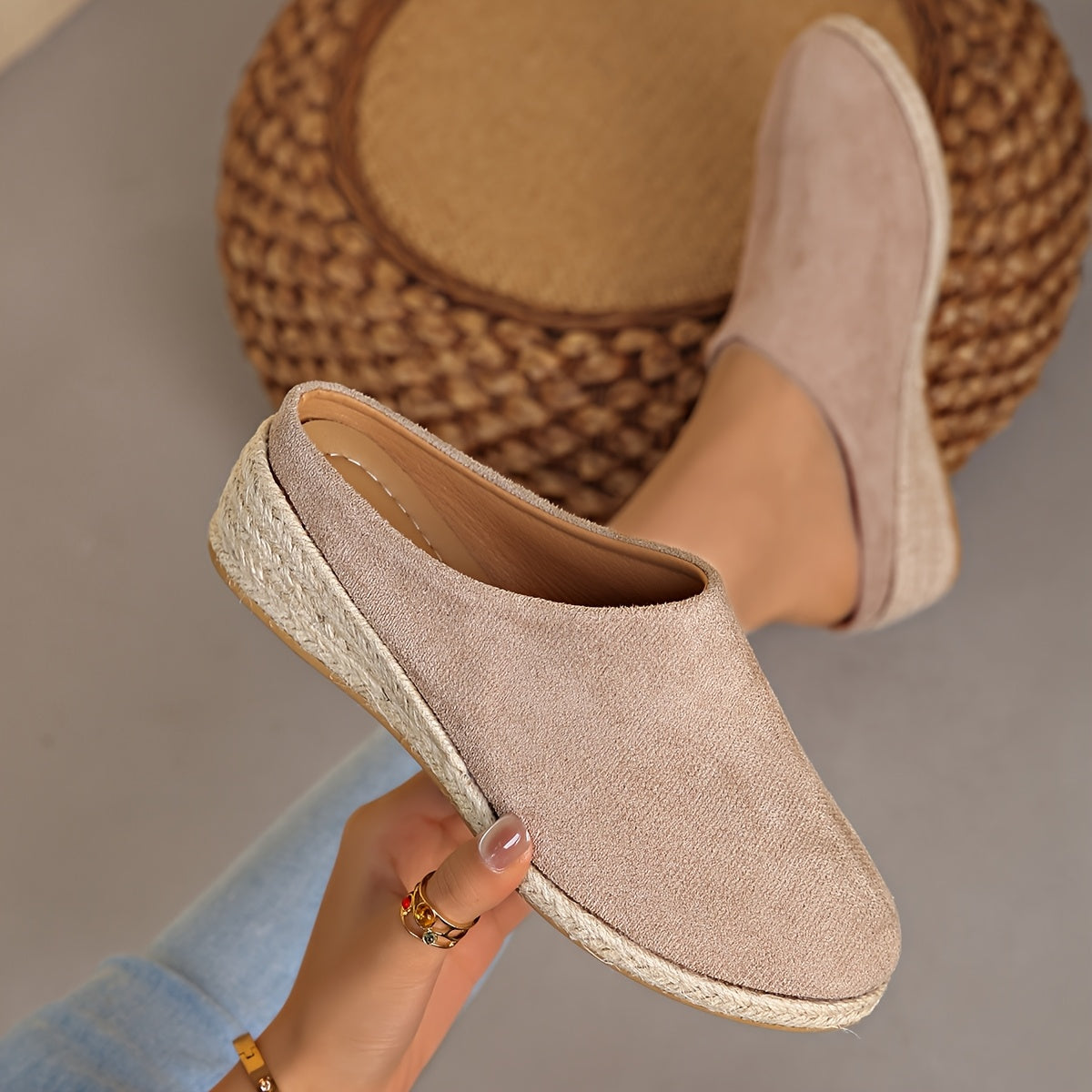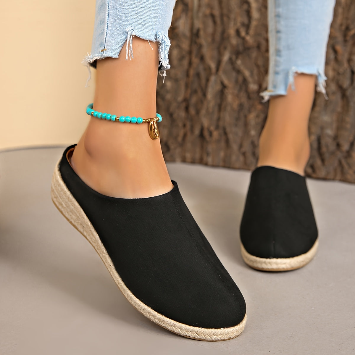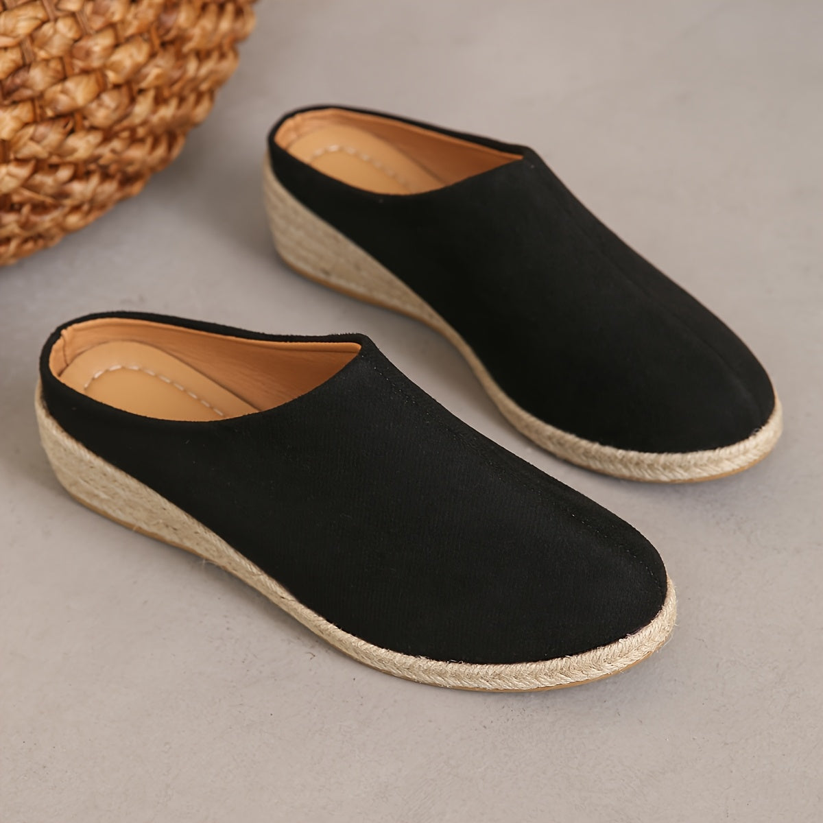 Женские льняные слипоны на среднем каблуке с джутовой подошвой черный бежевый